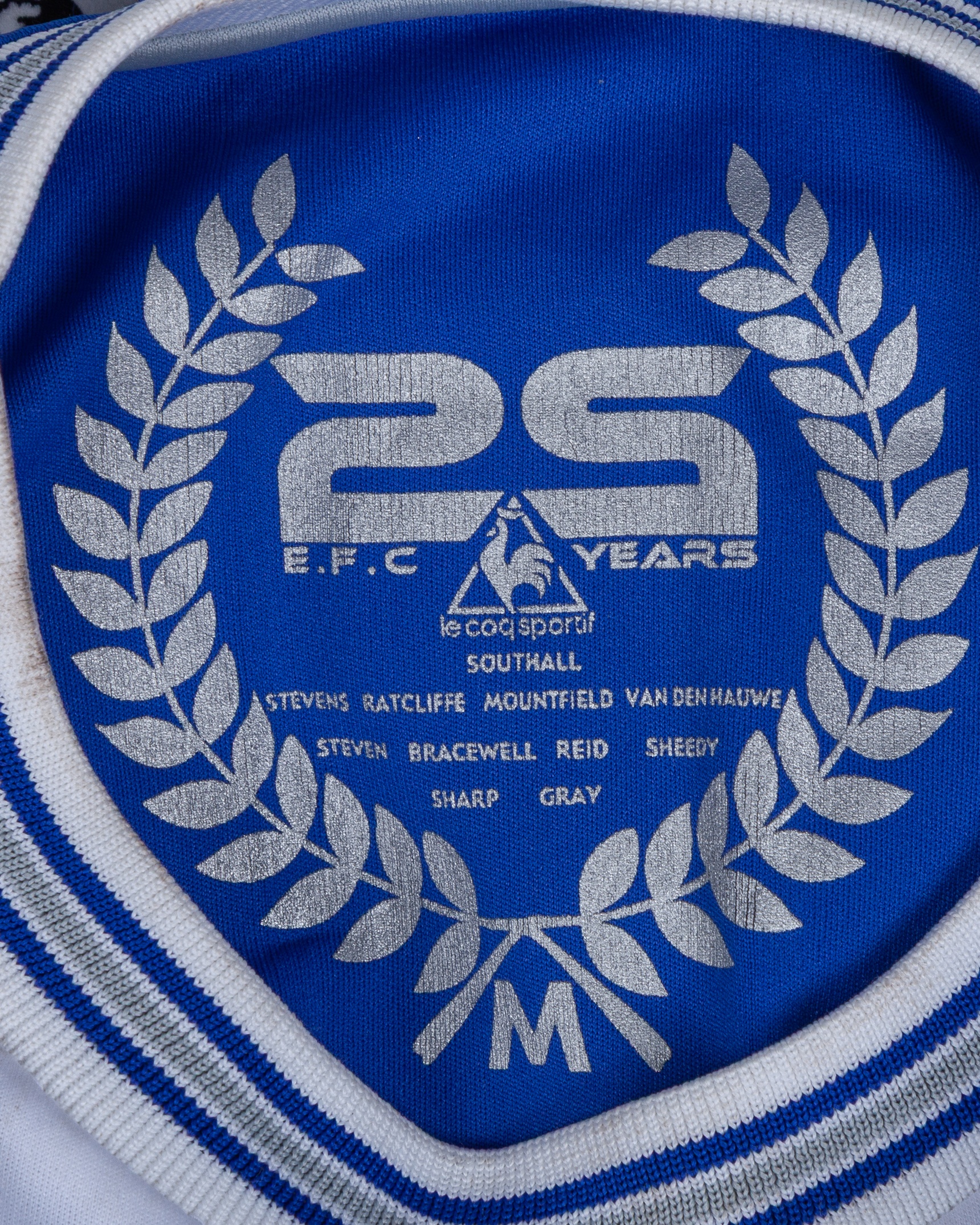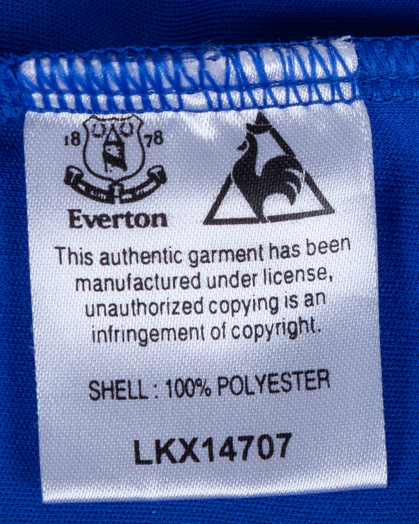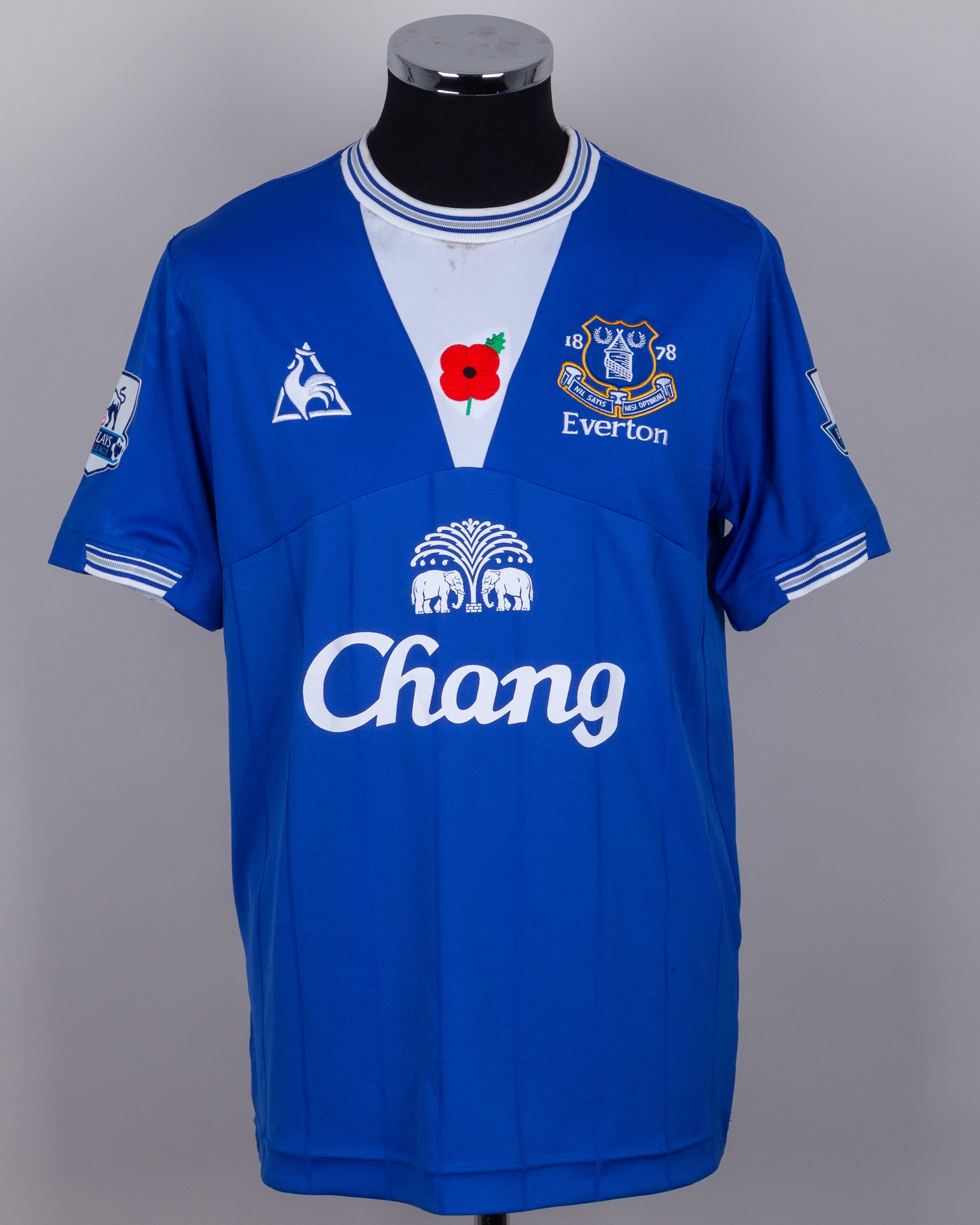 Hope Akpan blue and white No.39 Everton v. West Ham United match issued short-sleeved shirt, 2009, Le Coq Sportif, M, with crew-neck collar and embroidered badge inscribed 1878 EVERTON, with embroidered Poppy badge, the reverse lettered AKPAN, the sleeves with Barclays Premier League flashes, staining