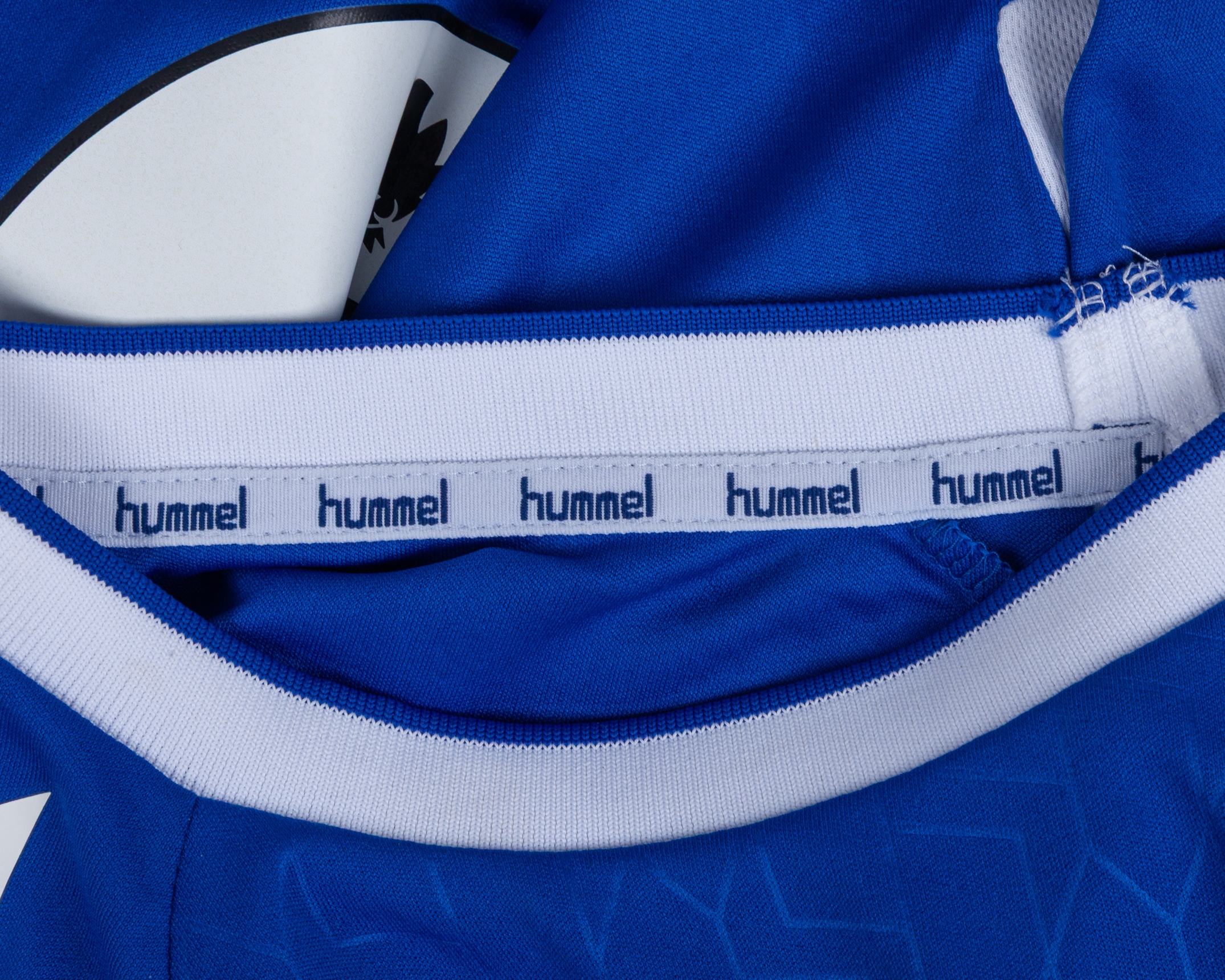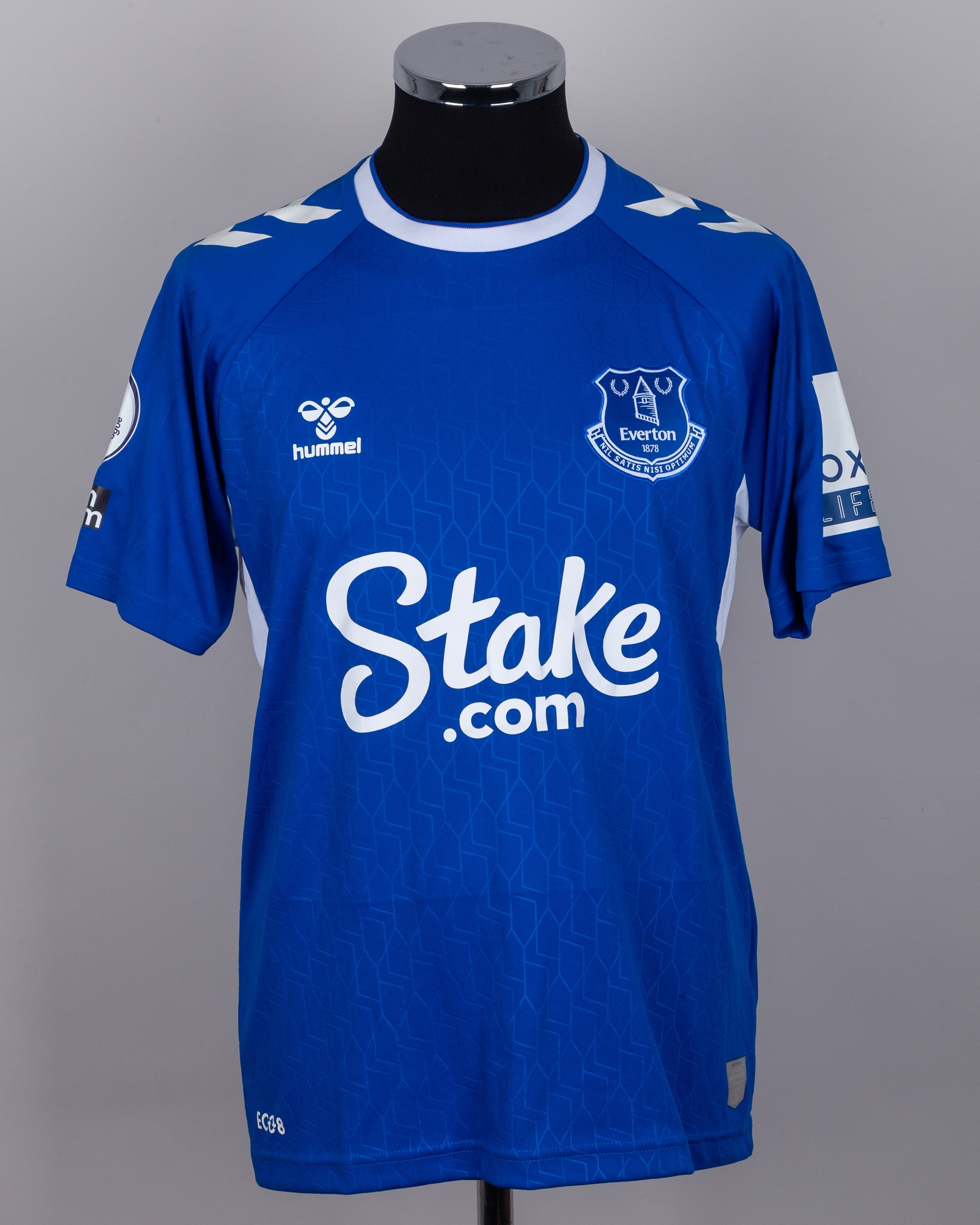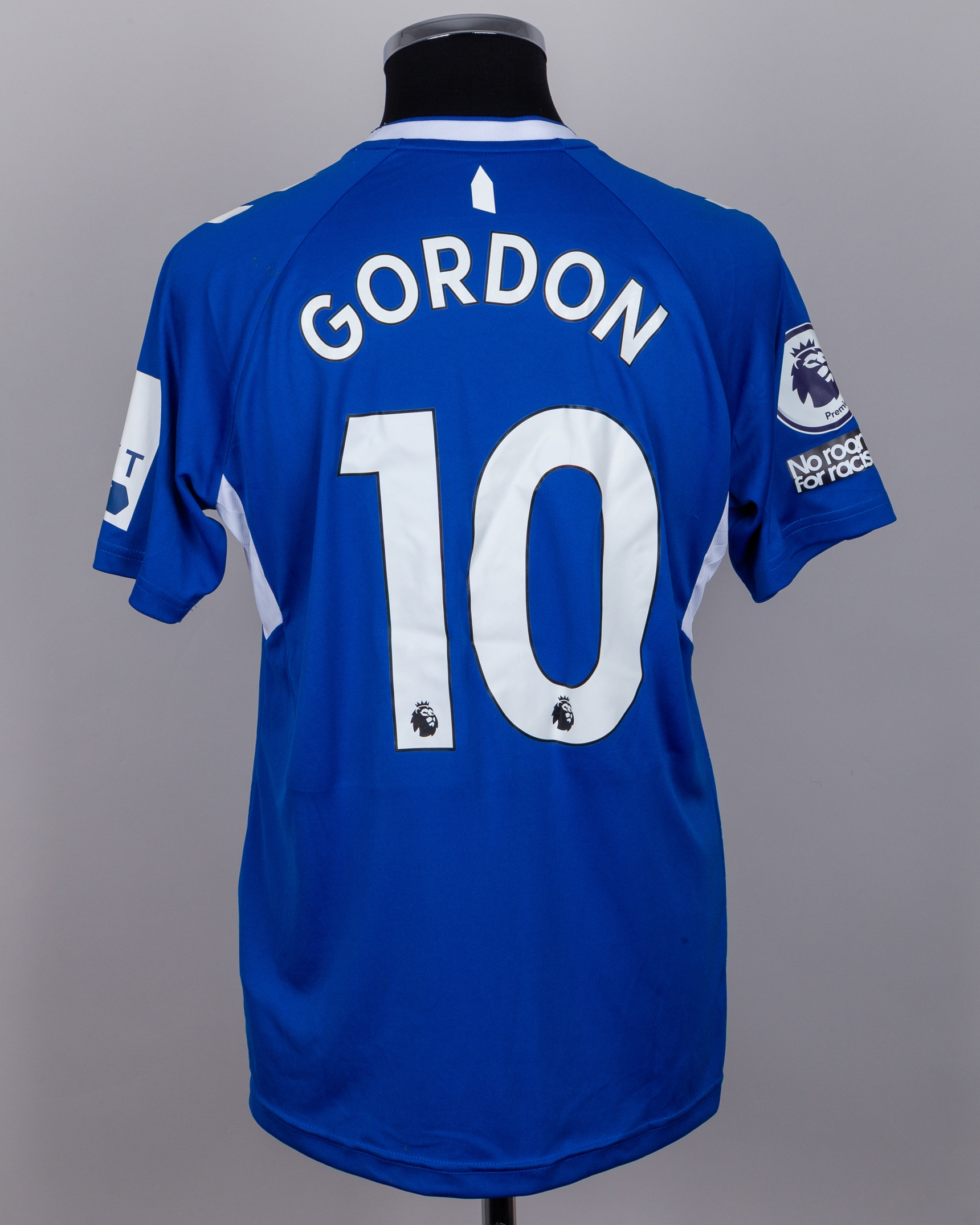 Anthony Gordon blue and white No.10 Everton v. Wolves short-sleeved shirt, 2022, Hummel, with crew-neck collar and embroidered badge inscribed EVERTON 1878, the reverse lettered GORDON, the sleeve with Premier league flash
