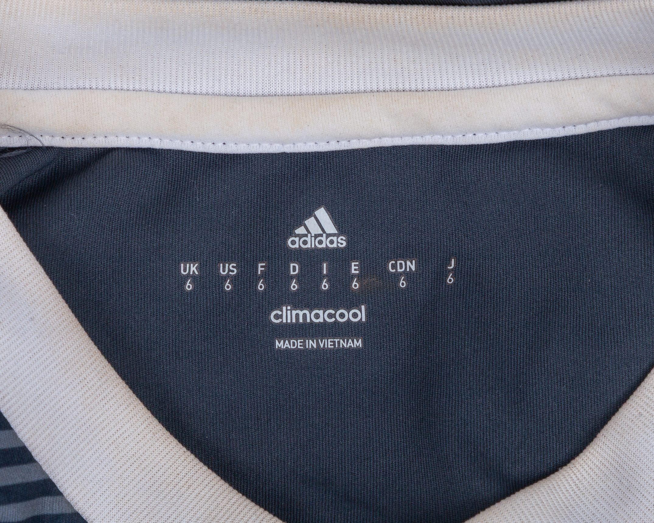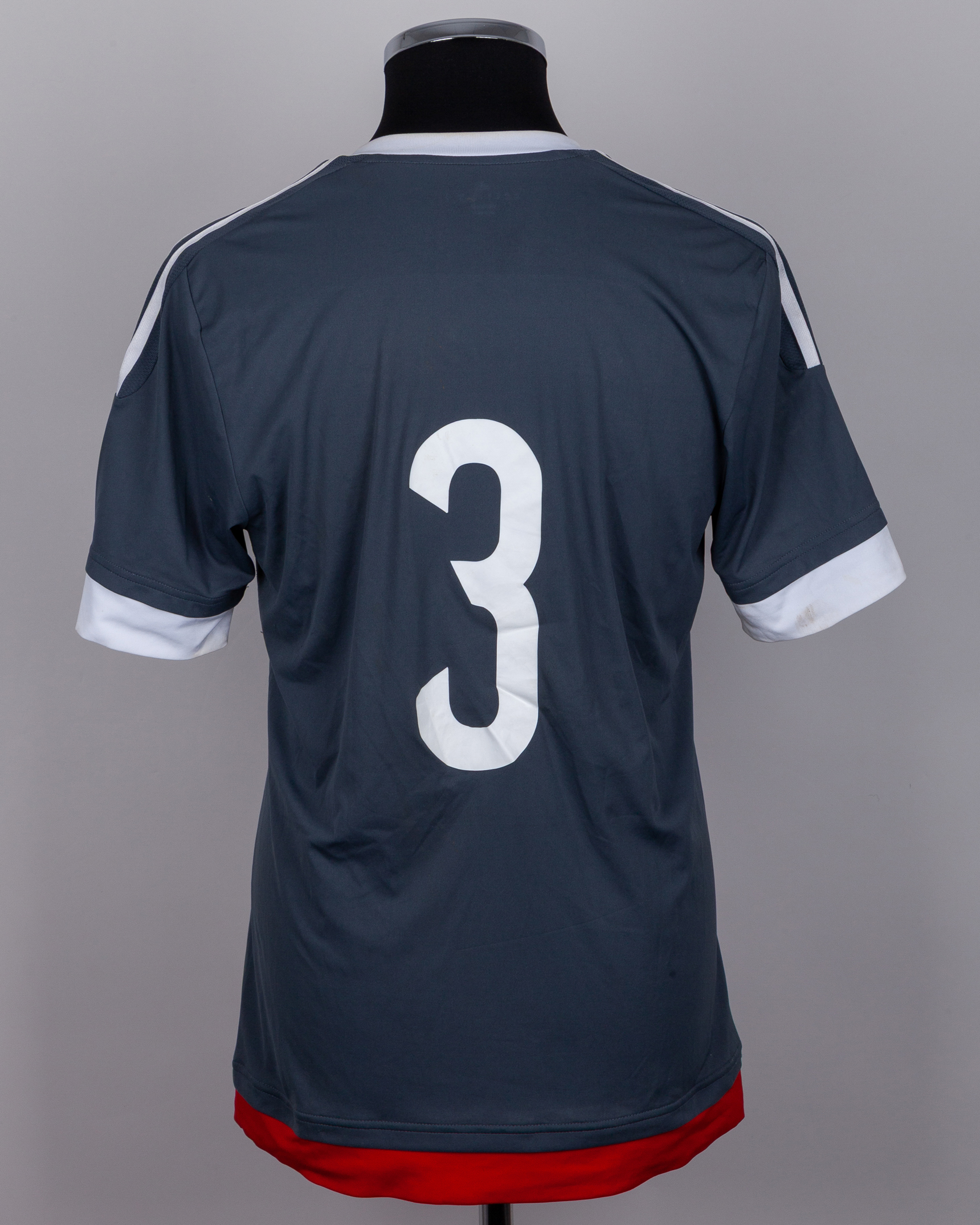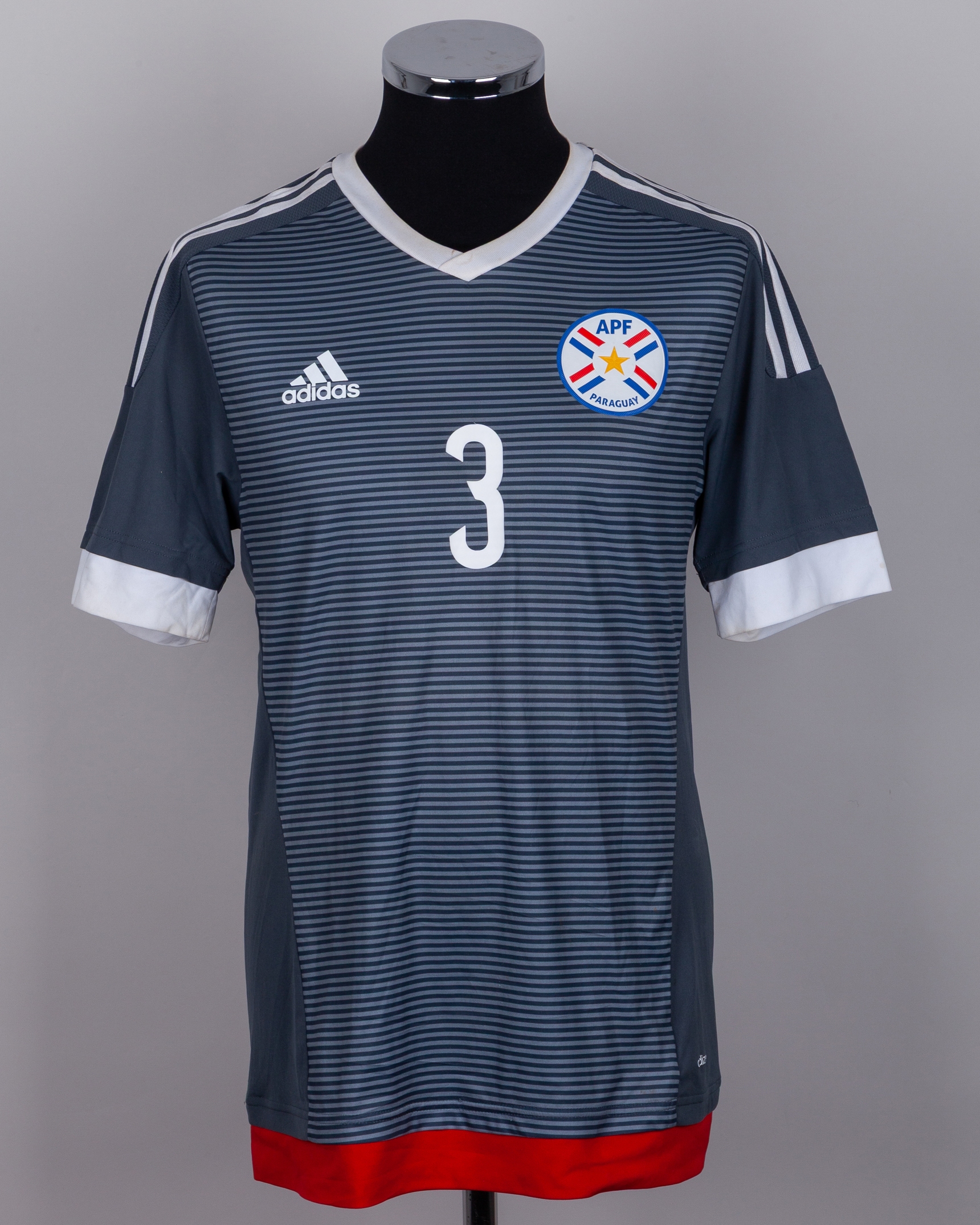 Grey and white No.3 Paraguay short-sleeved shirt, 2015-16, Adidas, 6, with v-neck collar and printed badge, staining