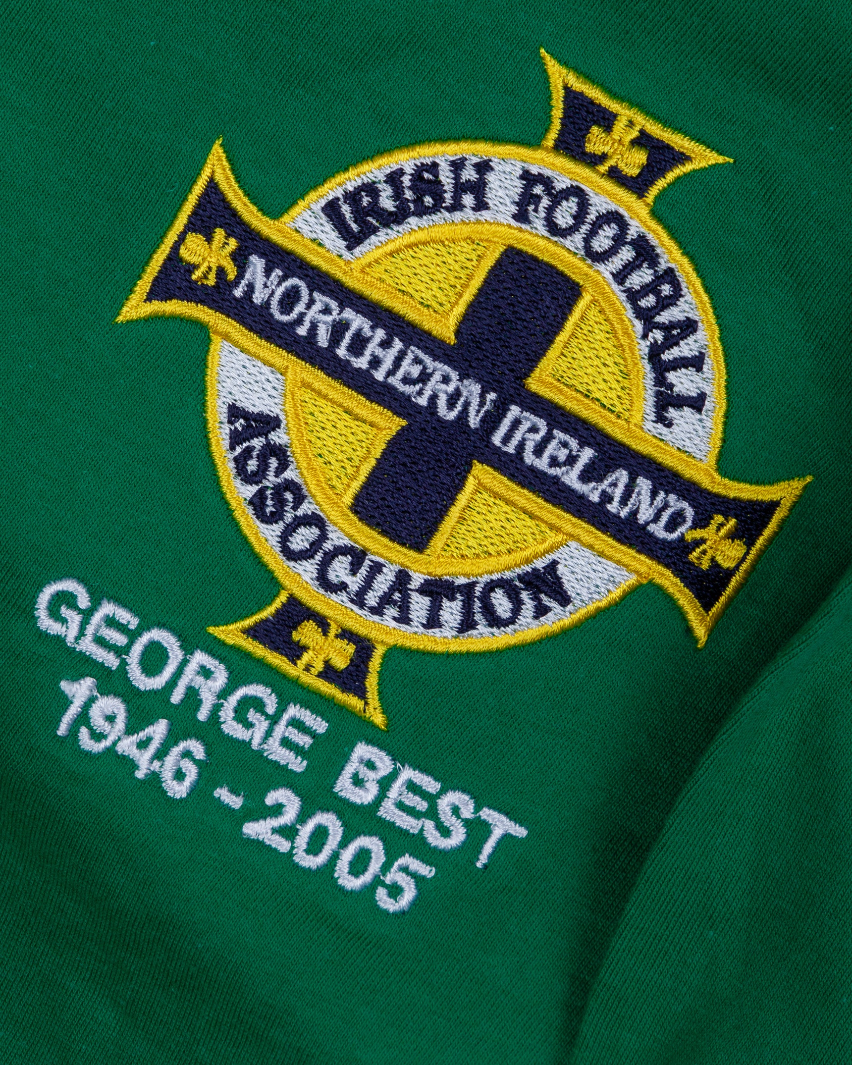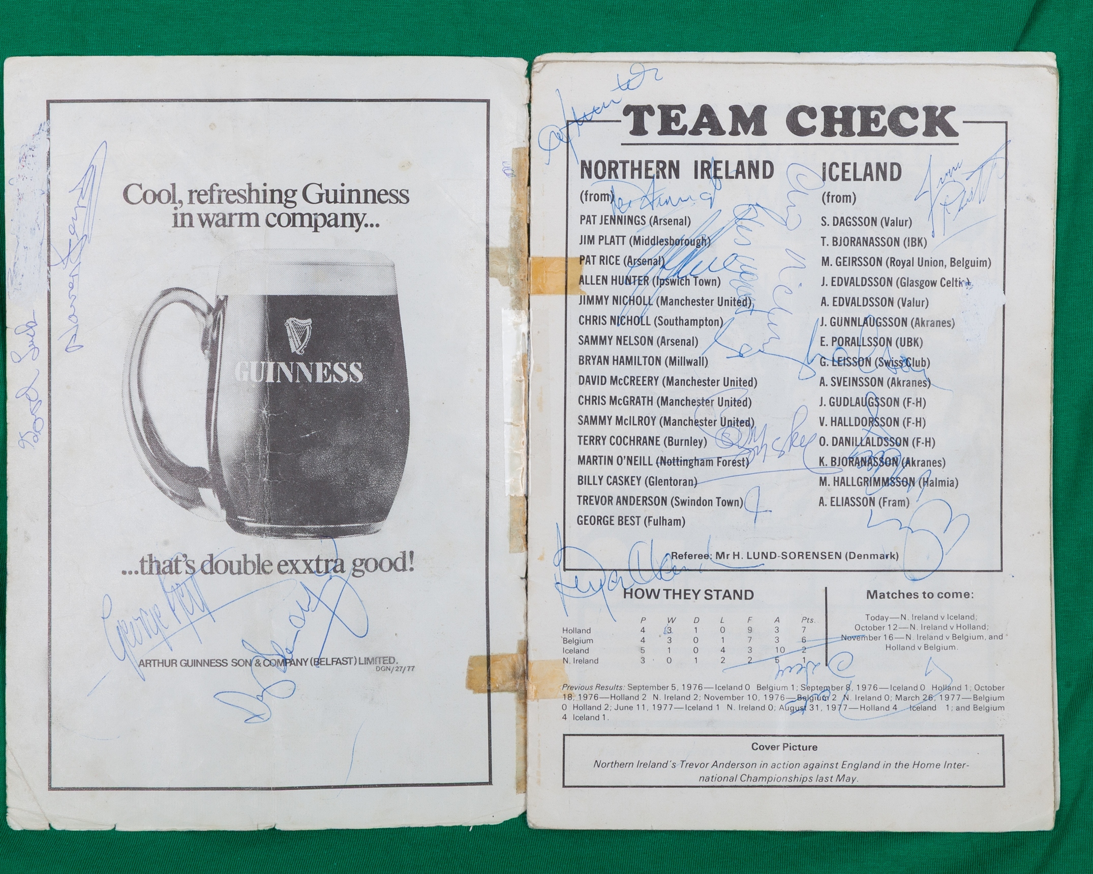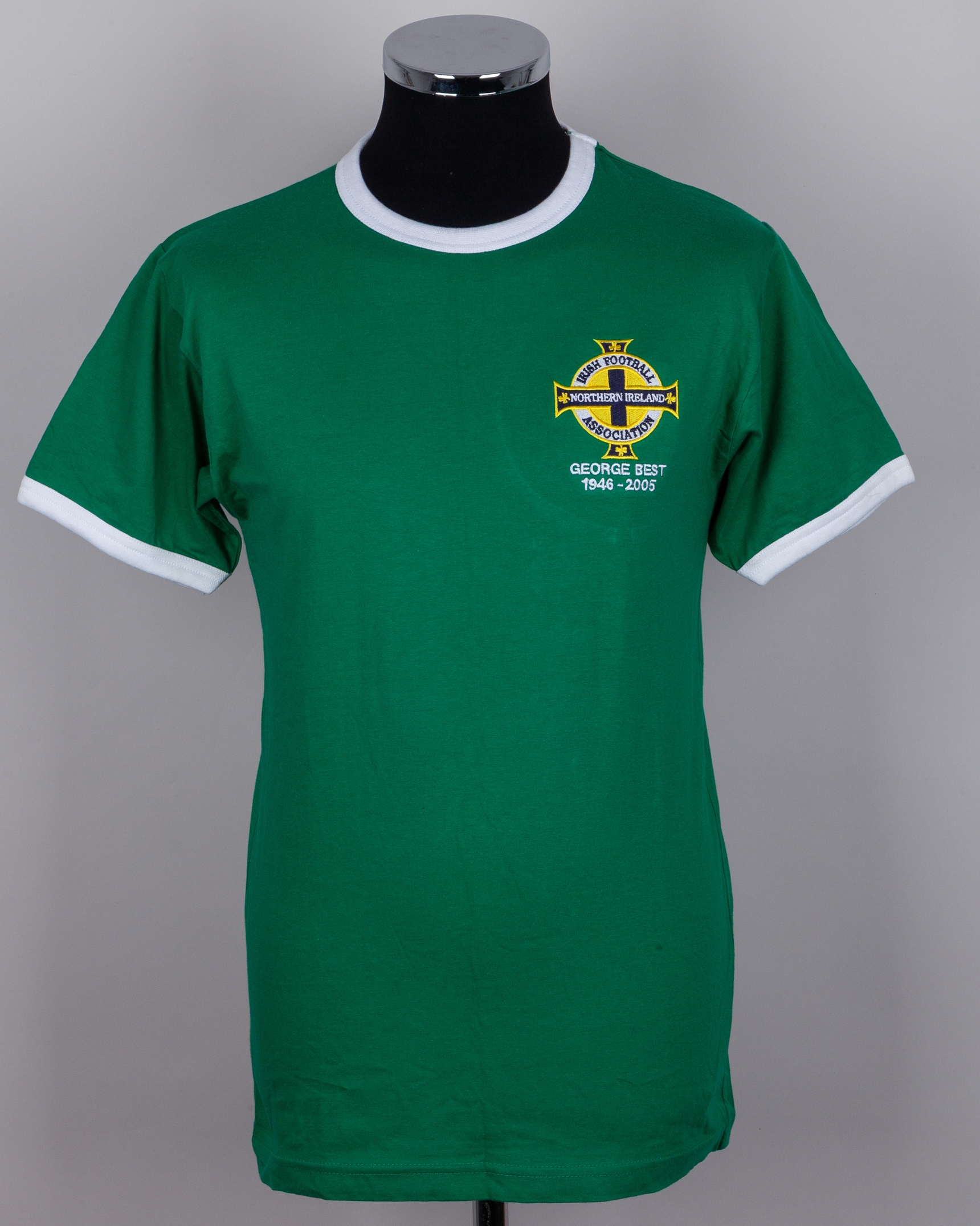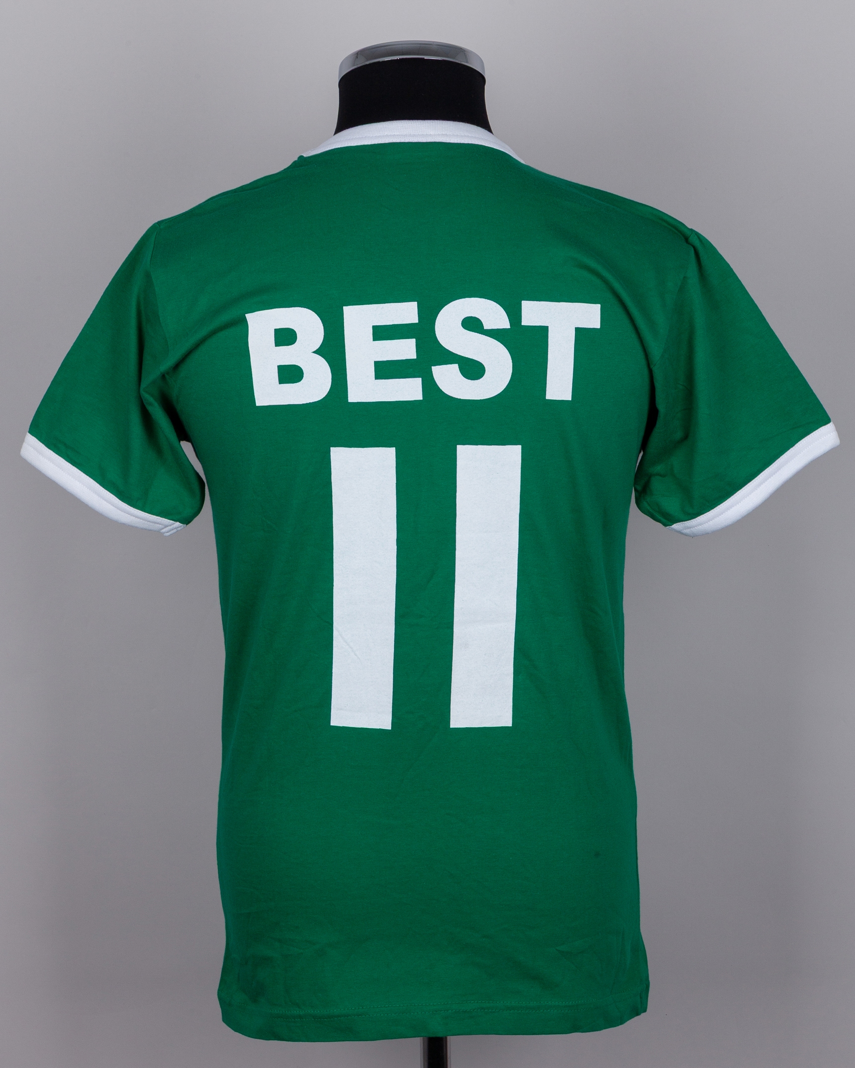 Two George Best Ulster Bank commemorative five pound banknotes, B.O.P George Best vol.89 February 1967, autographed George Dunlop Testimonial programme, worn and folded cover, autographed Northern Ireland v. Iceland programme 21st September 1977, poor condition with tipp-ex marks, George Best green No.11 Northern Ireland replica short-sleeved shirt, Clique, S, with crew-neck collar and embroidered badge, inscribed GEORGE BEST 1946-2005, reverse lettered BEST (6)