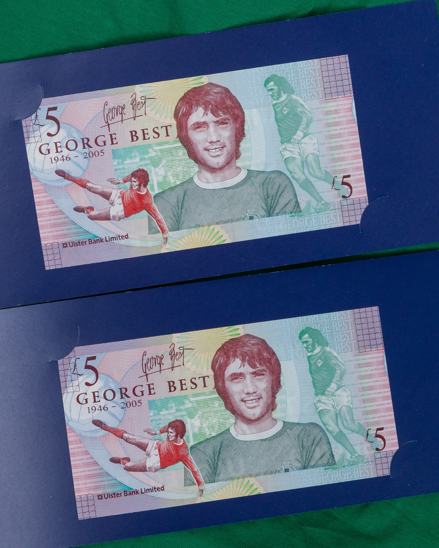 Two George Best Ulster Bank commemorative five pound banknotes