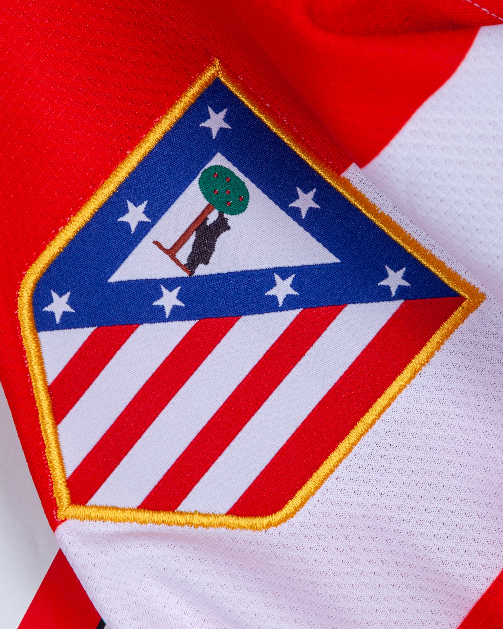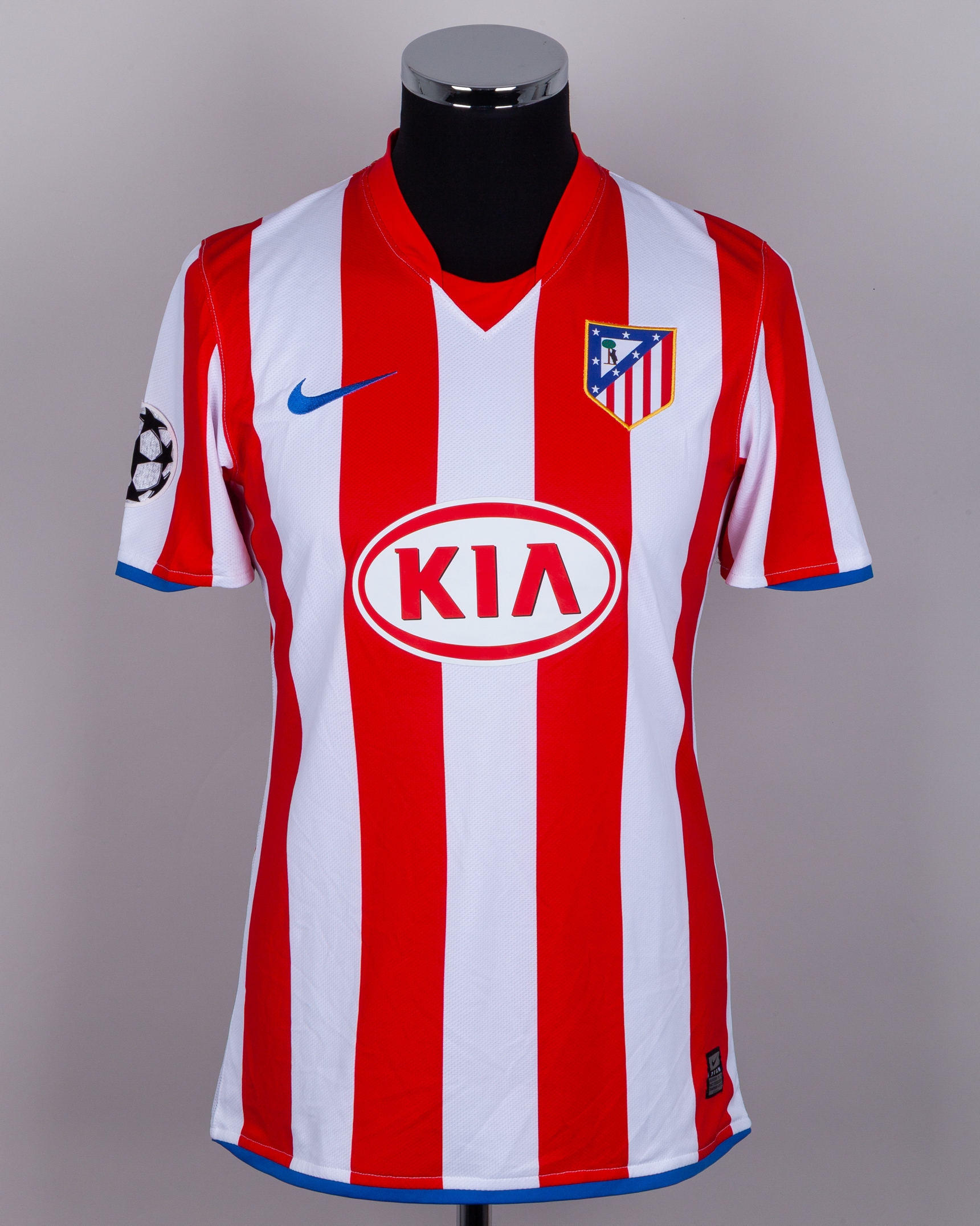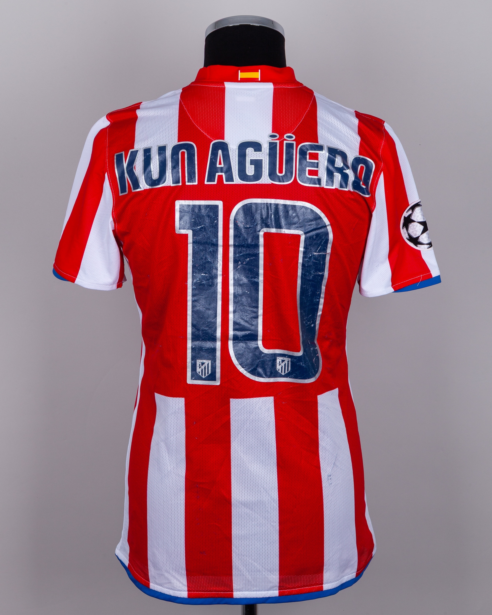 Sergio Aguero red and white No.10 Atletico Madrid v. Liverpool match worn short-sleeved shirt, 2008, Nike, M, with v-neck style collar and embroidered cloth badge, the reverse lettered KUN AGUERO, the right sleeve with Champions League flash, washed, print on the reverse worn and marking shirt, flash loose