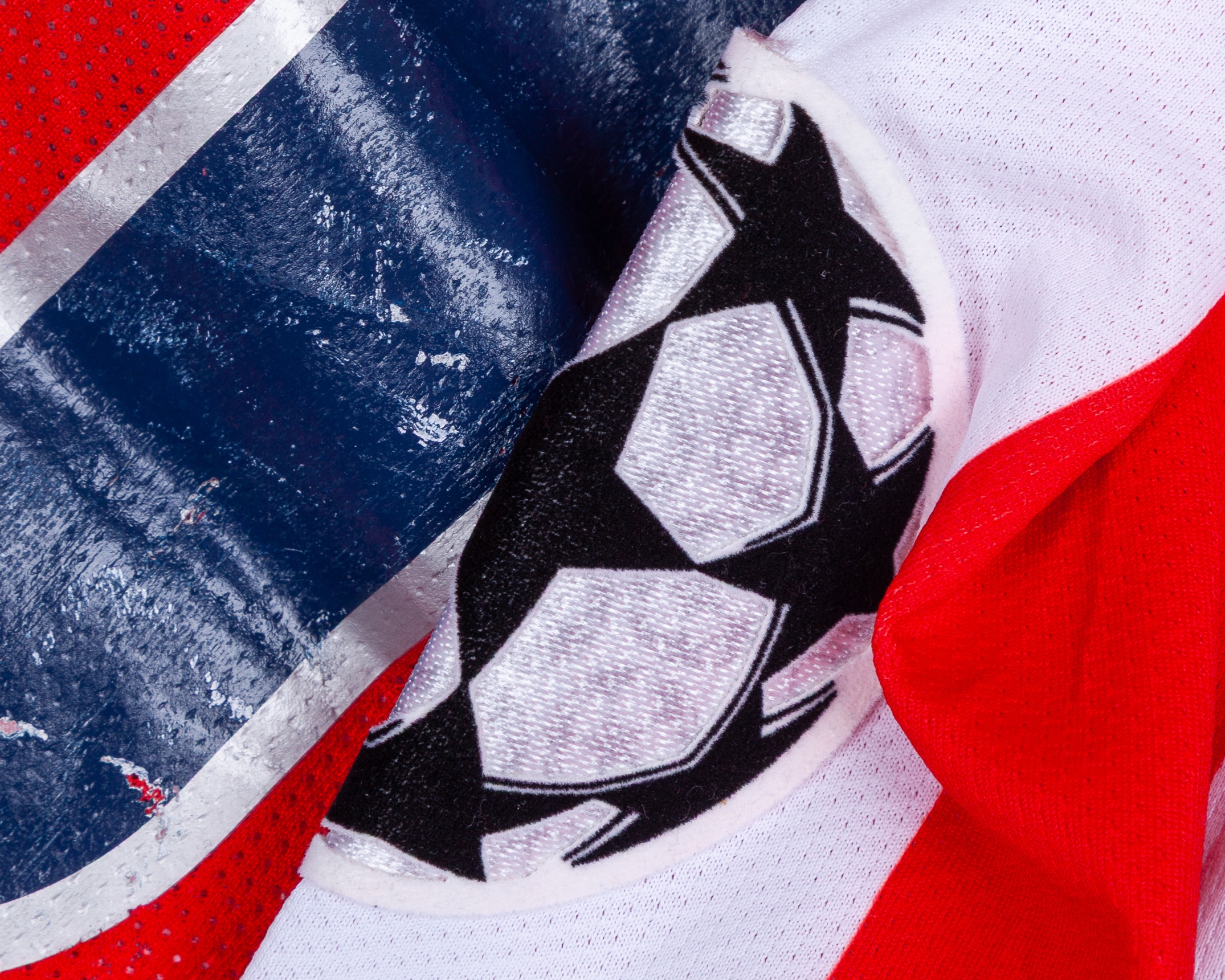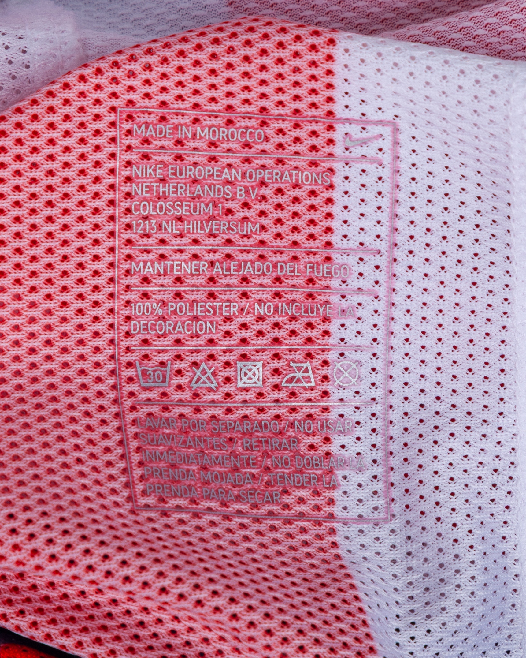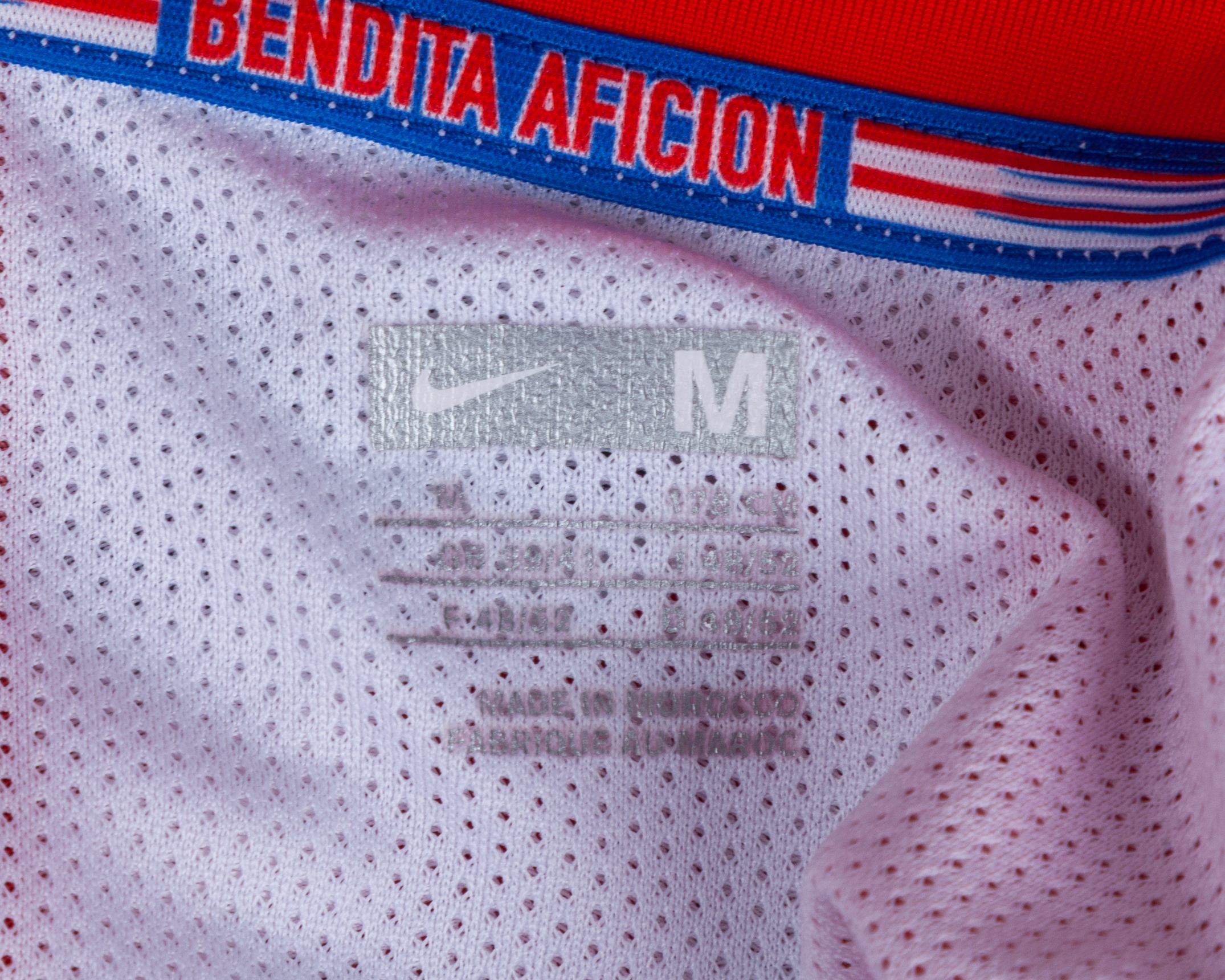 Sergio Aguero red and white No.10 Atletico Madrid v. Liverpool match worn short-sleeved shirt, 2008, Nike, M, with v-neck style collar and embroidered cloth badge, the reverse lettered KUN AGUERO, the right sleeve with Champions League flash, washed, print on the reverse worn and marking shirt, flash loose