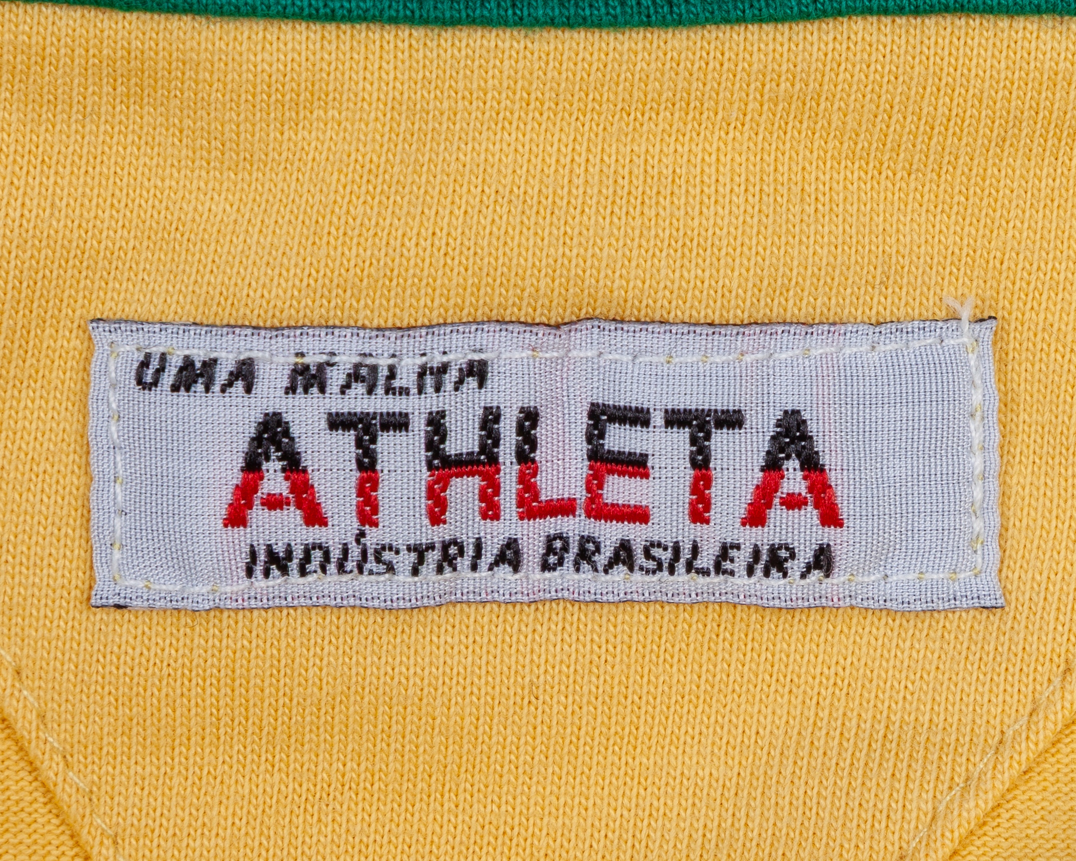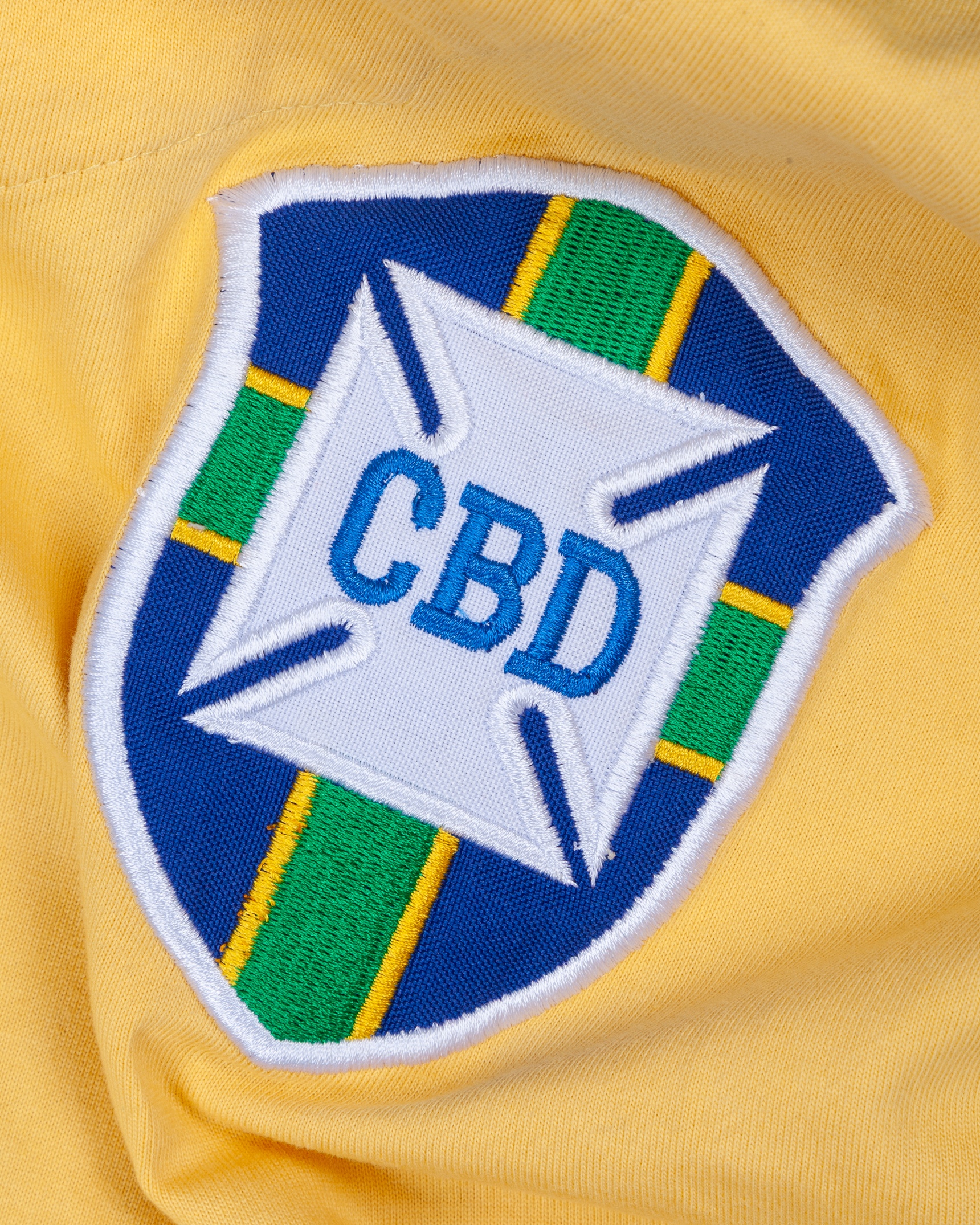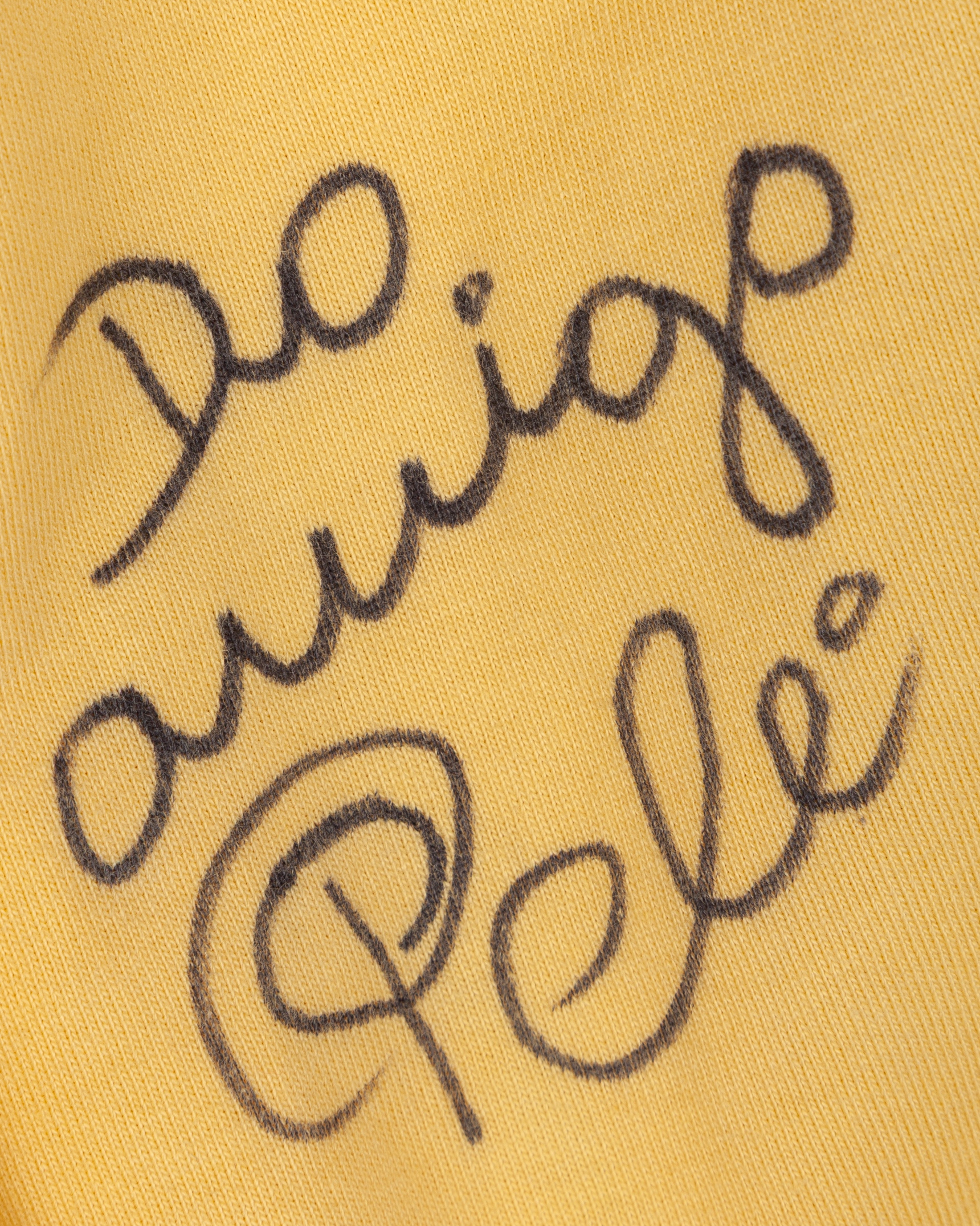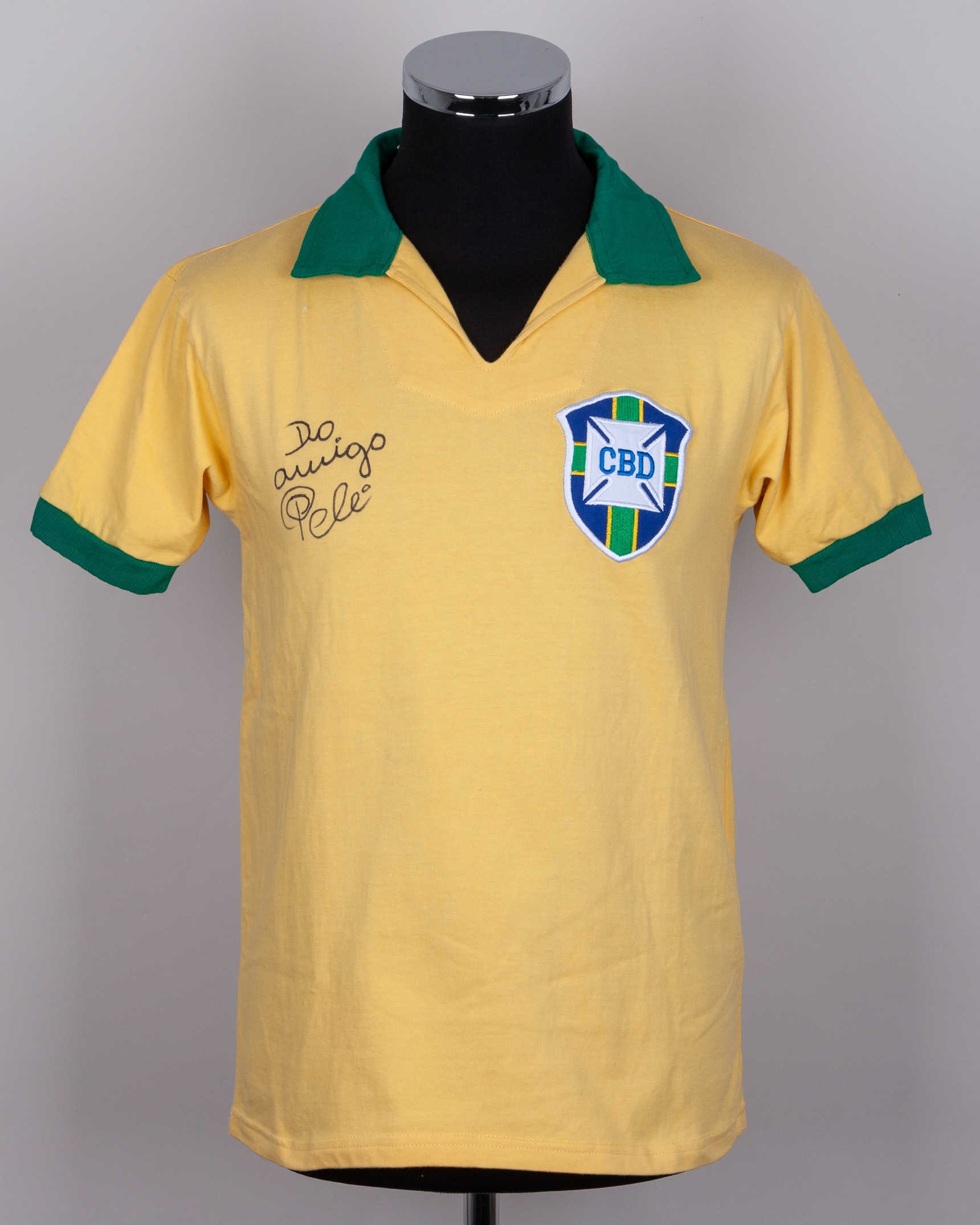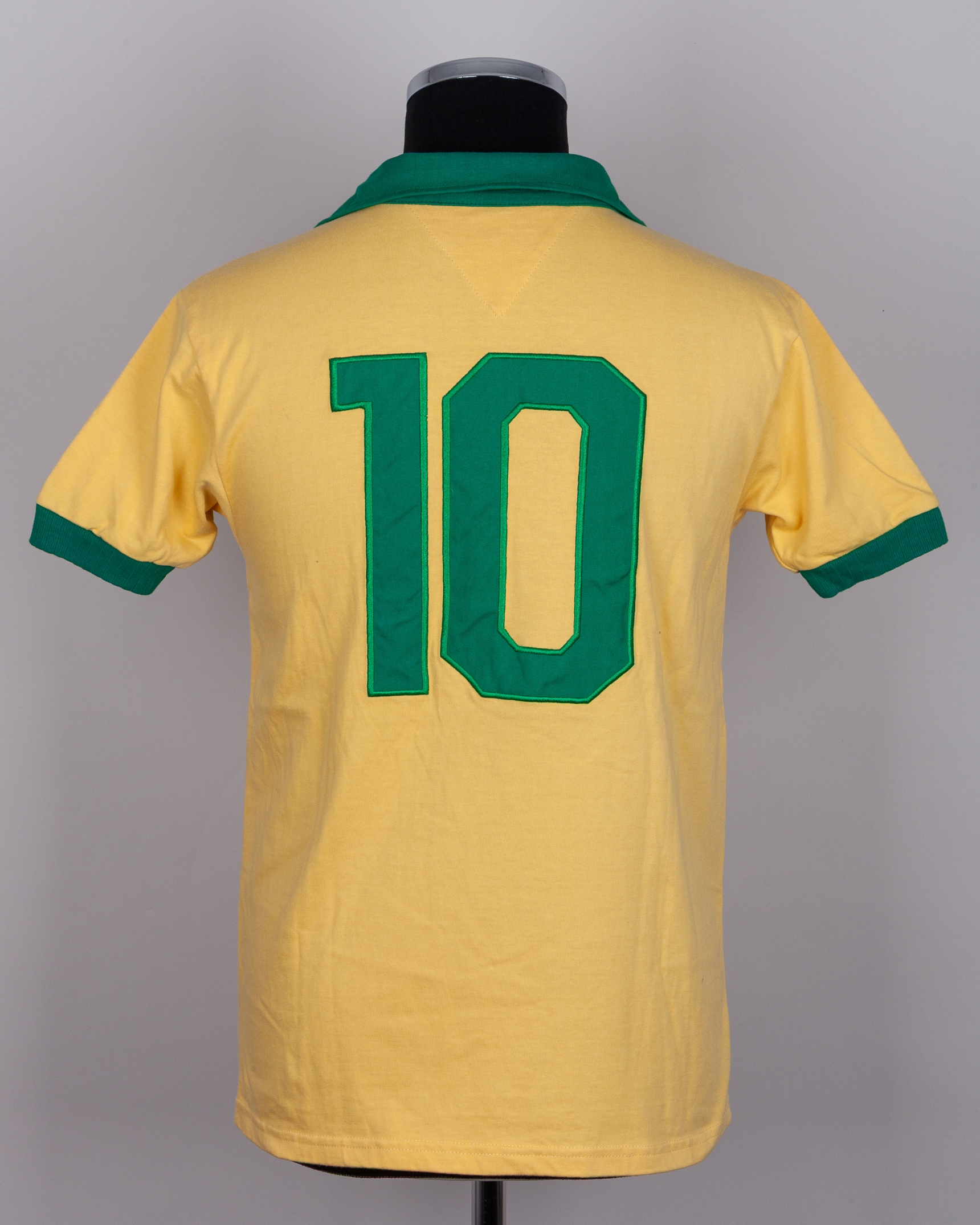Pele autographed yellow No.10 Brazil replica short-sleeved shirt, Athleta, with v-neck collar and embroidered cloth badge inscribed CBD, autographed on the front, with COA