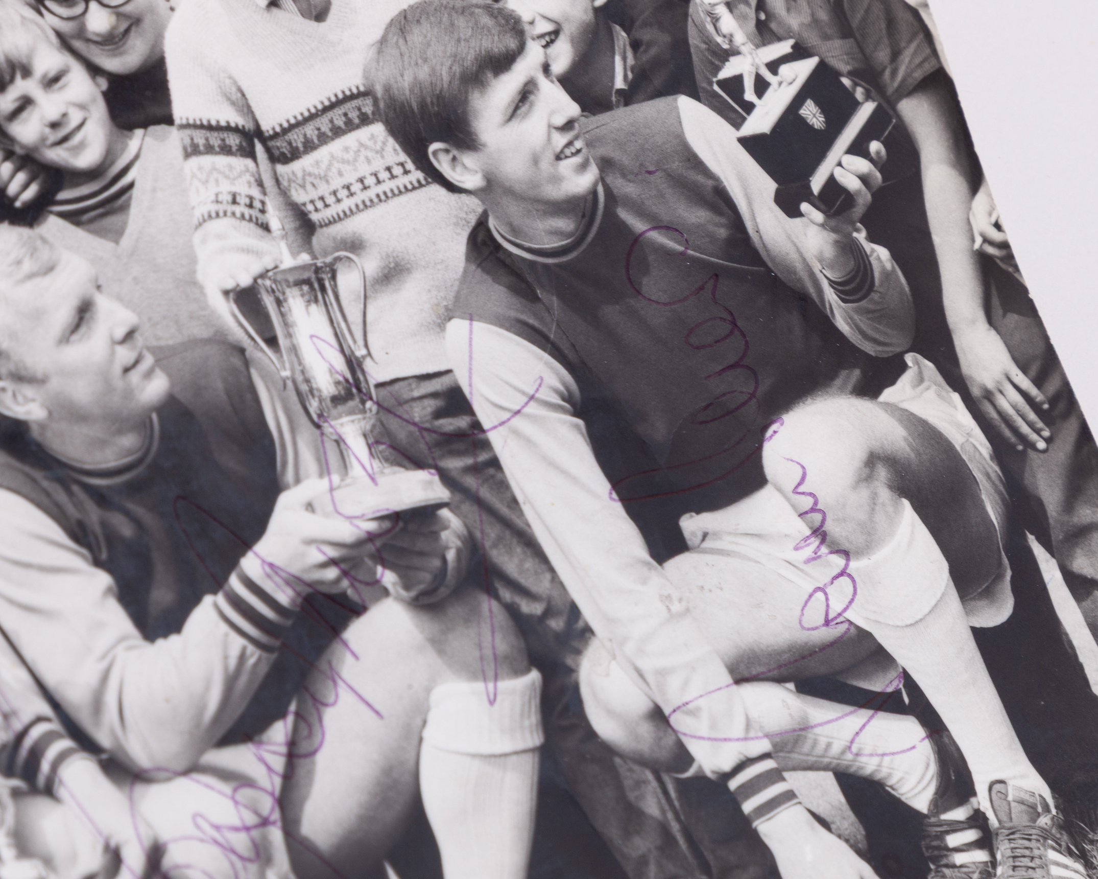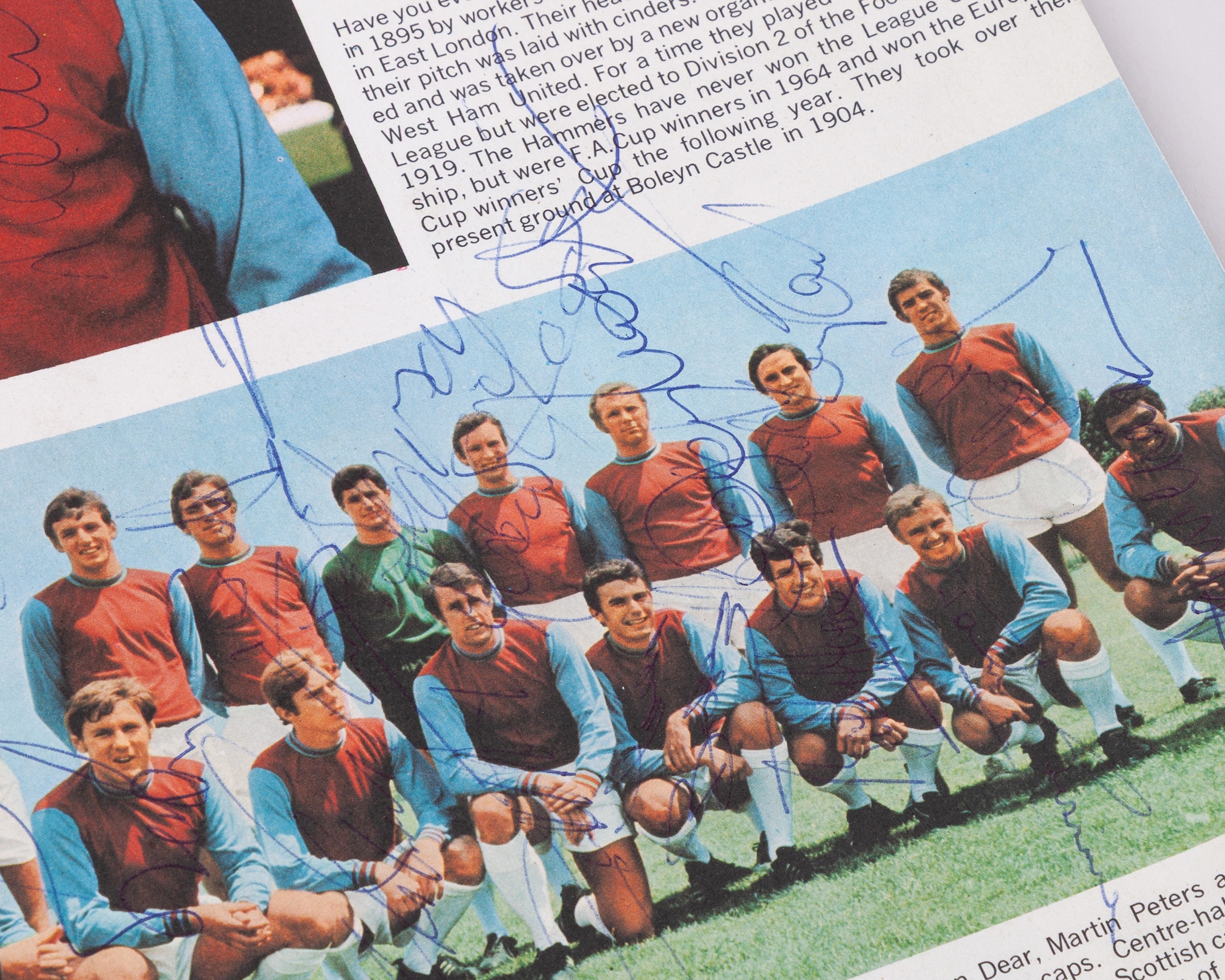 West Ham United 1960s autographs including Bobby Moore and programmes, West Ham United v. Fulham F.A.Cup Final programme 3rd may 1975 and autographed first day cover, The Official Publication of the West Ham Players 1964, Geoff Hurst autographed West Ham v. Tottenham 9th May 1967 programme, Martin Peters autographed West Ham v. Liverpool 6th September 1965 programme, West Ham v Hereford 5th January 1974 programme