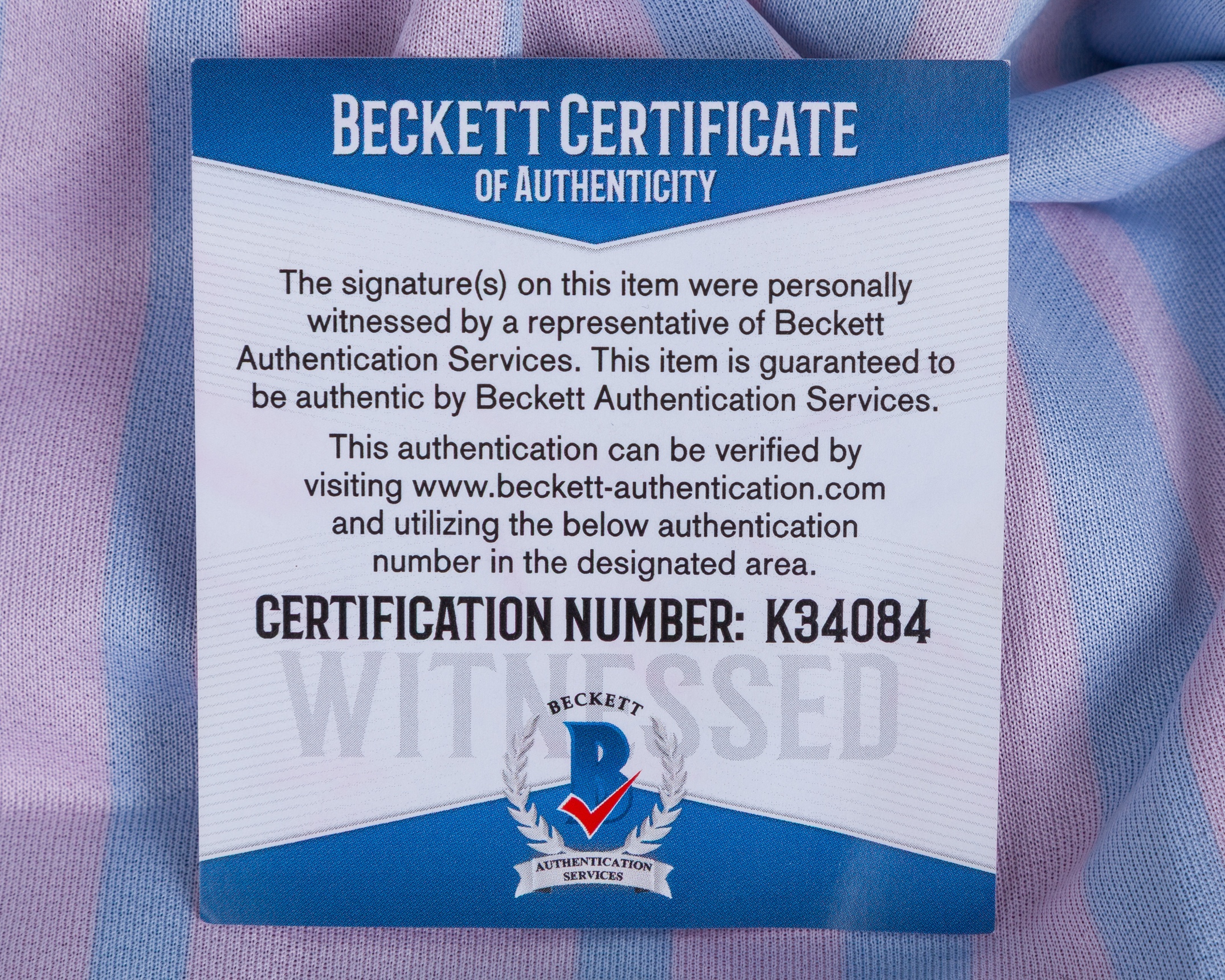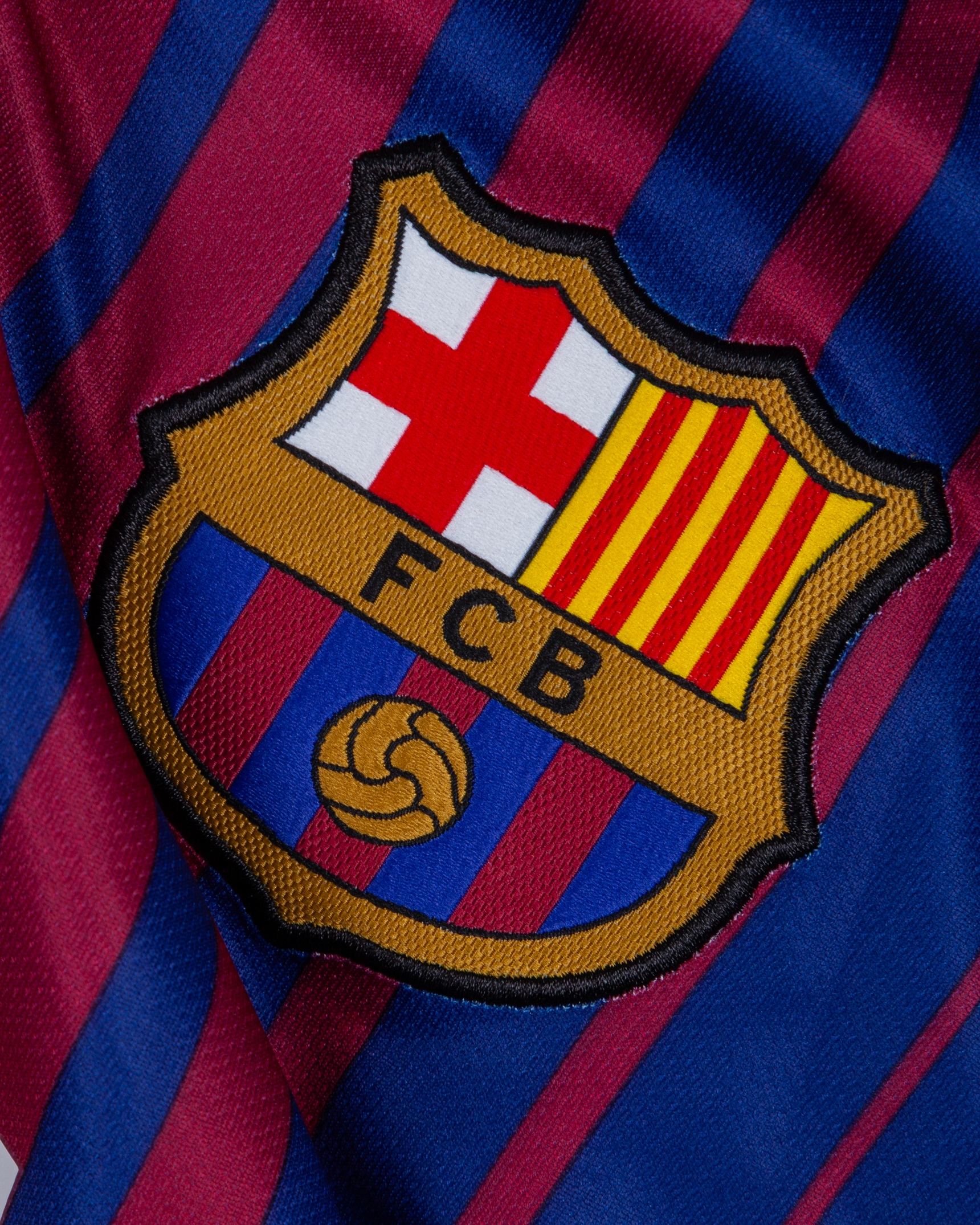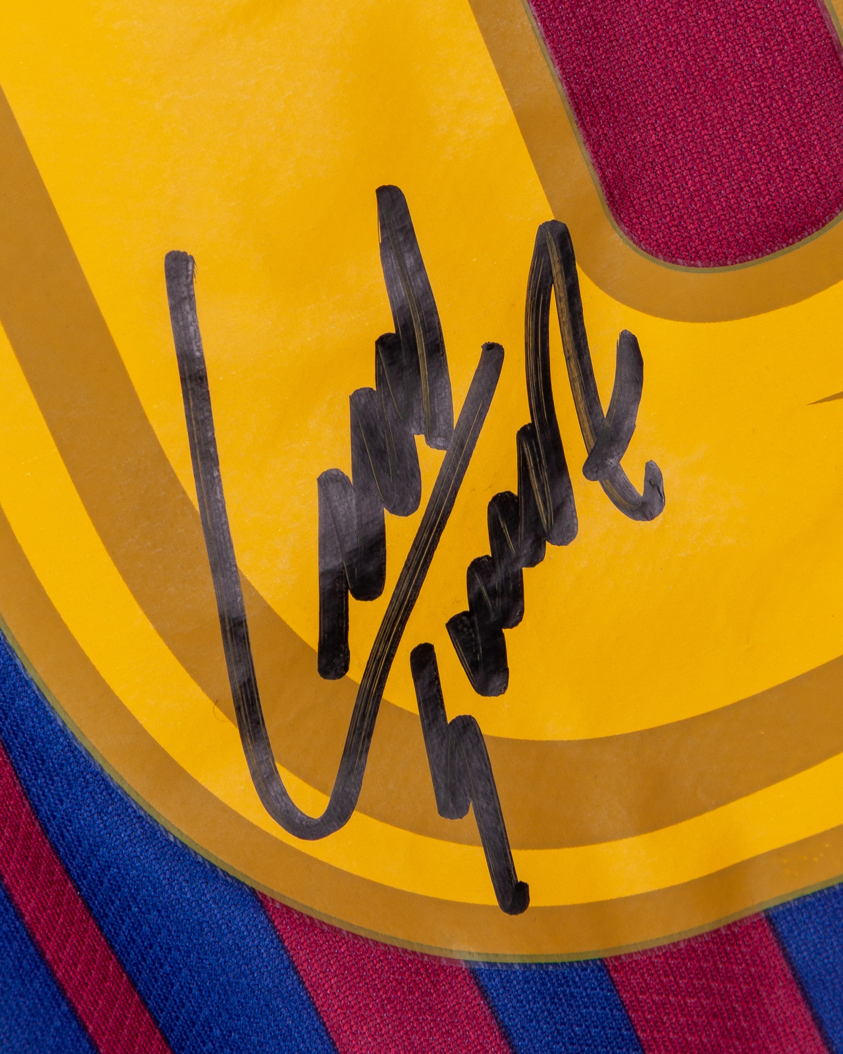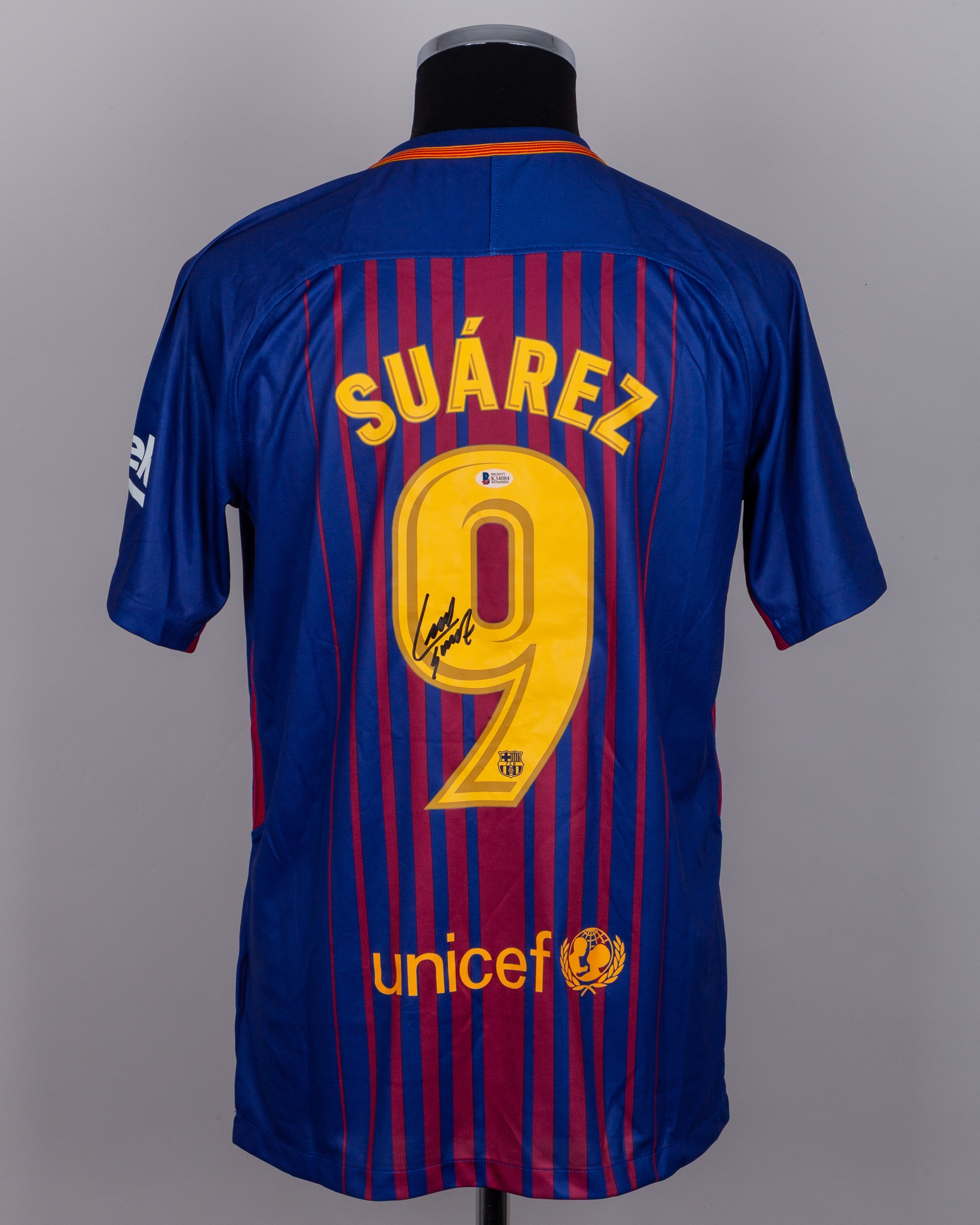 Luis Suarez autographed garnet and blue No.9 Barcelona short-sleeved shirt, Nike, L, with crew-neck collar and embroidered cloth badge inscribed FCB, the reverse lettered SUAREZ, the right sleeve with La Liga flash, autographed on the number, with COA