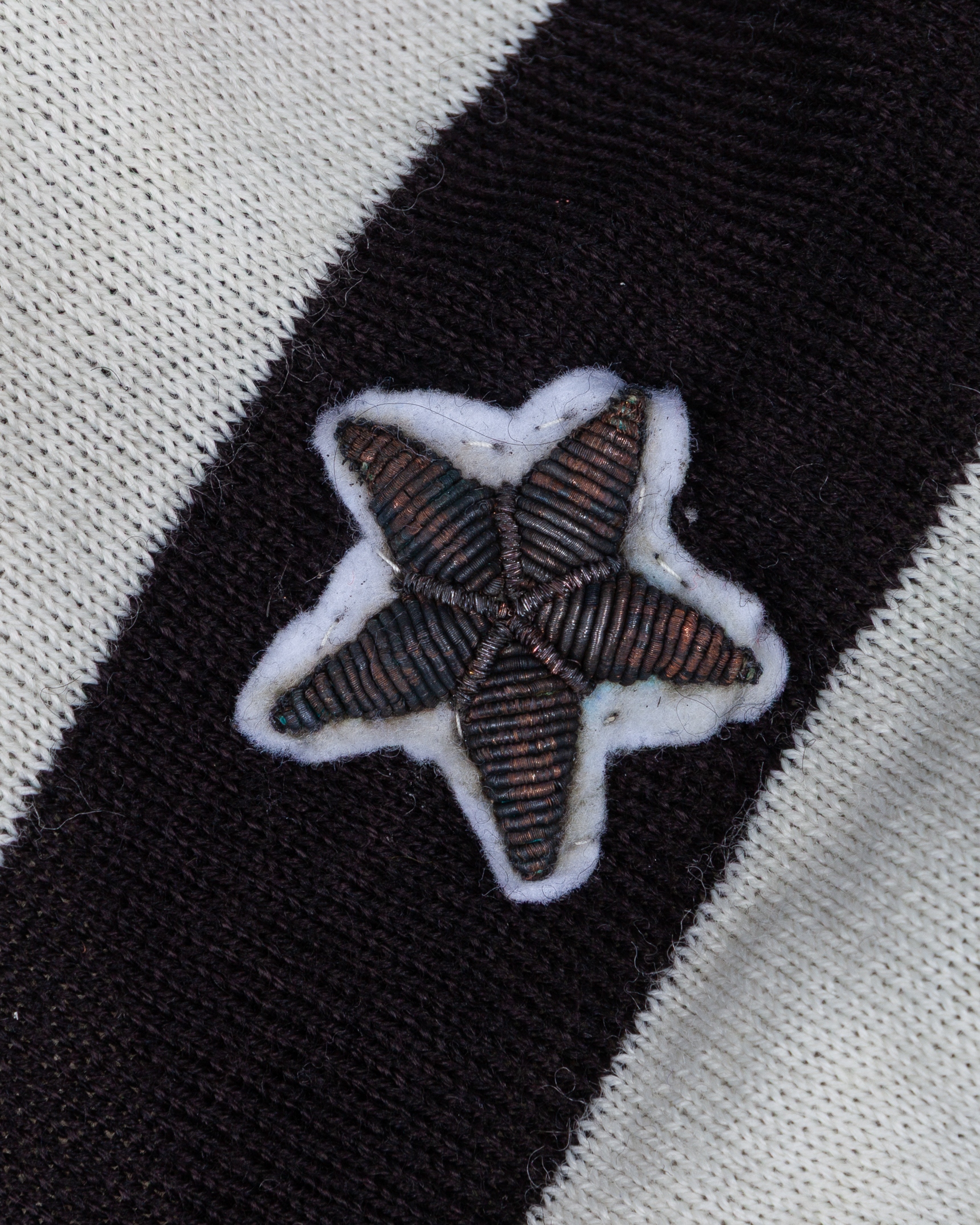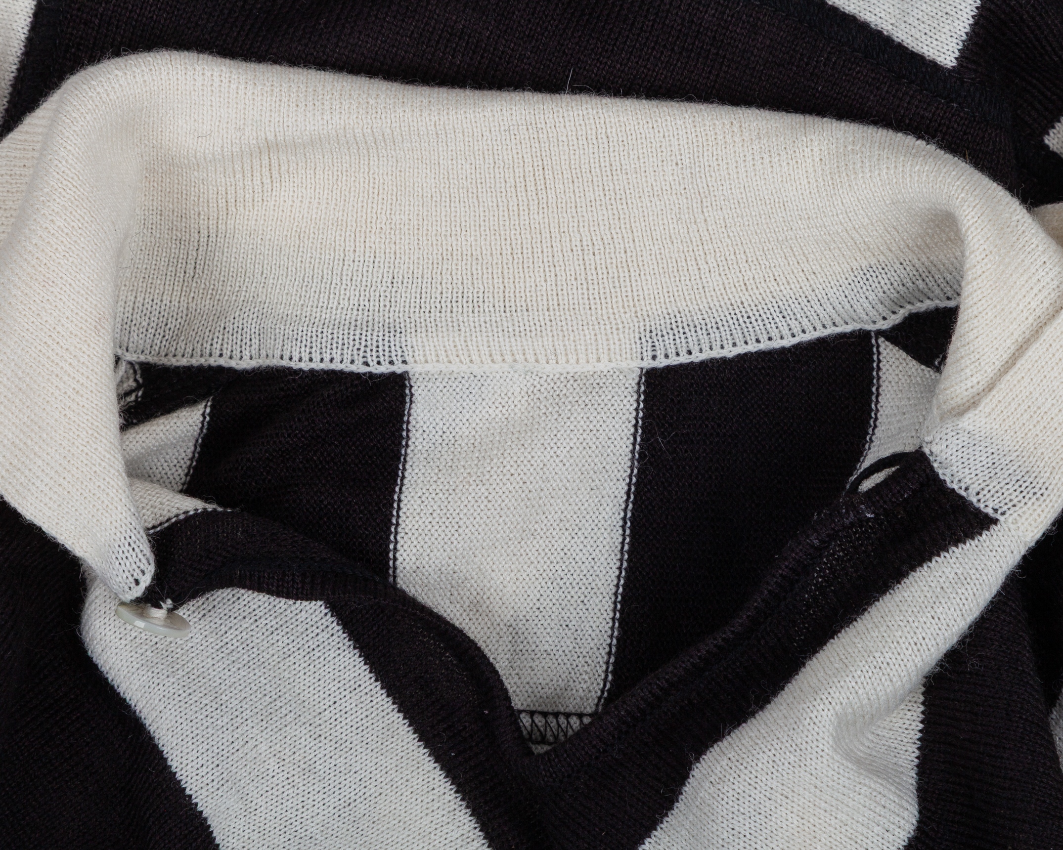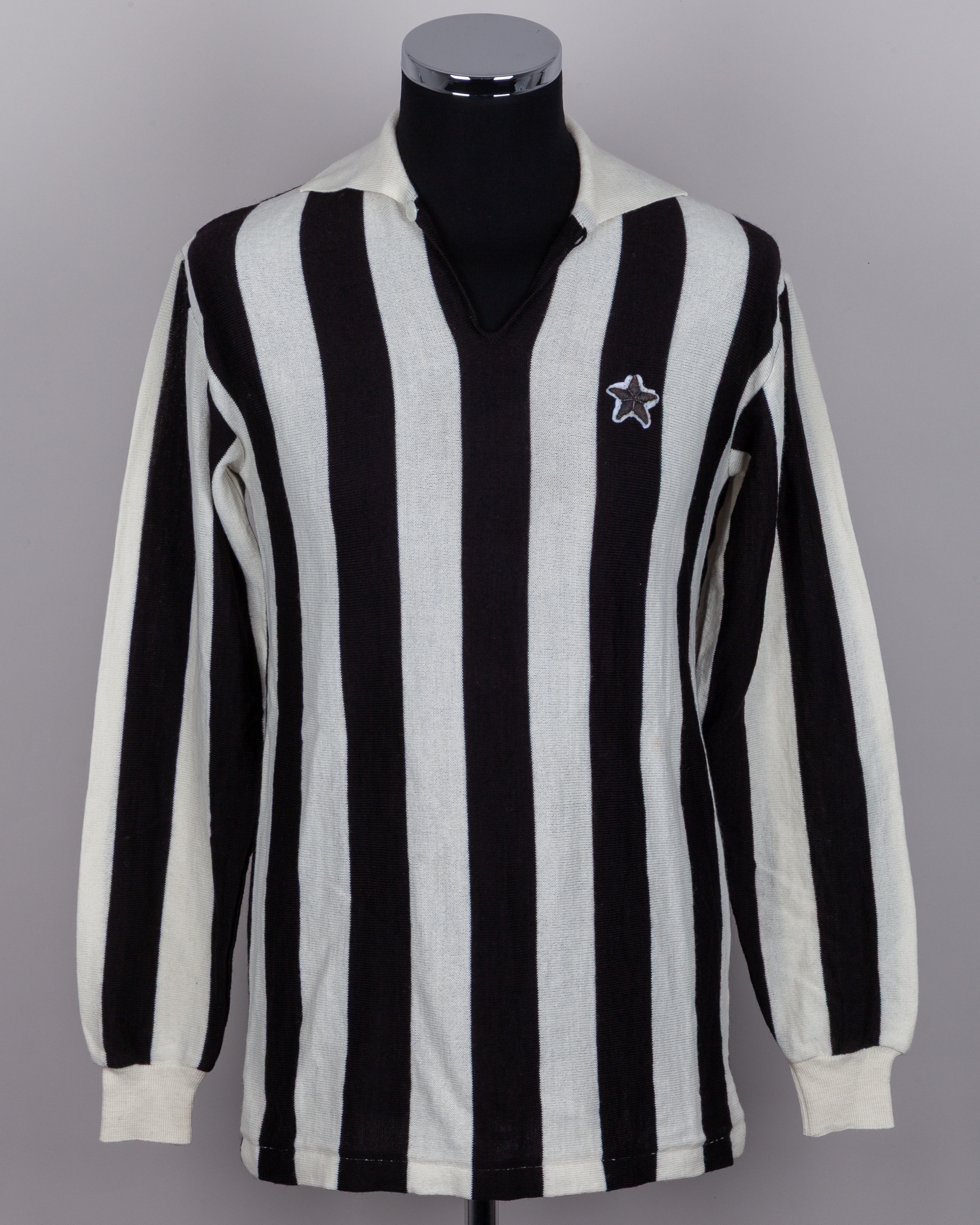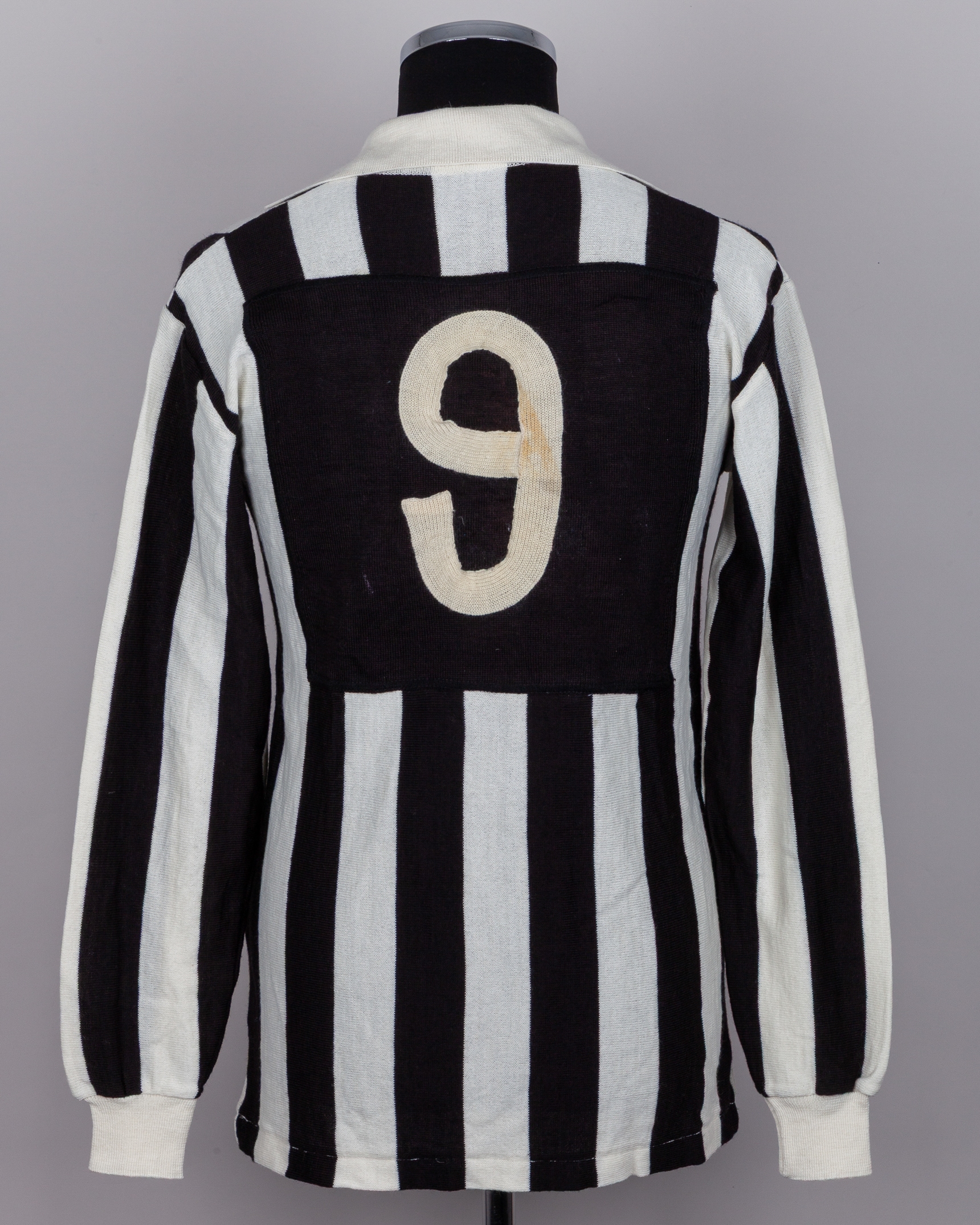 Pietro Anastasi black and white No.9 Juventus v. Fiorentina match worn long-sleeved shirt, 1971, with v-neck single button collar and embroidered cloth star badge, with signed COA from Giuseppe Longoni's wife stating her husband swapped the shirt with Anastasi, with staining and discolouration