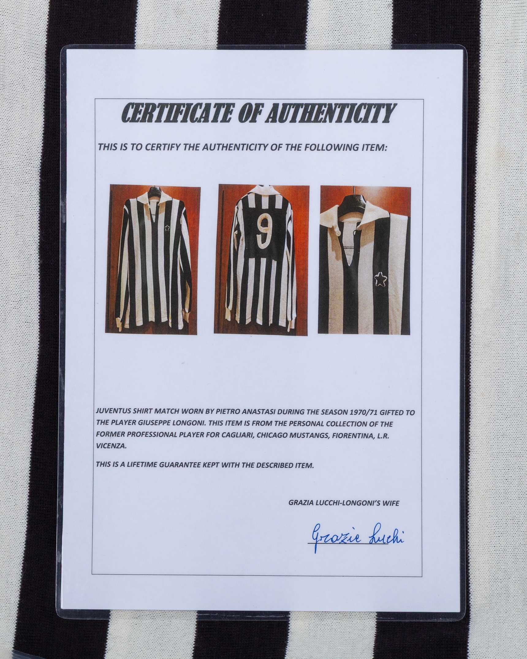 The above shirt was worn by Anastasi and gained in a swap by Longoni in the Serie A match against Fiorentina played on either the 24th January 1971 in Florence or 23rd May 1971 in Turin