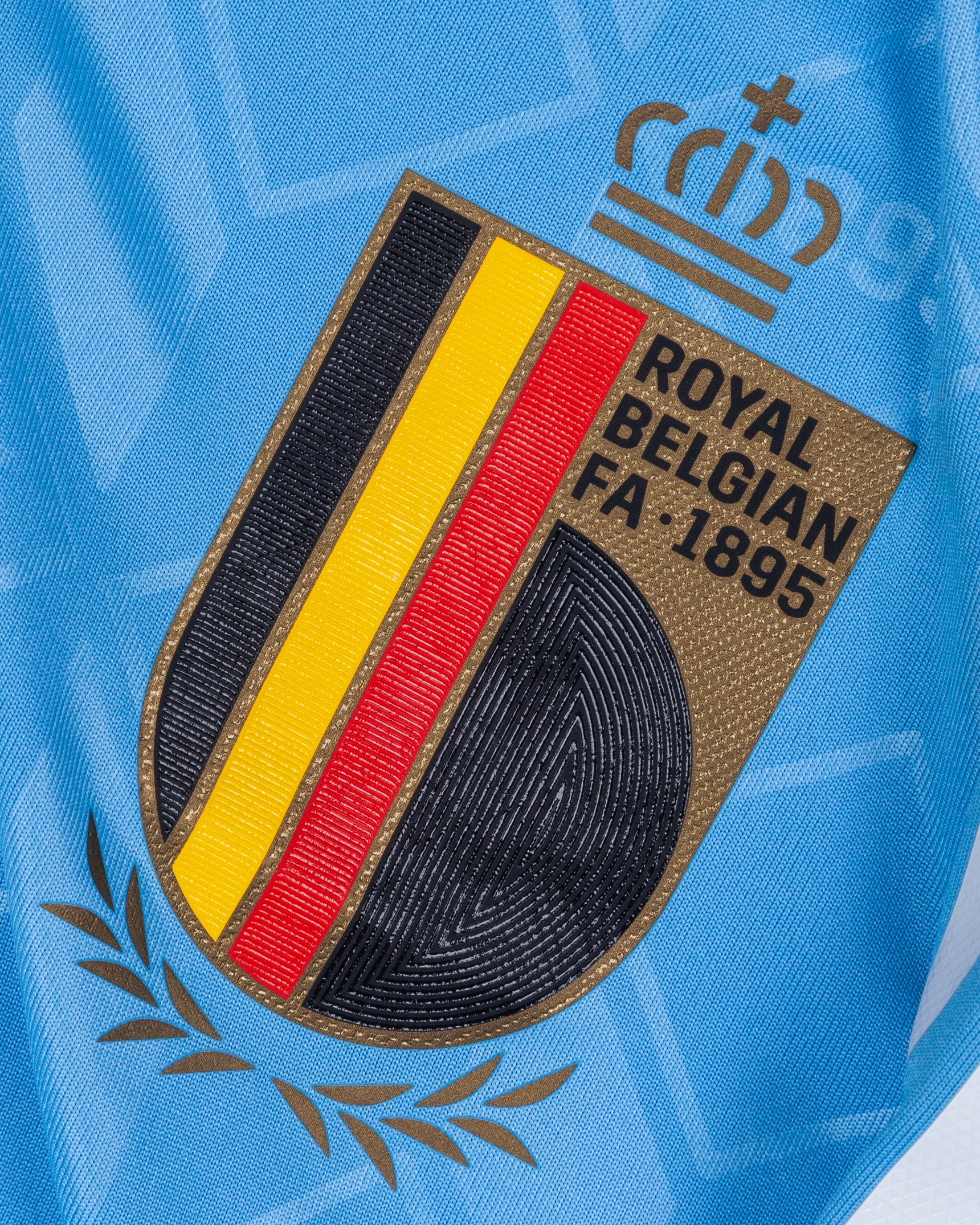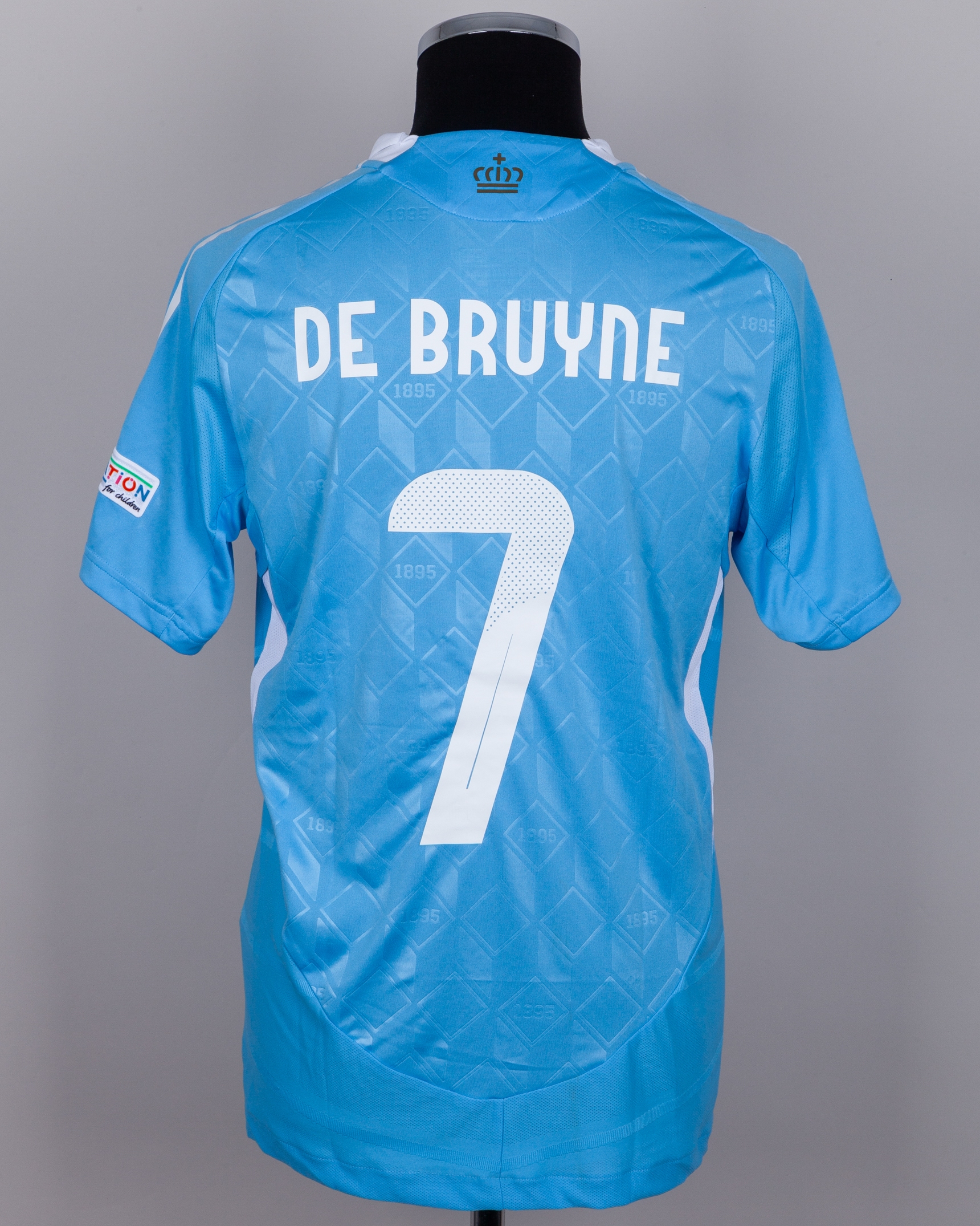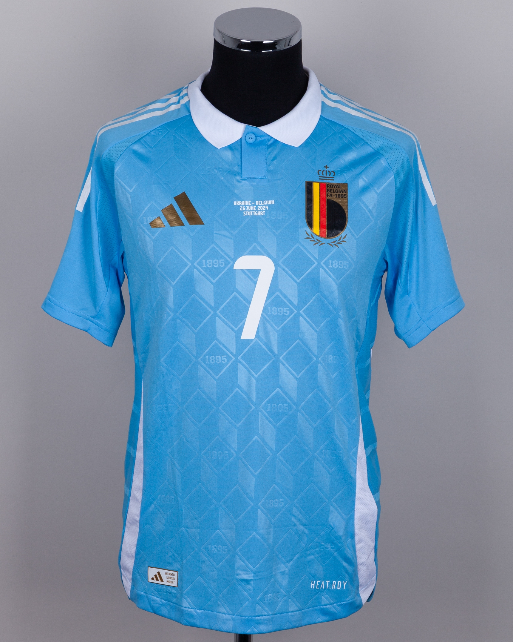 Kevin De Bruyne blue and white No.7 Belgium v. Ukraine short-sleeved shirt, 2024, Adidas, M, with button-up collar and printed badge, with UKRAINE - BELGIUM 26 JUNE 2024 STUTTGART decal, the reverse lettered DE BRUYNE, the right sleeve with Euros flash and the left sleeve with UEFA foundation flash