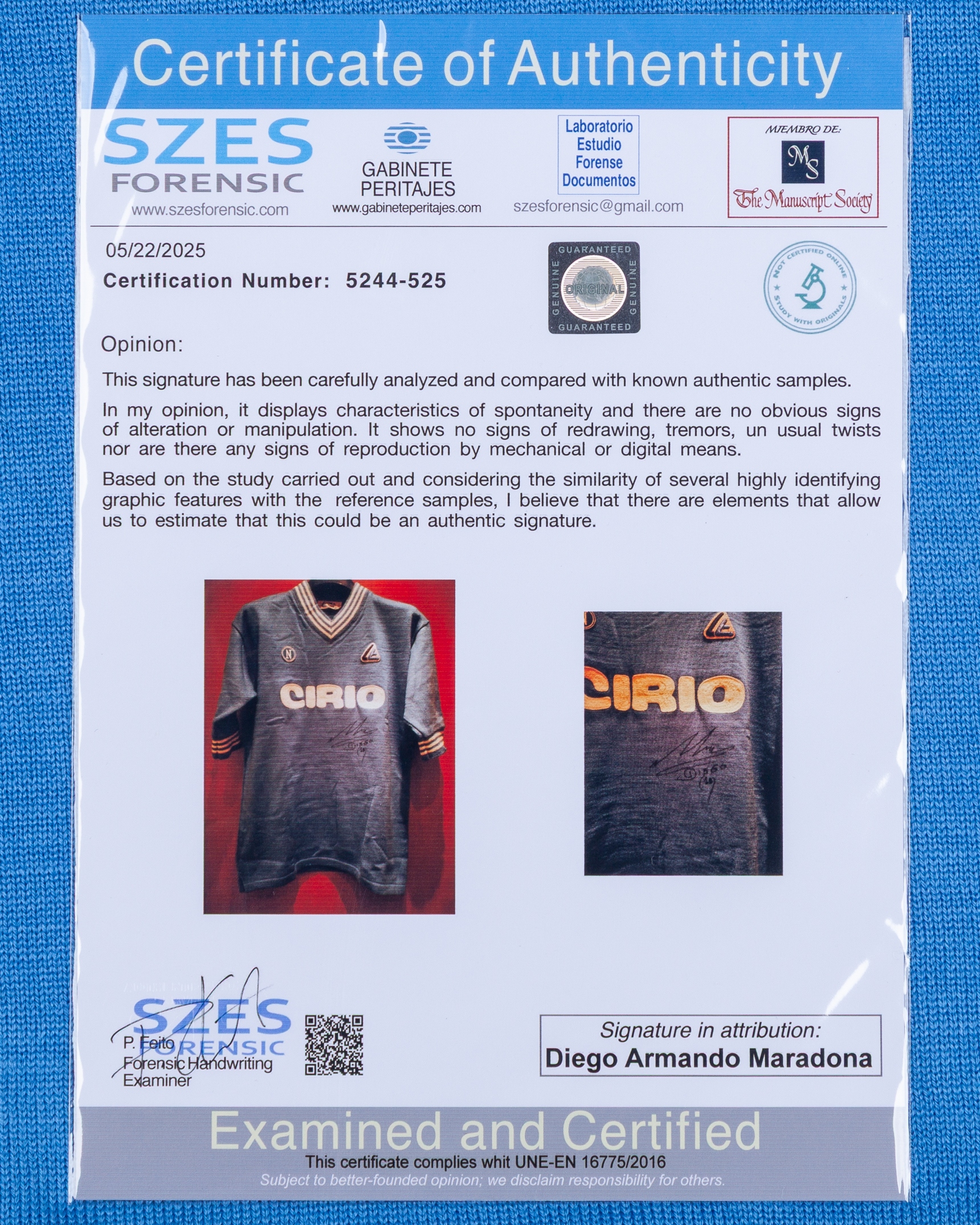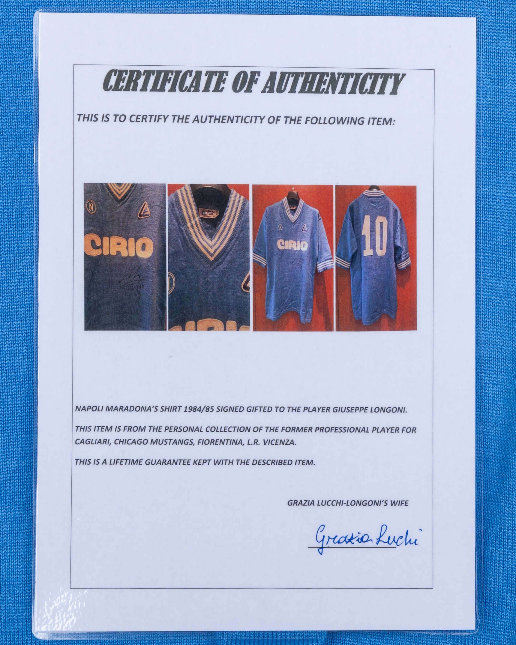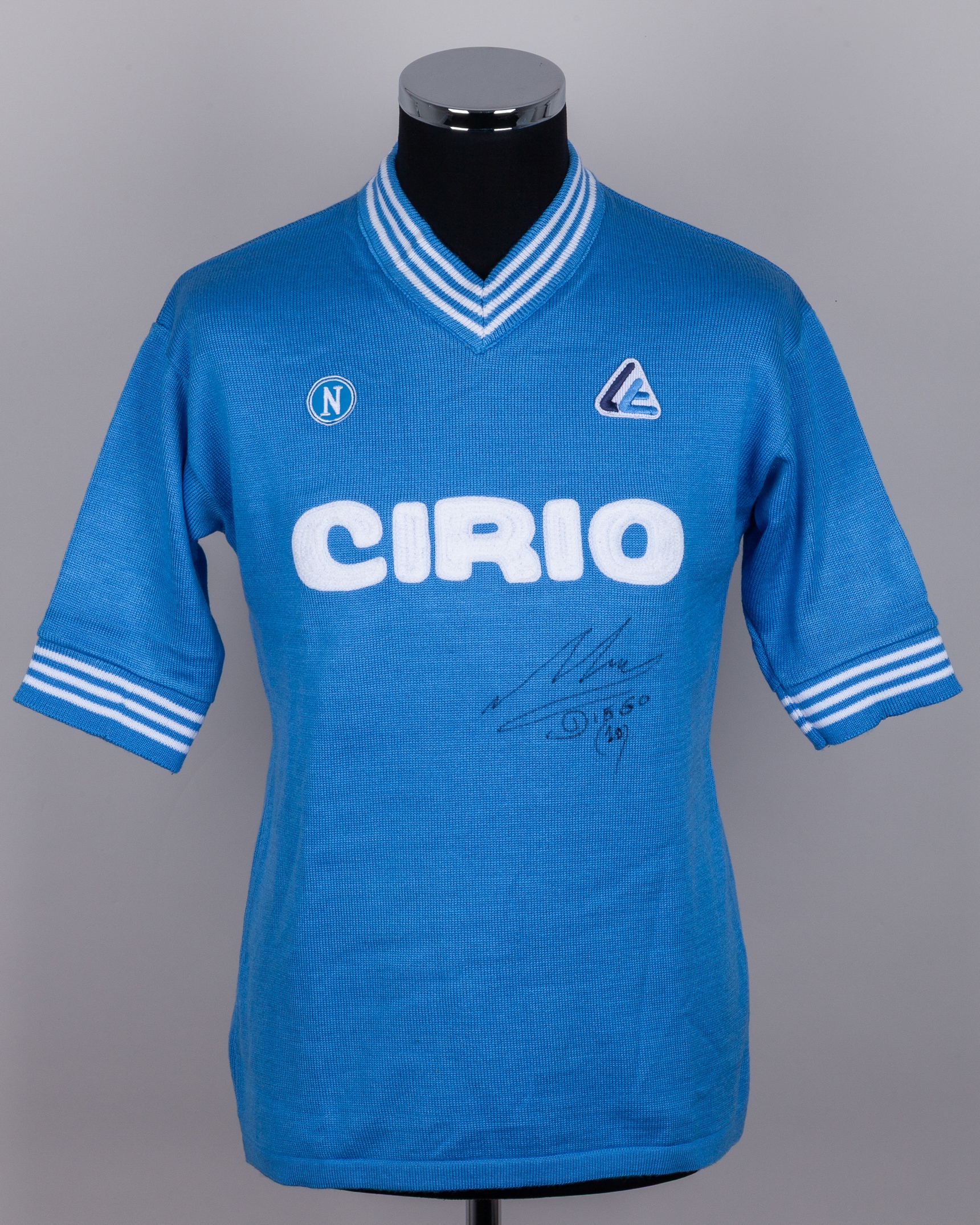 Diego Maradona autographed blue No.10 Napoli short-sleeved shirt, 1984-85, Linea Time, GB38, with v-neck collar and embroidered cloth badge, with signed COA from Giuseppe Longoni's wife and COA for the autograph, with staining by the number