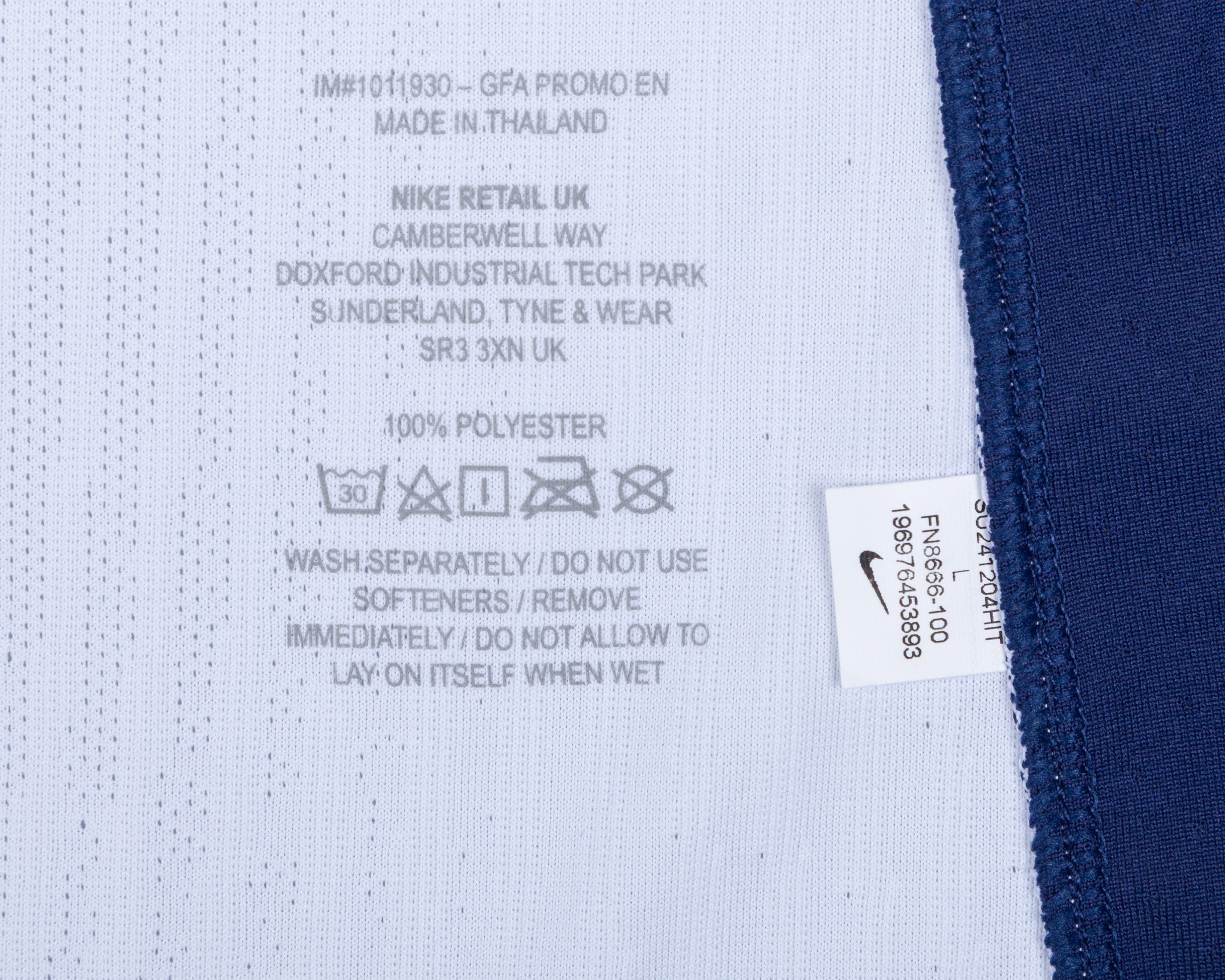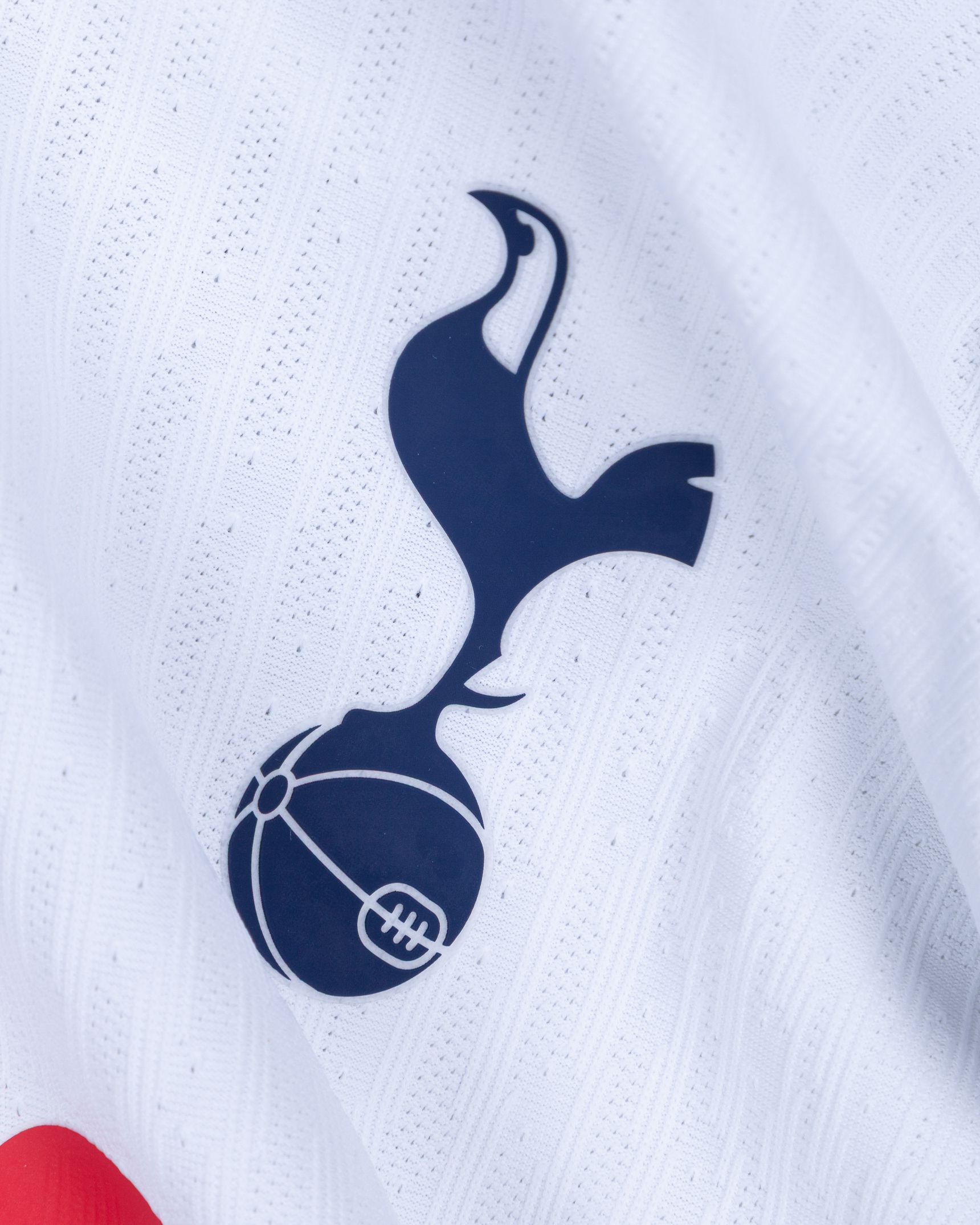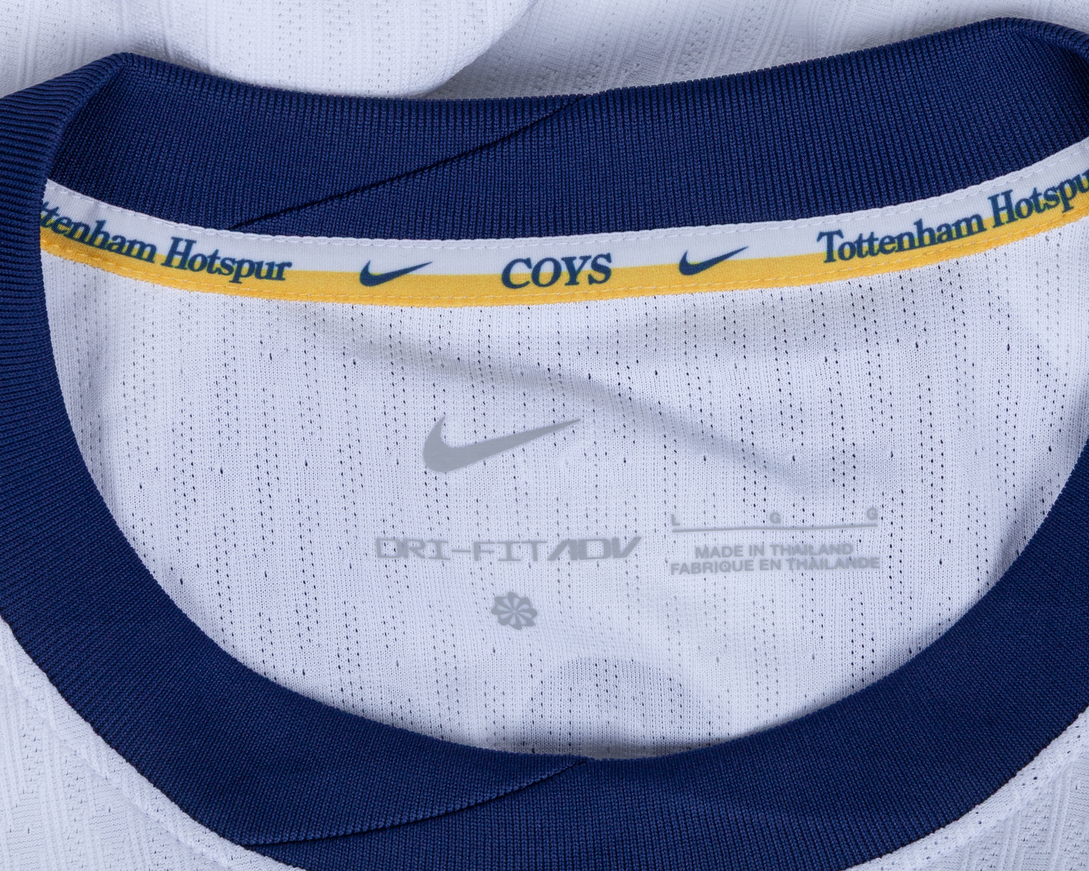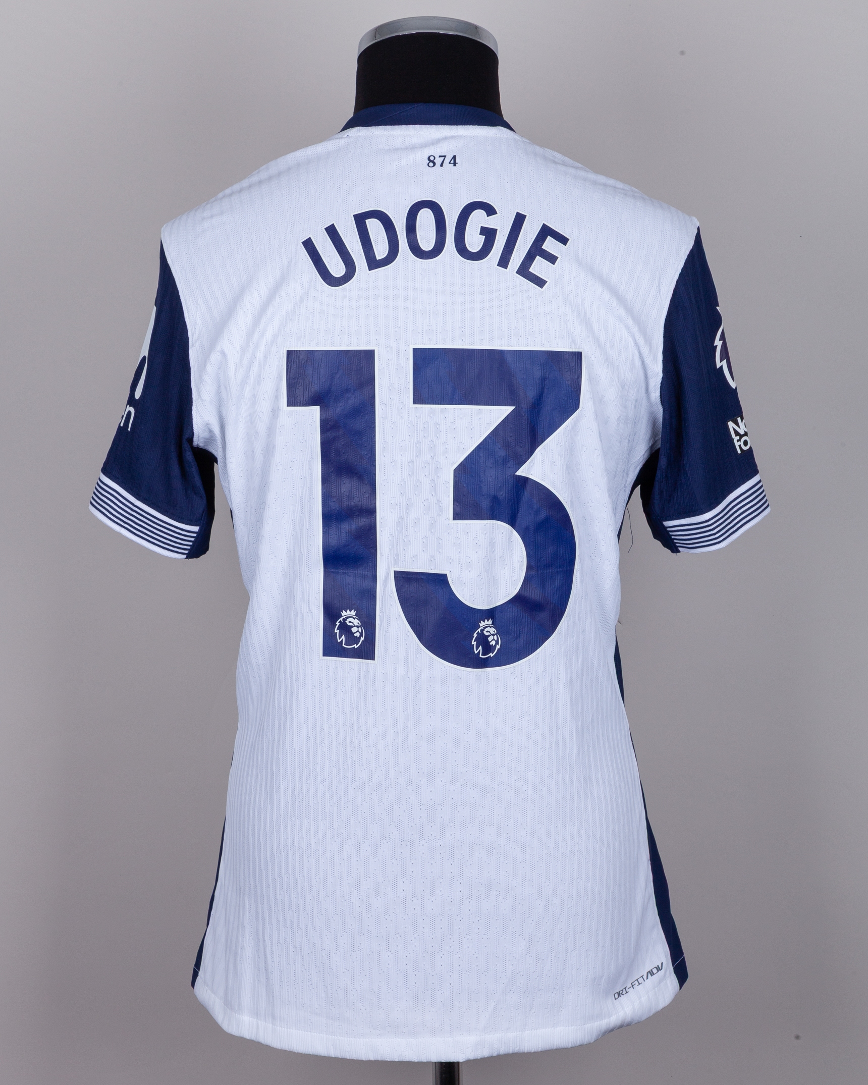 Destiny Udogie white and blue No.13 Tottenham Hotspur v. Manchester United match issued short-sleeved shirt, 2024-25, Nike, L, with crew-neck collar and printed badge, the reverse lettered UDOGIE, the right sleeve with Premier League flash