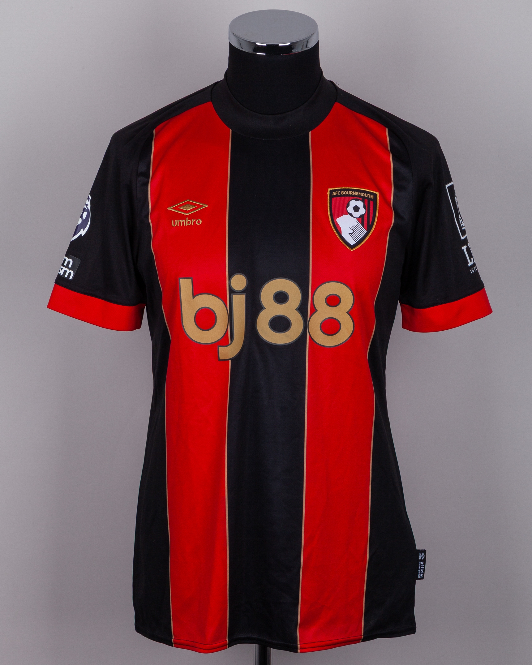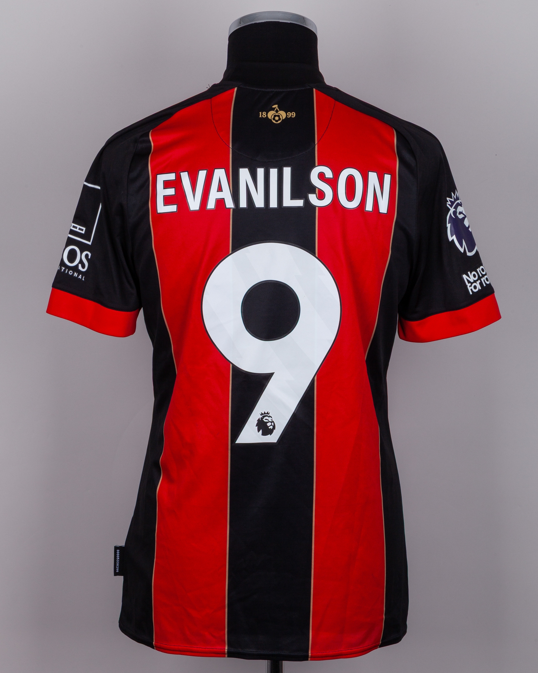 Evanilson red and black No.9 Bournemouth v. Tottenham Hotspur short-sleeved shirt, 2025, Umbro, M, with crew-neck collar and embroidered cloth badge inscribed AFC BOURNEMOUTH, the reverse lettered EVANILSON, the right sleeve with Premier League flash