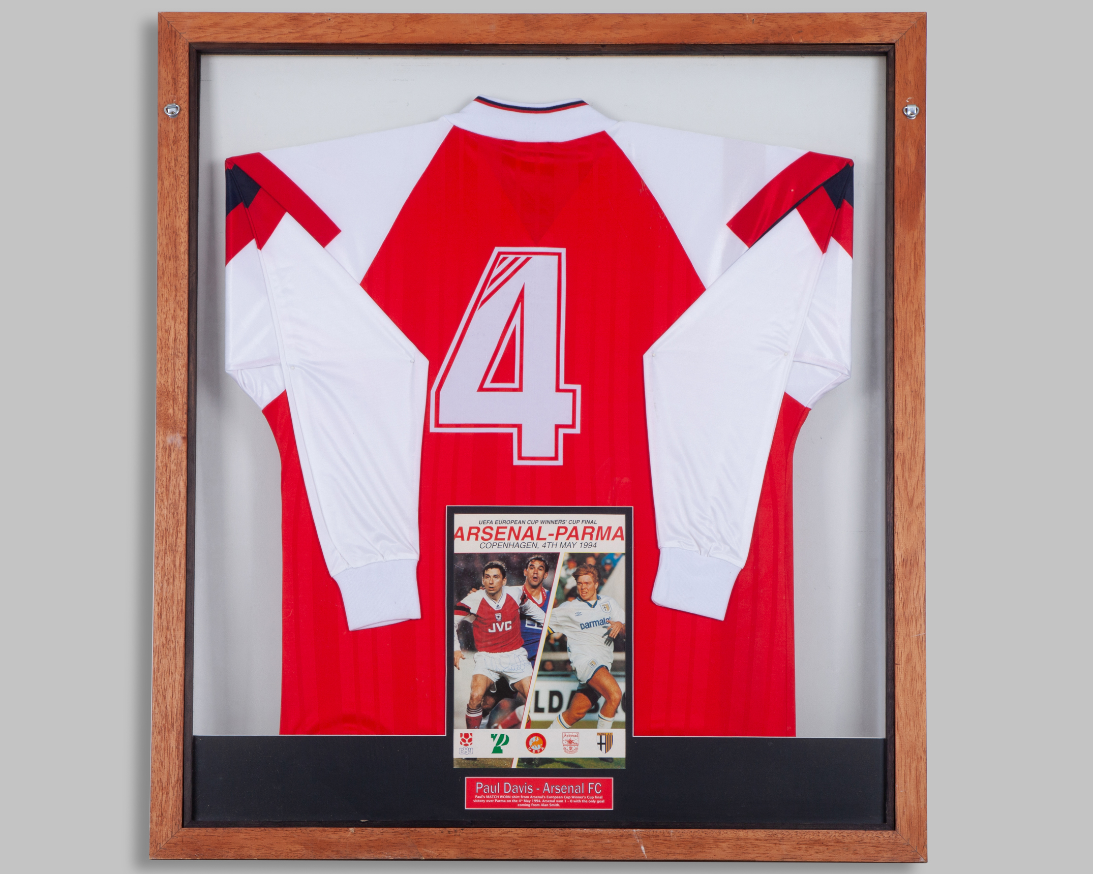 Paul Davies red and white No.4 Arsenal v. Parma European Cup Winners Cup match issued long-sleeved shirt, 1994, Adidas, 42/44, with v-neck collar and embroidered badge inscribed Arsenal, EUROPEAN CUP WINNERS CUP FINAL 1994, with programme cover, first day cover both autographed by Davies, ticket, all mounted in double-sided glass frame, 100 x 90cm overall