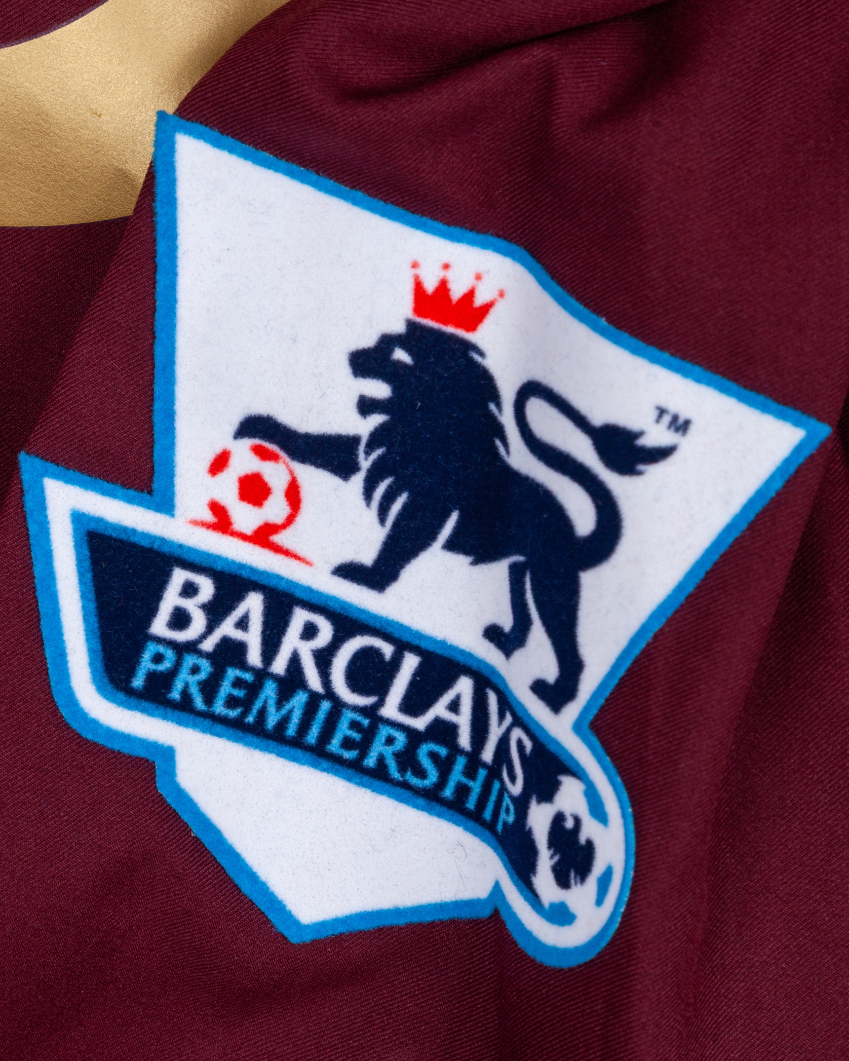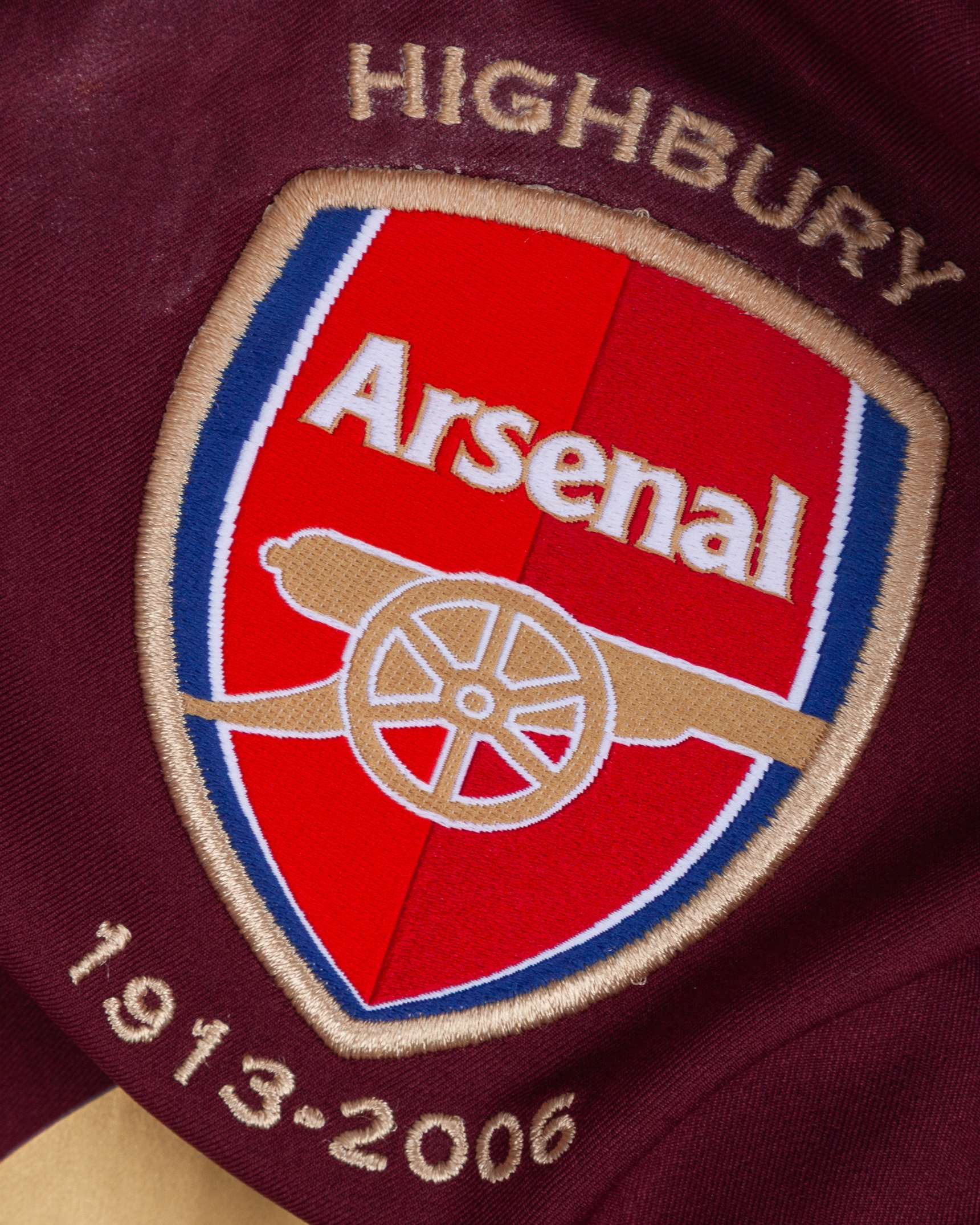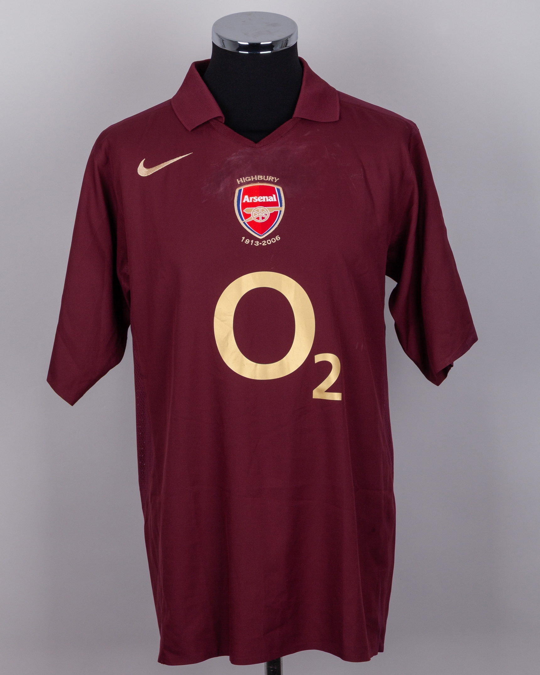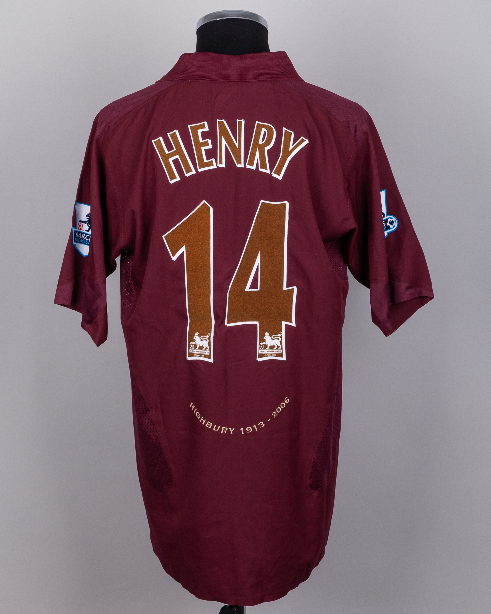 Thierry Henry redcurrant No.14 Arsenal short-sleeved shirt, 2005-06, Nike, L, with v-neck collar and embroidered cloth badge inscribed Arsenal HIGHBURY 1913-2006, the reverse lettered HENRY, the front of the shirt stained just above badge, the sleeves with Barclays Premiership flashes