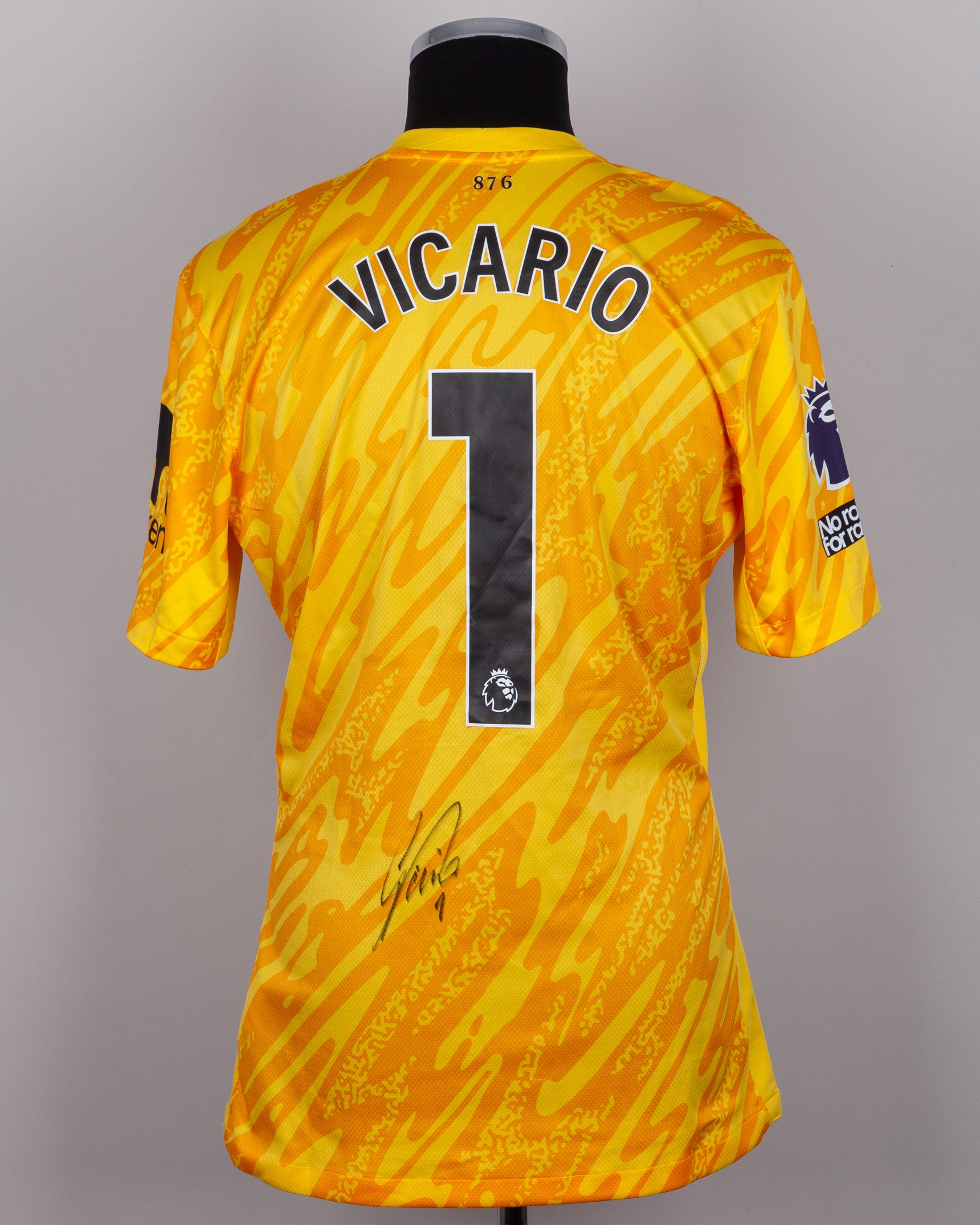 Guglielmo Vicario yellow No.1 Tottenham Hotspur goalkeepers shirt, Nike, L, with crew-neck collar and printed badge, the reverse lettered VICARIO, the right sleeve with Premier League flash