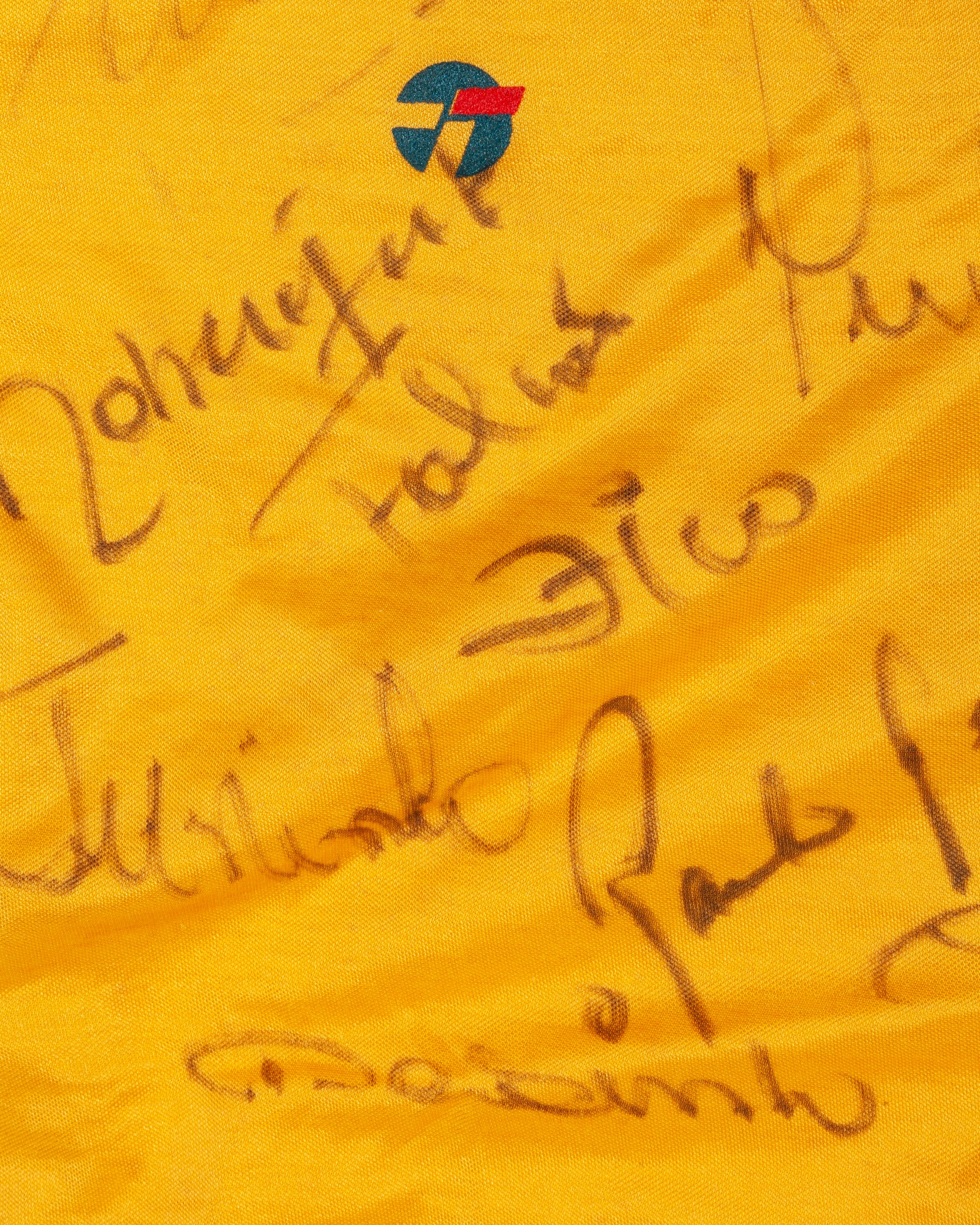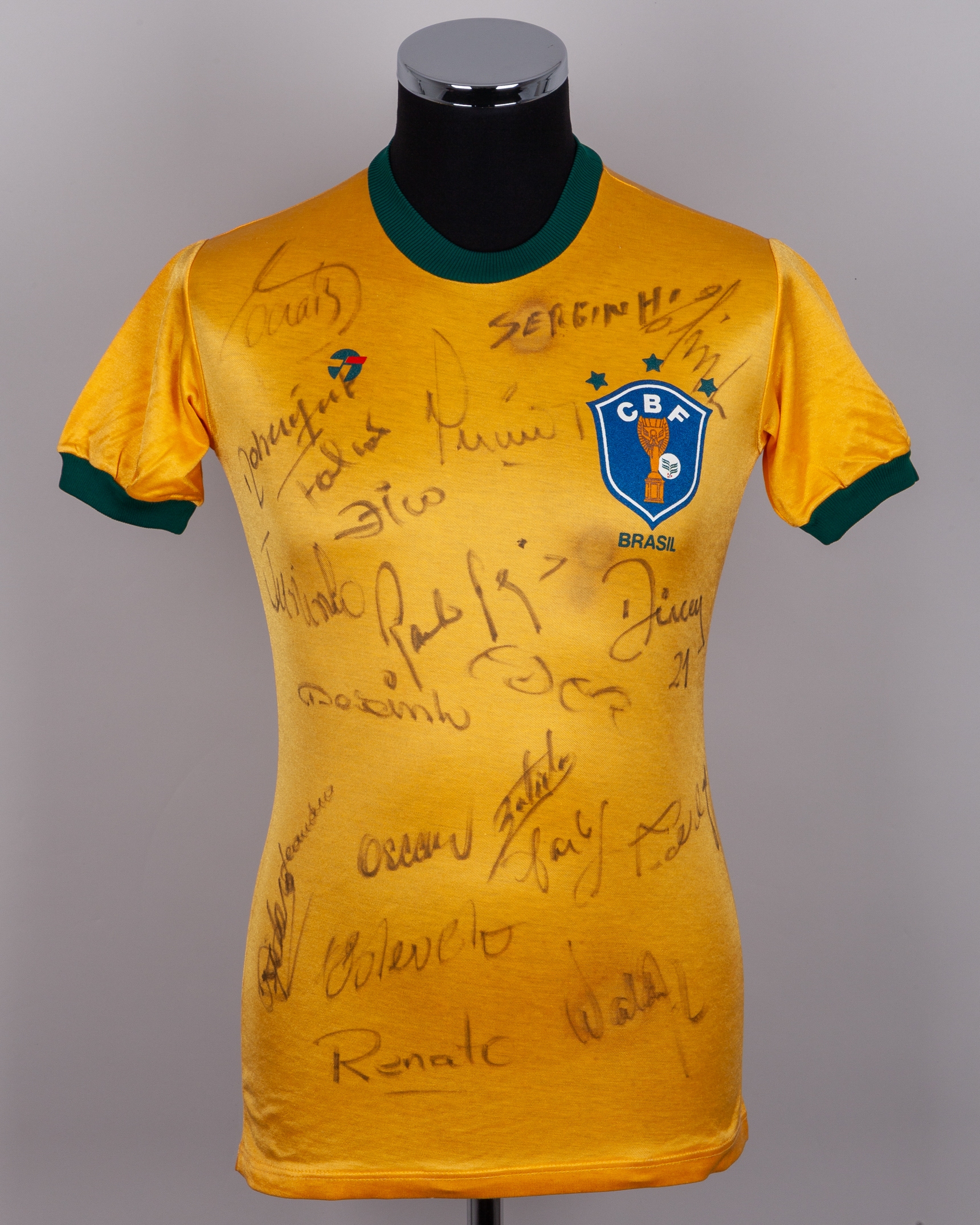 Silverware & Sporting Heritage: The December Live Auction Previous Next Lot 739 A yellow replica Brazil 1982 autographed short-sleeved shirtCurrent Bid:Estimate:£180 - £220Register to BidA yellow replica Brazil 1982 autographed short-sleeved shirt