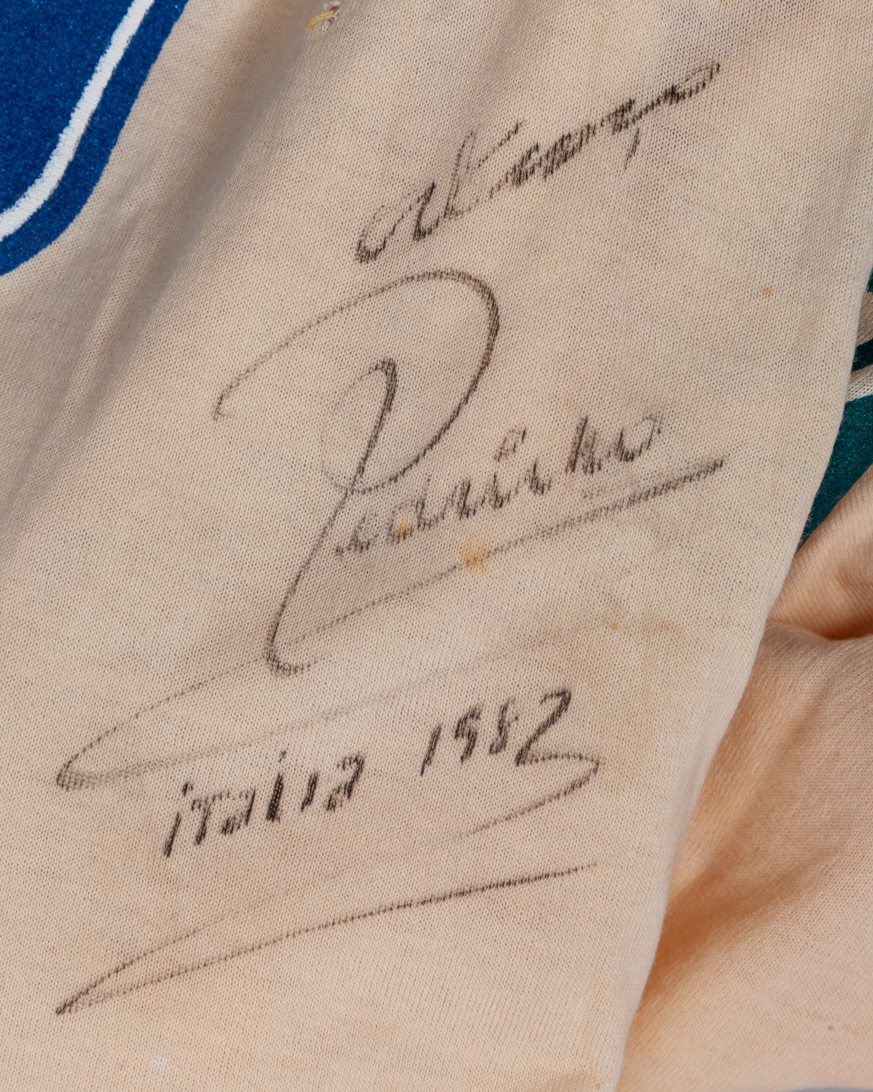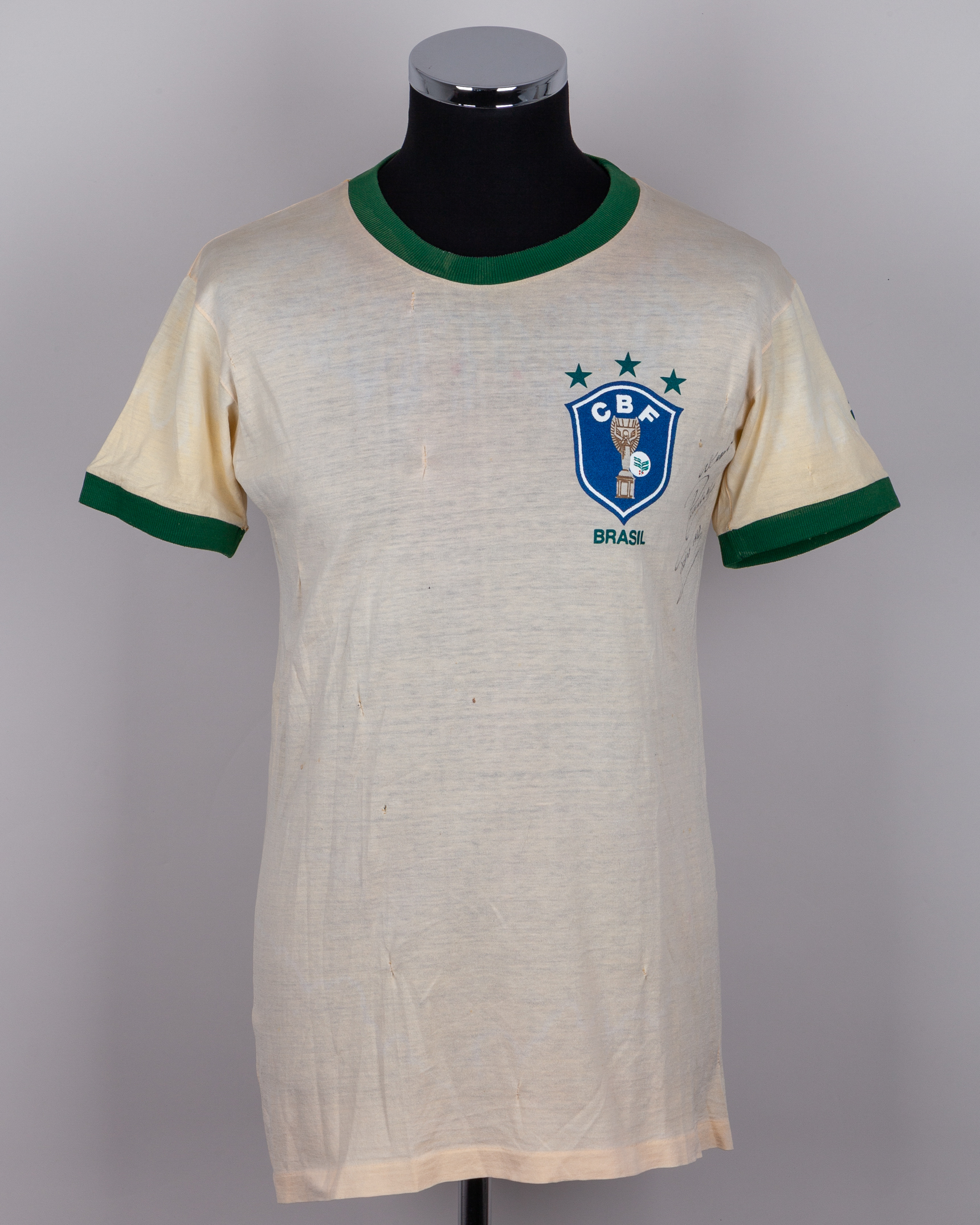 Pedrinho yellow and green No.17 Brazil 1982 World Cup short-sleeved shirt, Topper, 10, with crew-neck collar and printed badge, autographed and inscribed Italia 1982, very faded and with areas of repair