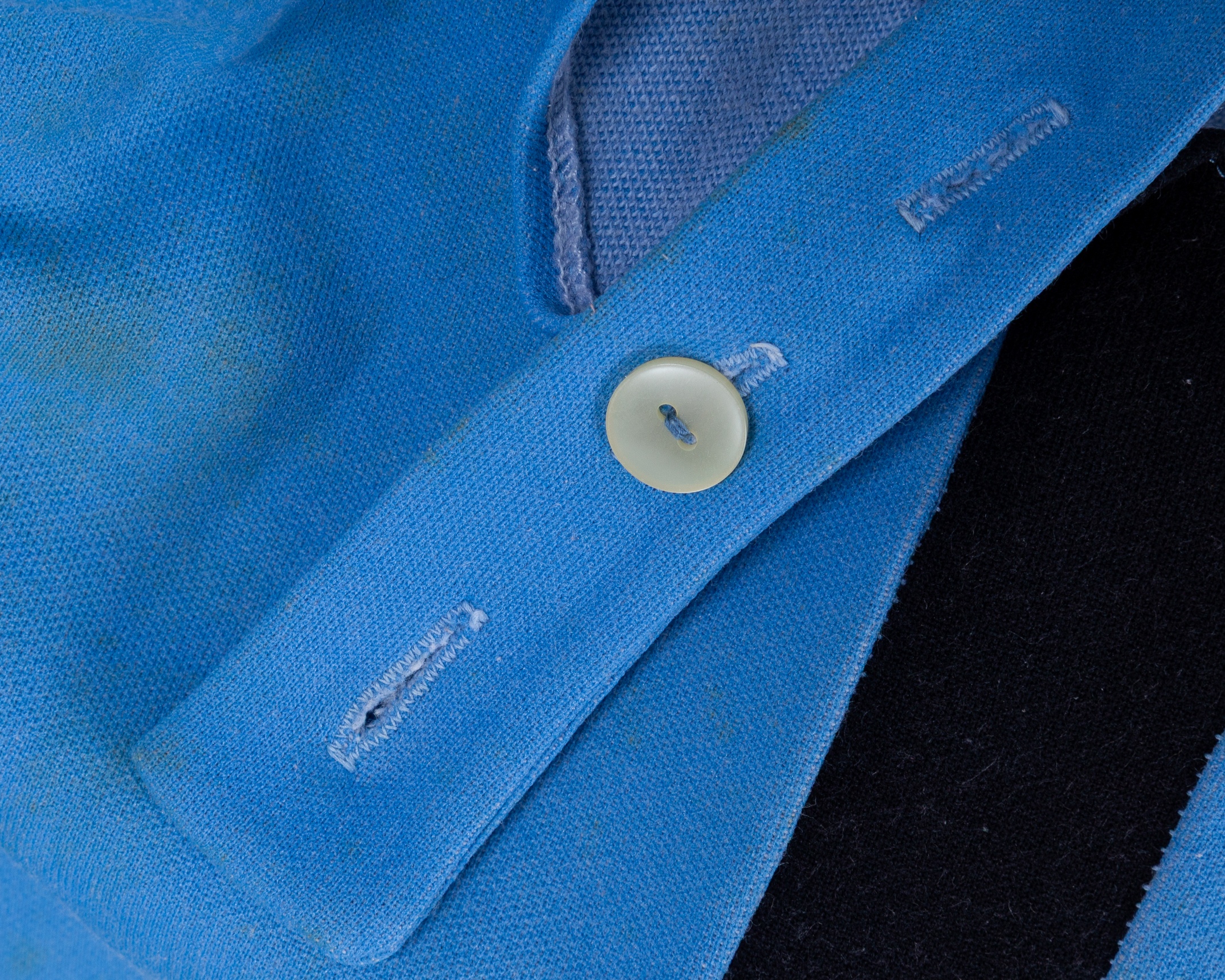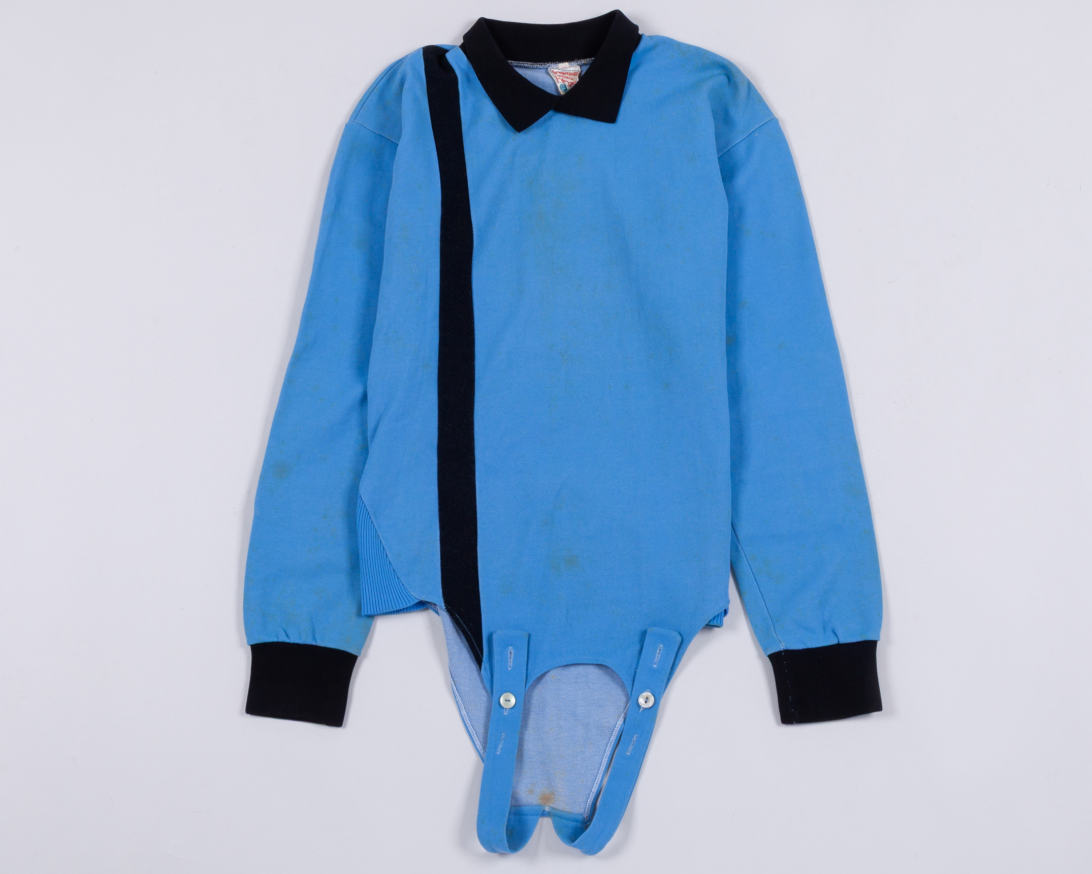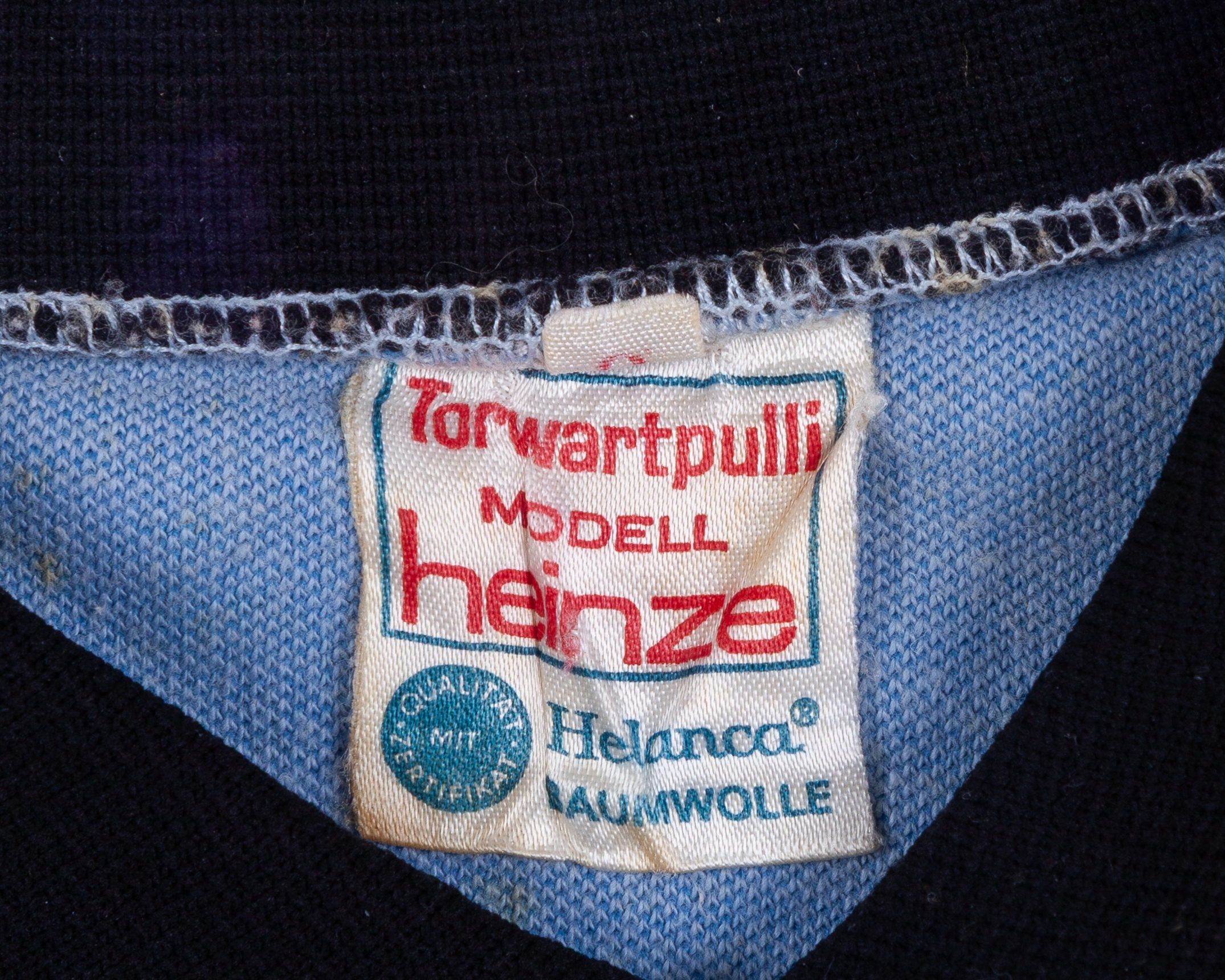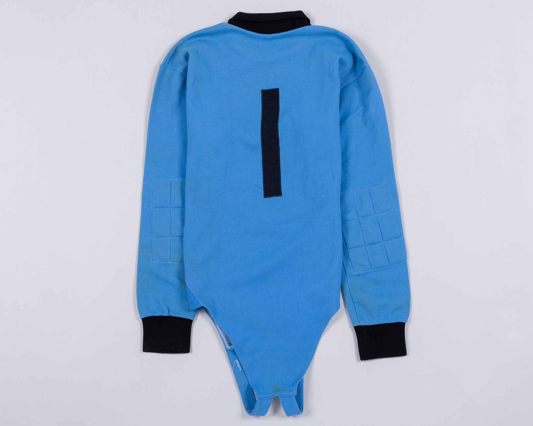 Sepp Maier sky-blue and black No.1 goalkeepers shirt, 1970s, Torwartpulli Modell Heinze, 6, with crew-neck style collar, with unusual leotard fixings, areas of staining