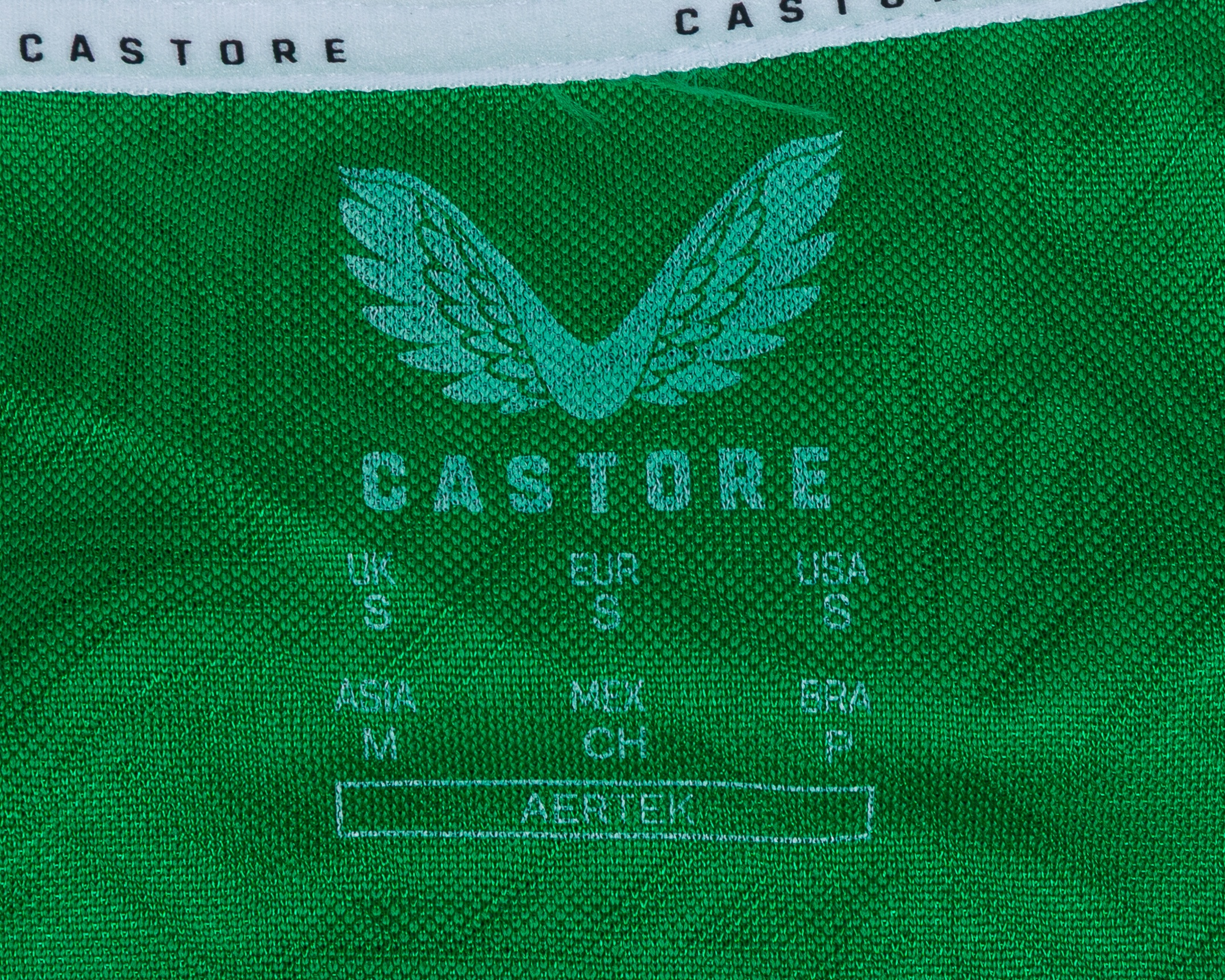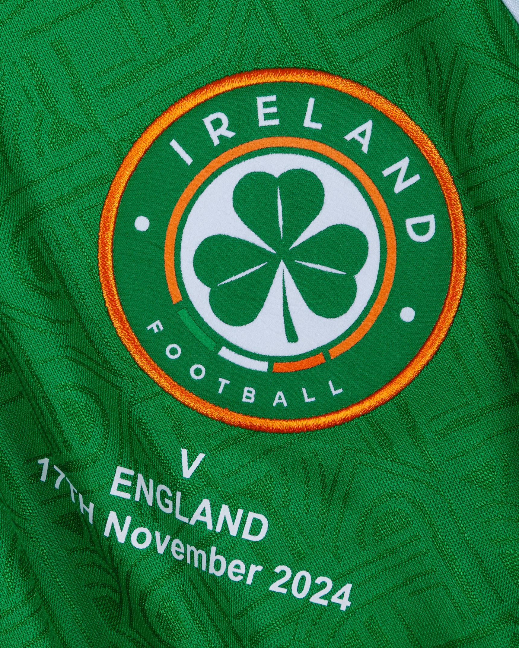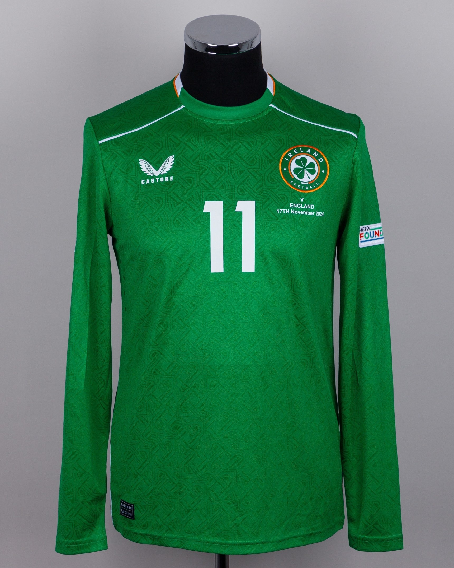 Michael Johnston green No.11 Republic of Ireland v. England match issued short-sleeved shirt, 2024, Castore, S, with crew-neck collar and embroidered cloth badge inscribed IRELAND FOOTBALL with V ENGLAND 17TH November 2024 decal, the reverse lettered JOHNSTON, the sleeves with National League and UEFA Foundation flashes