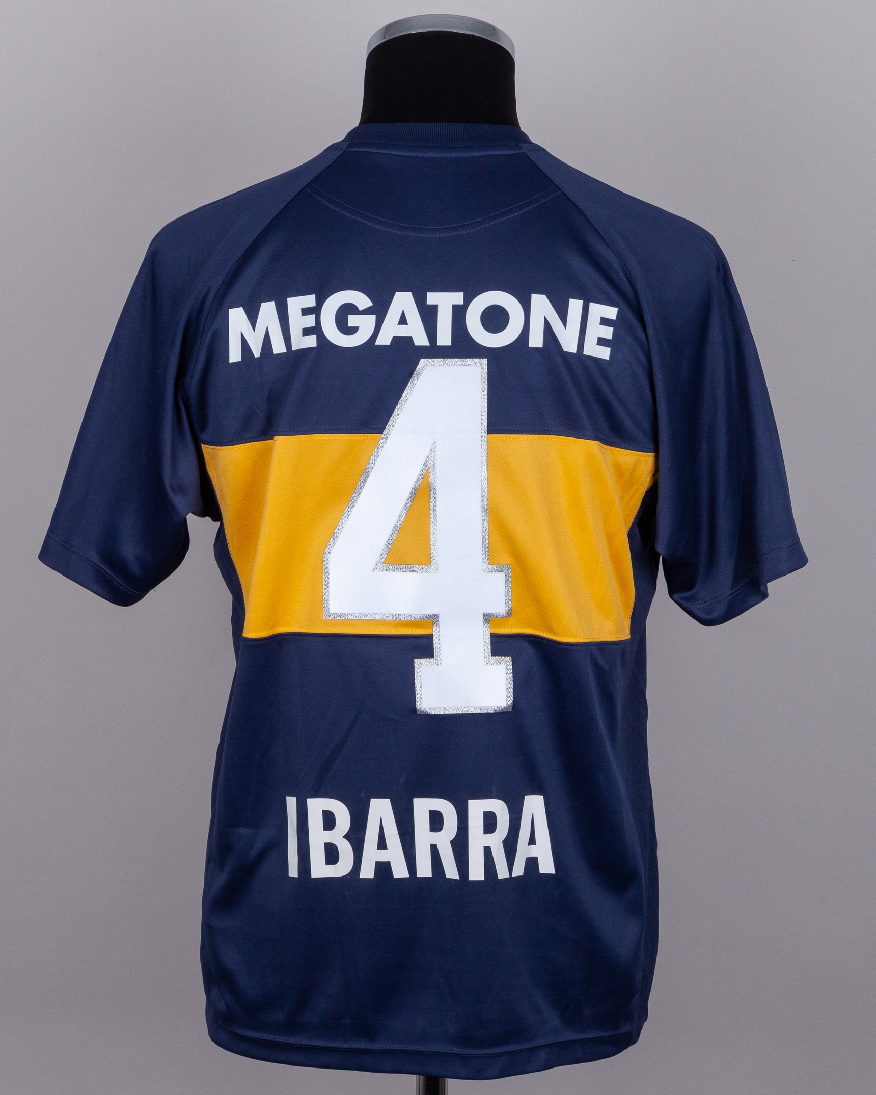 Ibarra yellow and blue No.4 Boca Juniors v. Fluminense match issued short-sleeved shirt, 2008, Nike, M, with v-neck collar and embroidered badge inscribed CABJ, the reverse lettered IBARRA