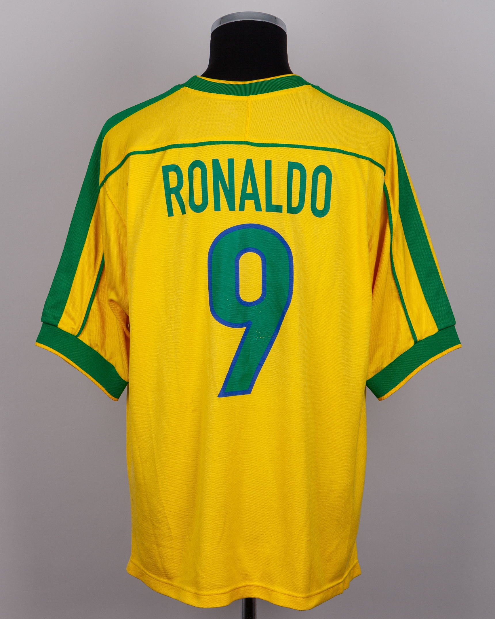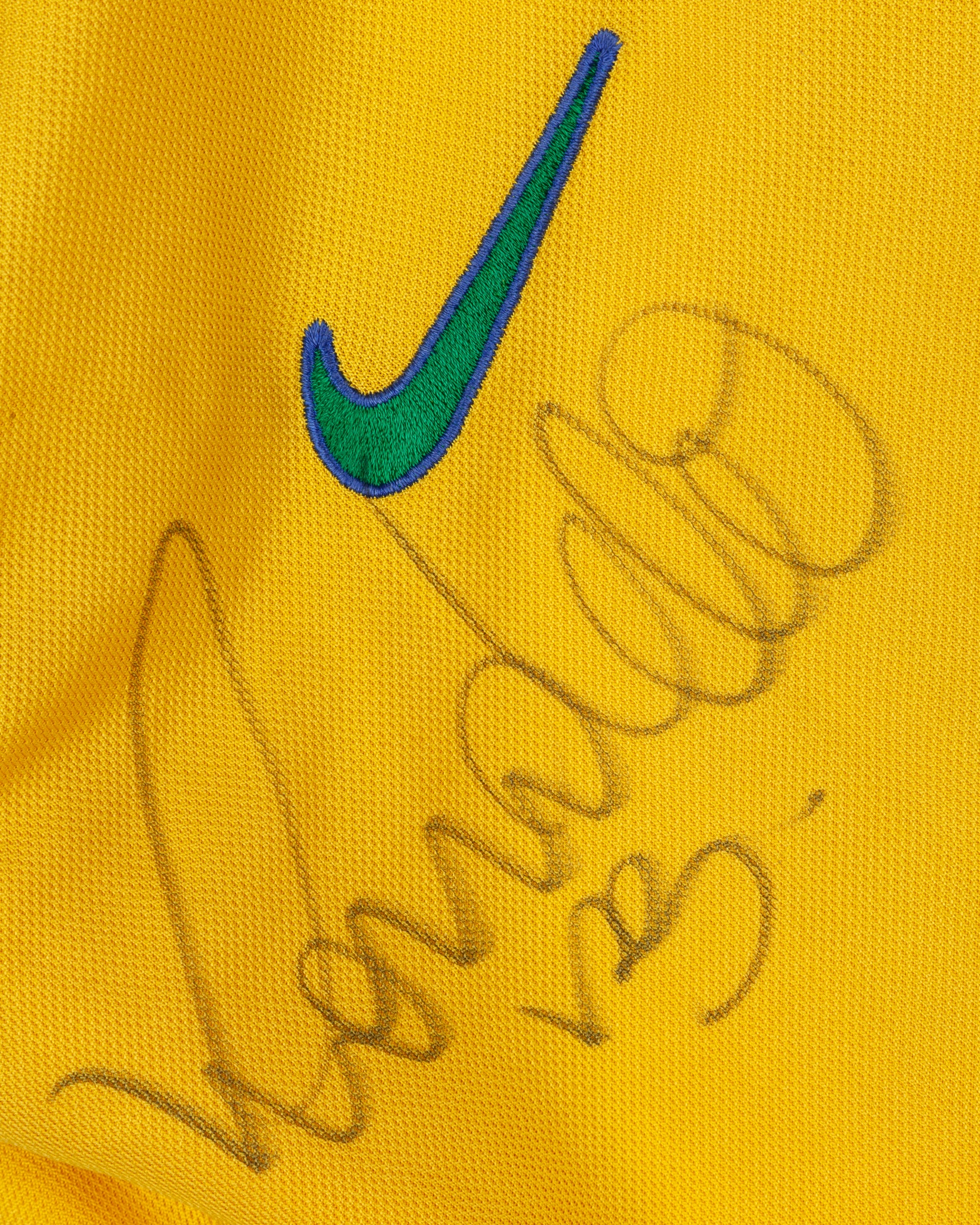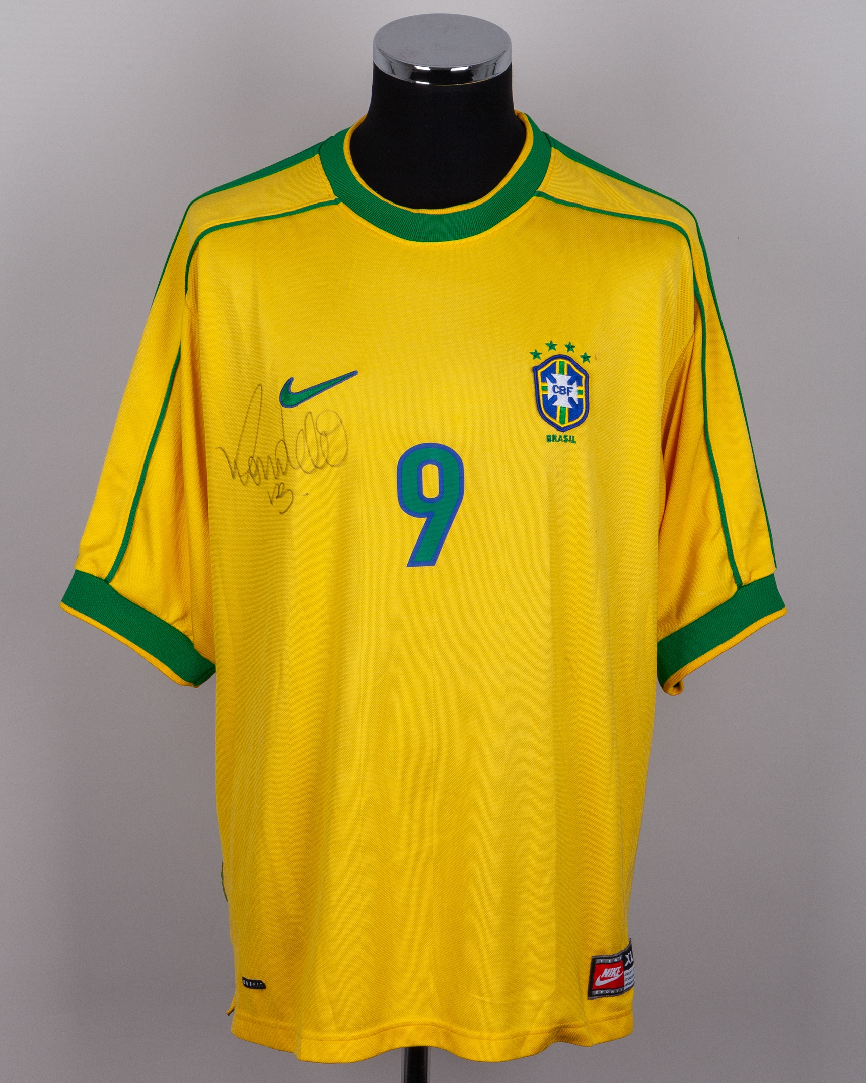 A Ronaldo autographed Brazil replica short-sleeved shirt, the front of the shirt autographed