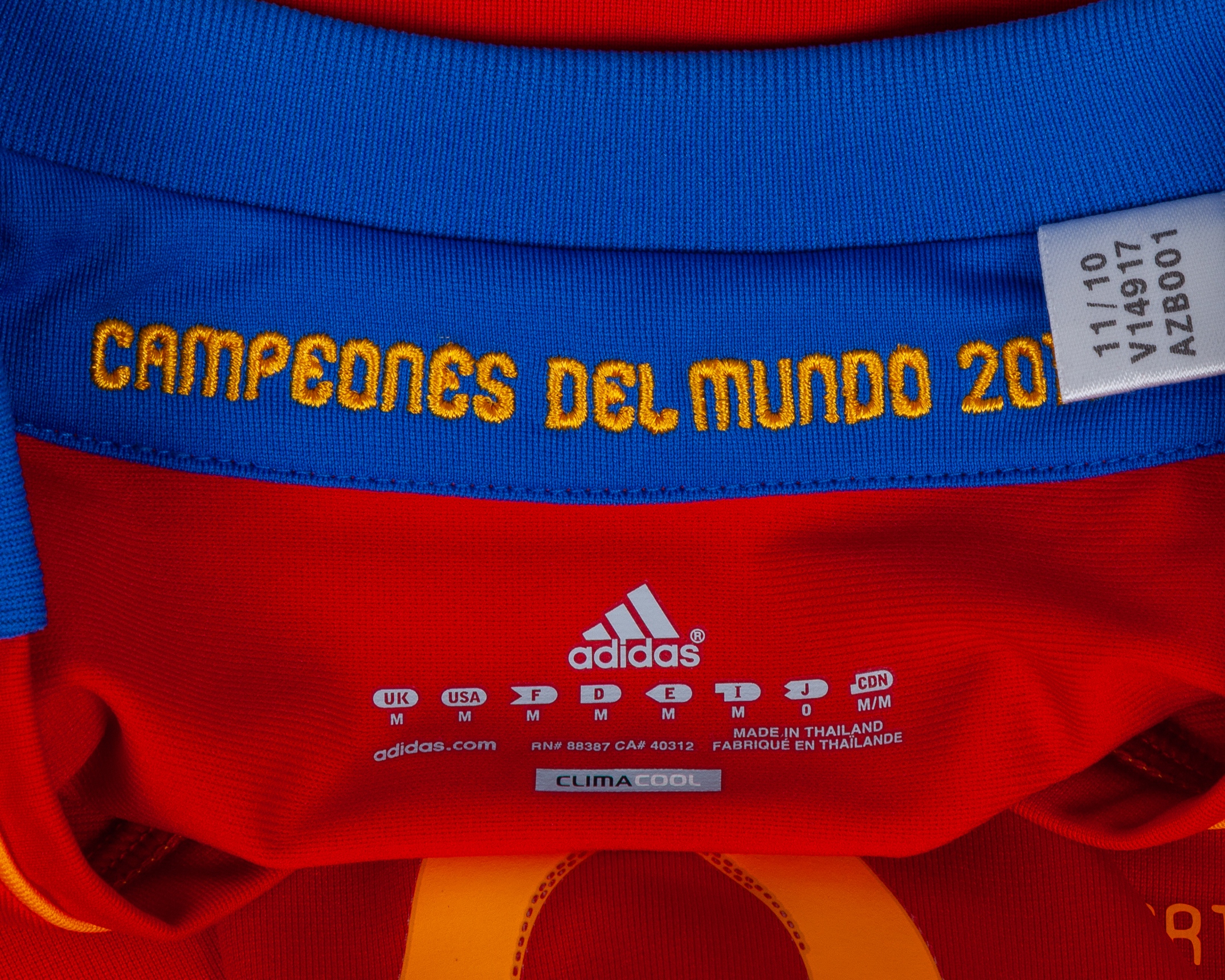 Iniesta red and blue No.6 Spain v. Portugal match issued long-sleeved shirt, 2010, Adidas, M, with v-neck collar and embroidered cloth badge, with PORTUGAL - ESPANA 17 DE NOVIEMBRE, 2010 LISBOA decal, the reverse lettered A. INIESTA, the right sleeve with Spain & Portugal - 2018-2022 flash
