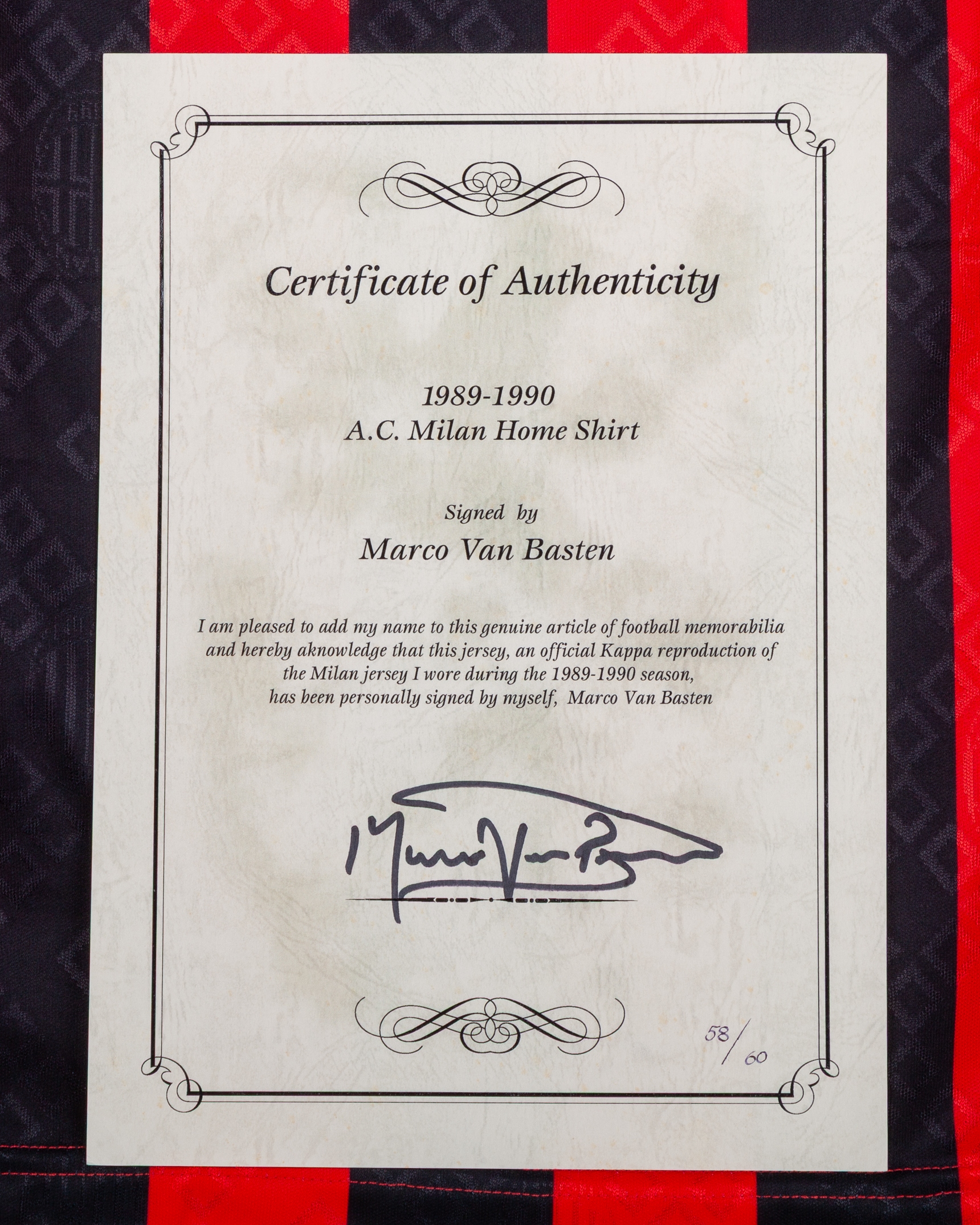 A Marco Van Bastin autographed AC Milan replica short-sleeved shirt, the number autographed, No.58 of a limited edition of 60, with COA