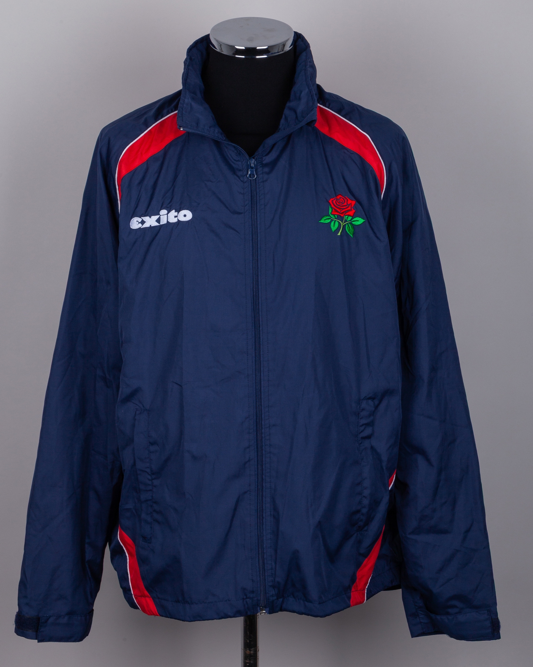 Jimmy Anderson Lancashire County Cricket worn training jacket, Exito, L, with zip-up front and embroidered badge and another worn example by Kukri, XL with zip up front and decal rose (2)