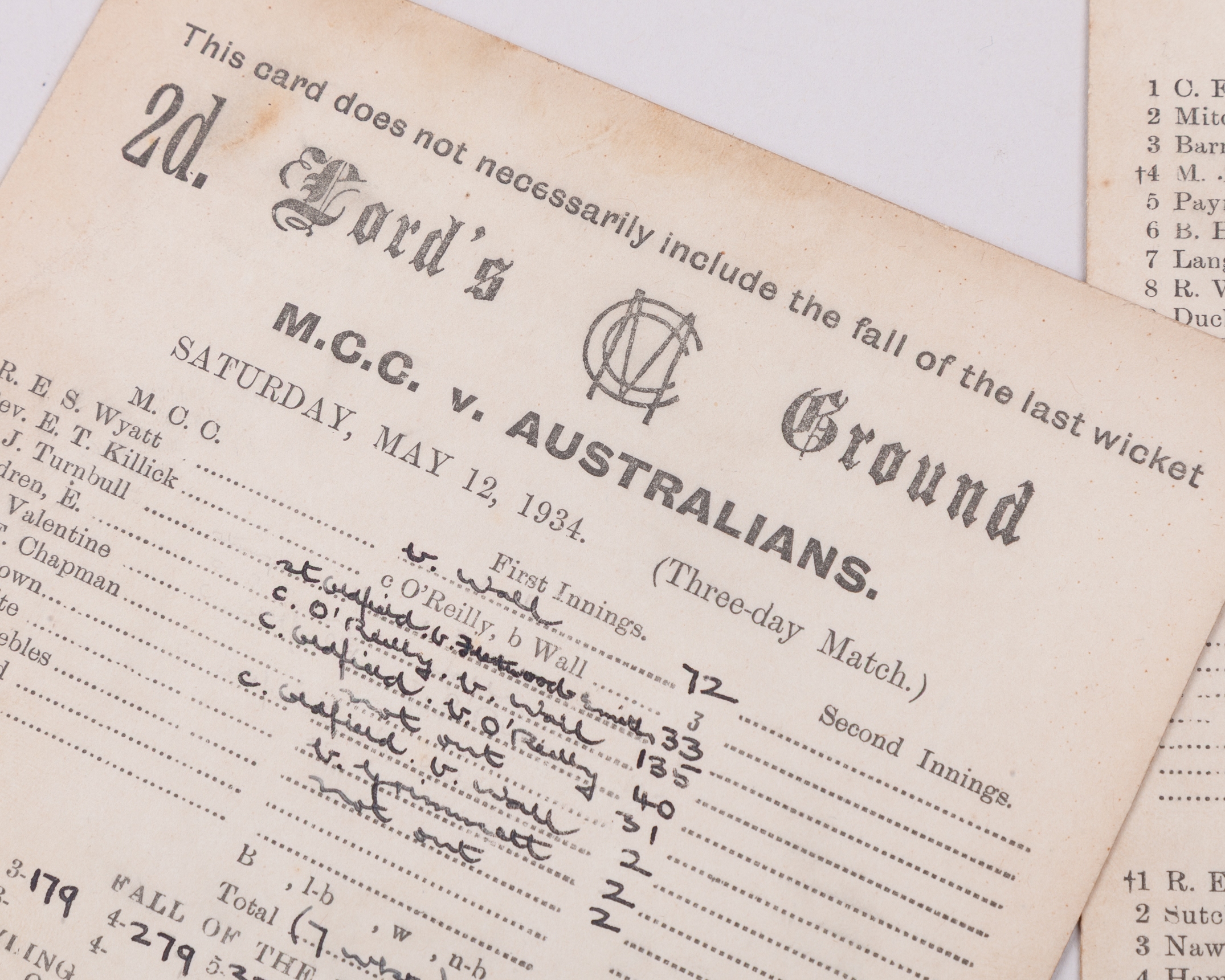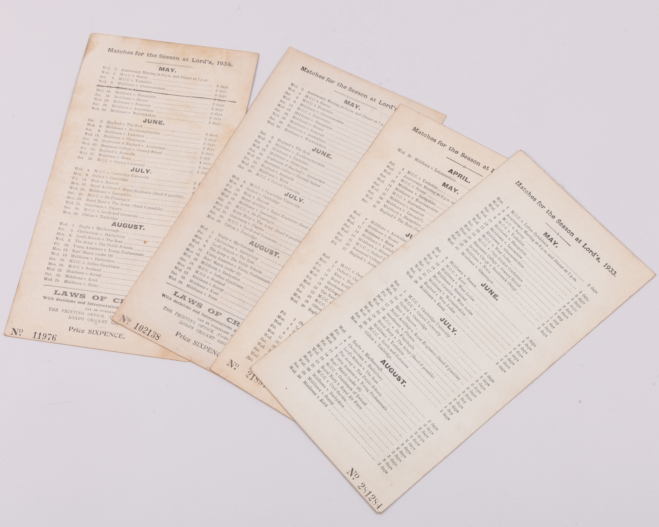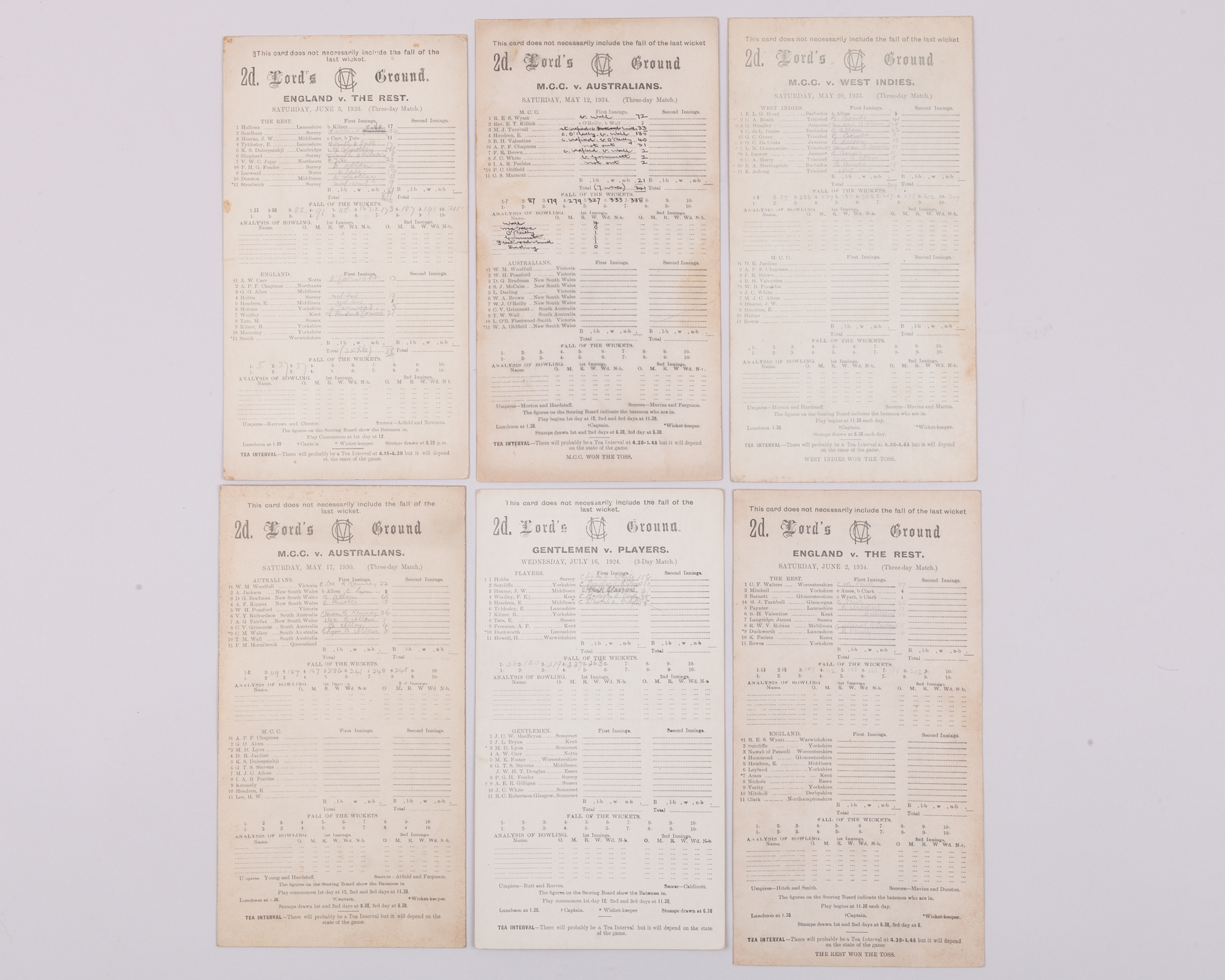 Six Lords score cards, 1924-1934, comprising Gentleman v. Players, 16th July 1924, England v. The Rest, 5th June 1926, M.C.C. v. Australians, 17th May 1930, M.C.C. v. West Indies, 20th May 1933, M.C.C. v. Australians, 12th May 1934 and England v. The Rest, 2nd June 1934 (6)