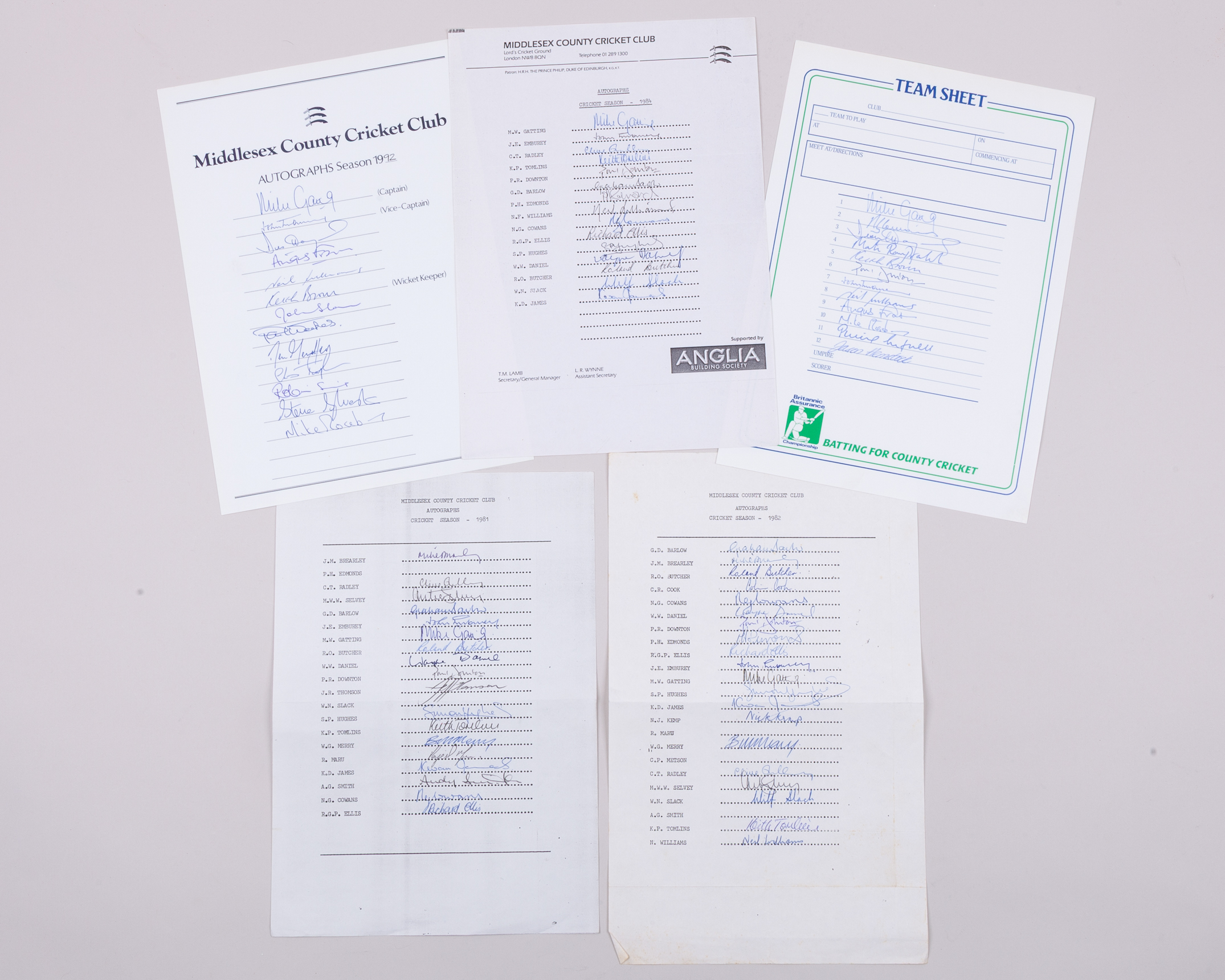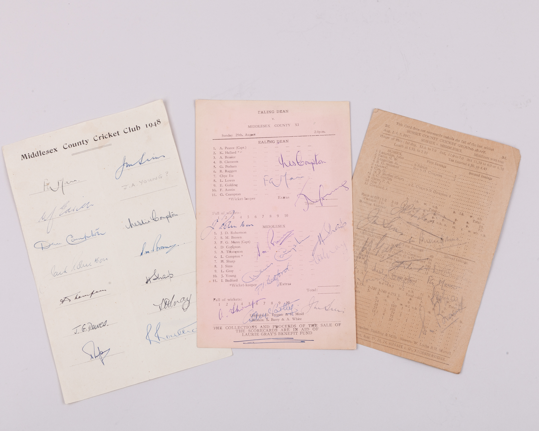 Three Middlesex autographed scorecards, 1947 and 1948 and five other Middlesex autographed team sheets including Denis Compton (8)