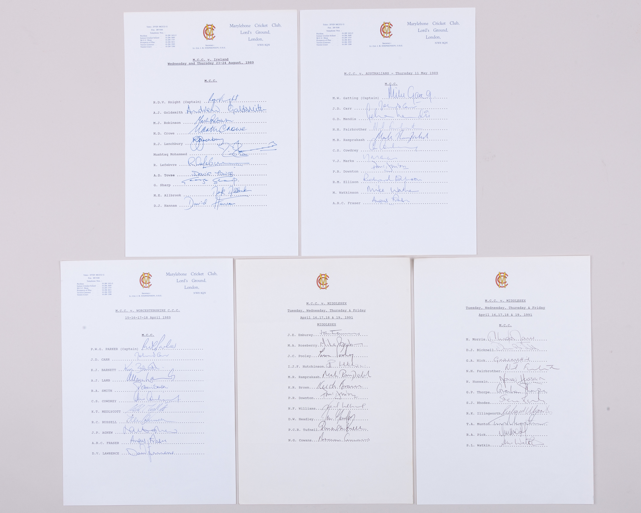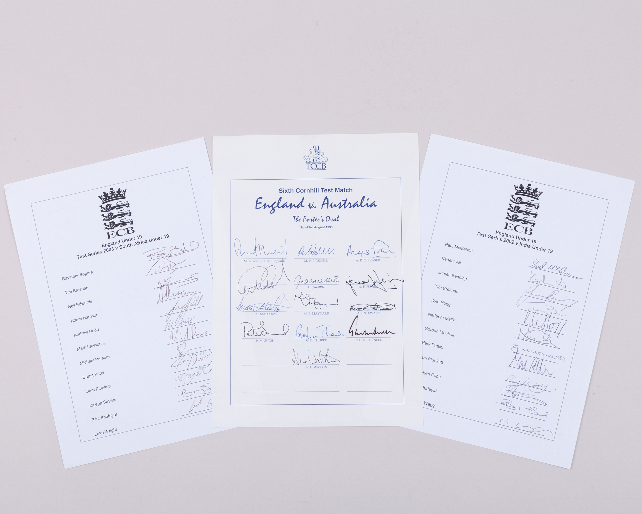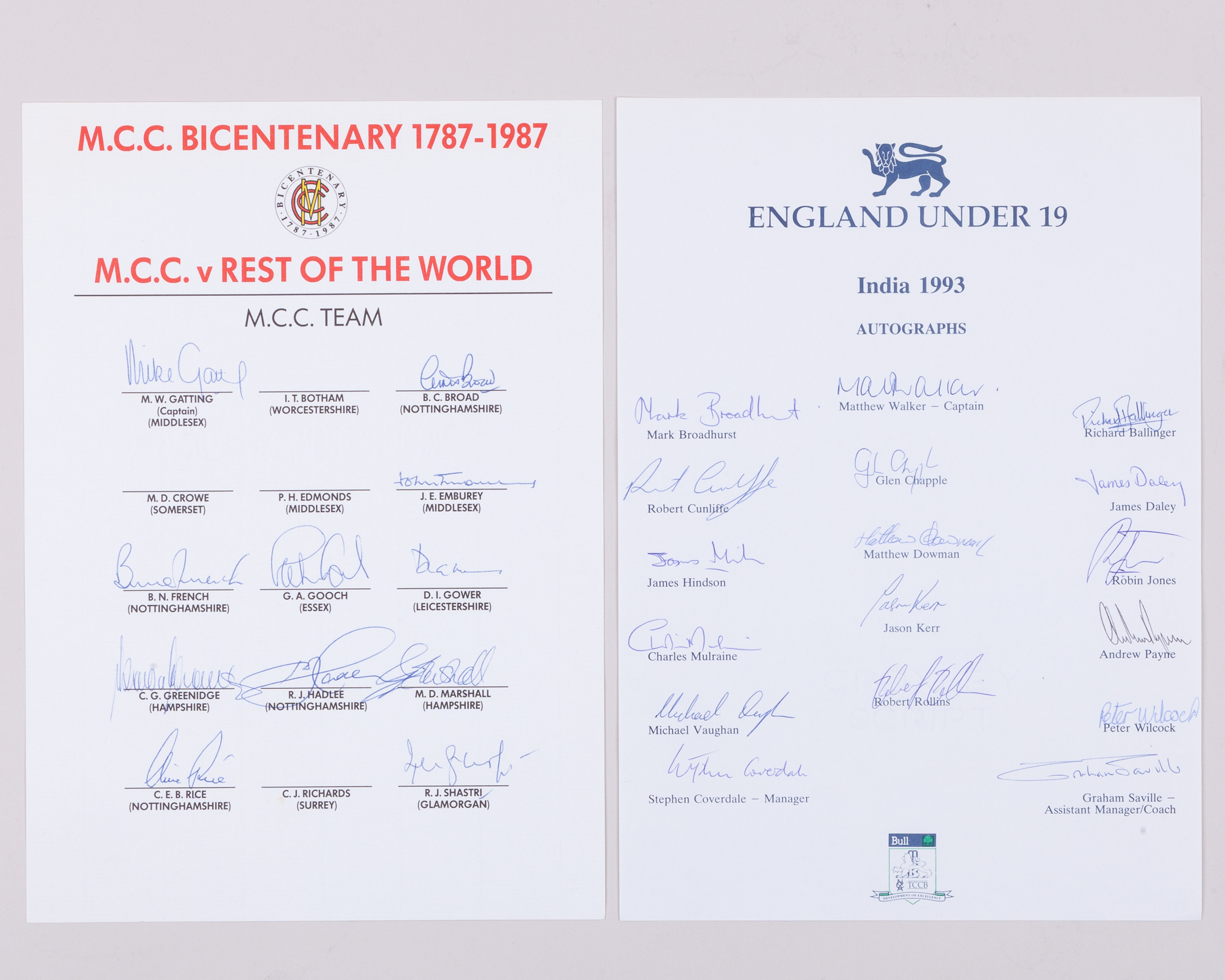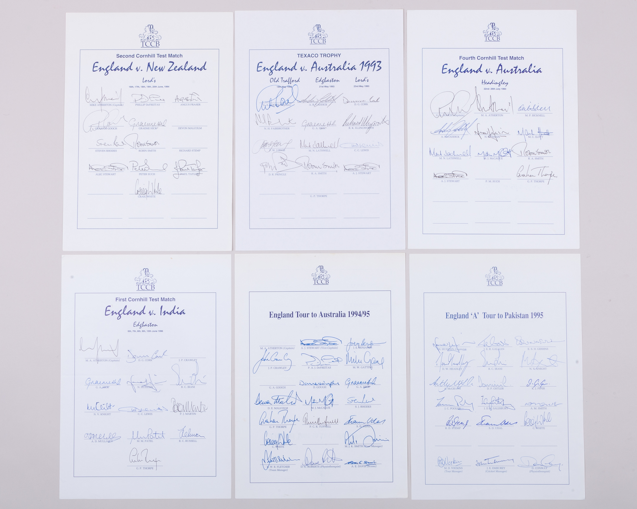 Ten England autographed team sheets from 1993, comprising Australia, July 1993, August 1993, New Zealand, 1994, Pakistan ‘A’ 1995, Australia, 1994/95, India, 1996 etc and M.C.C. v. Australians, 11th May 1989, v. Ireland, August 1989 etc (a lot)