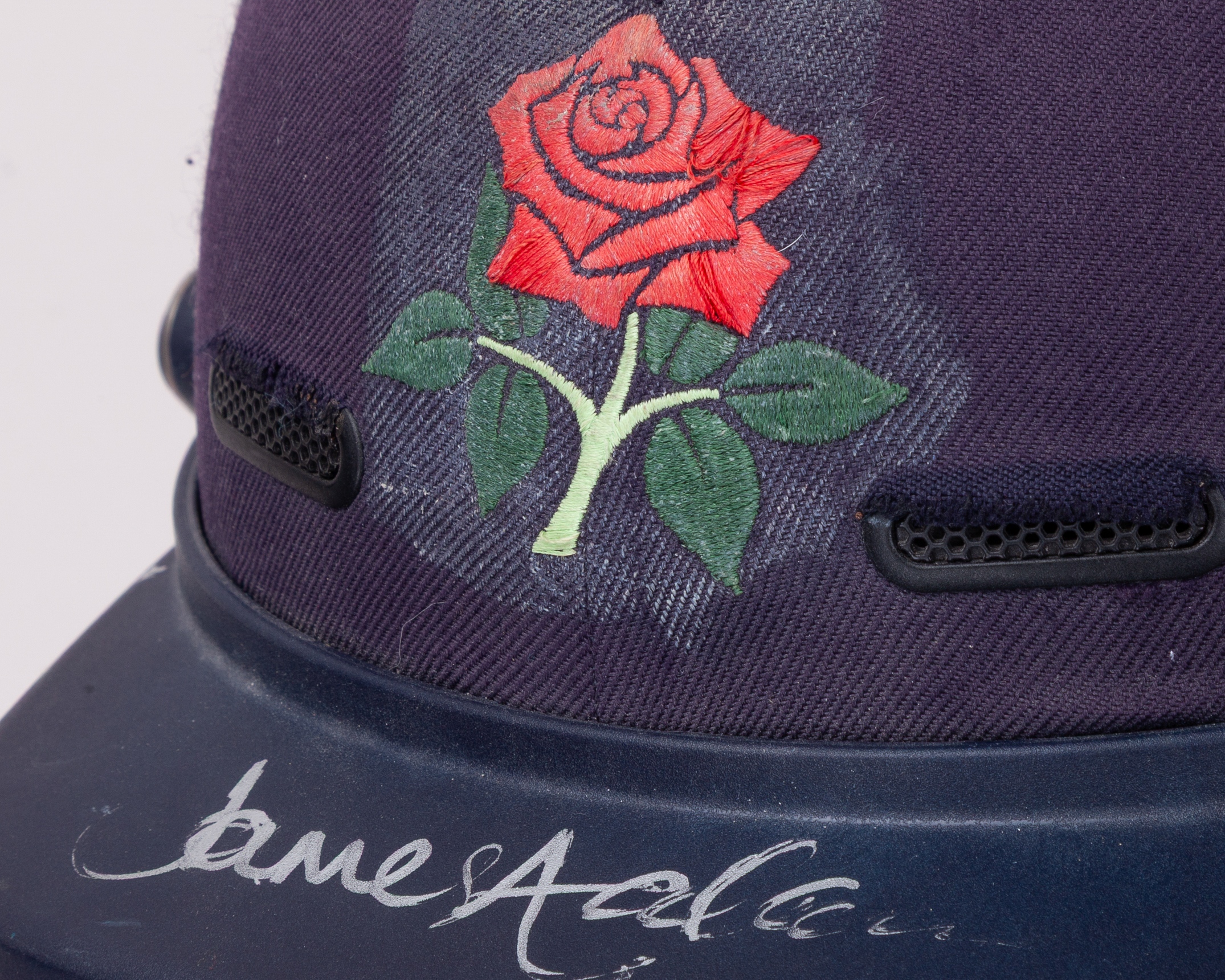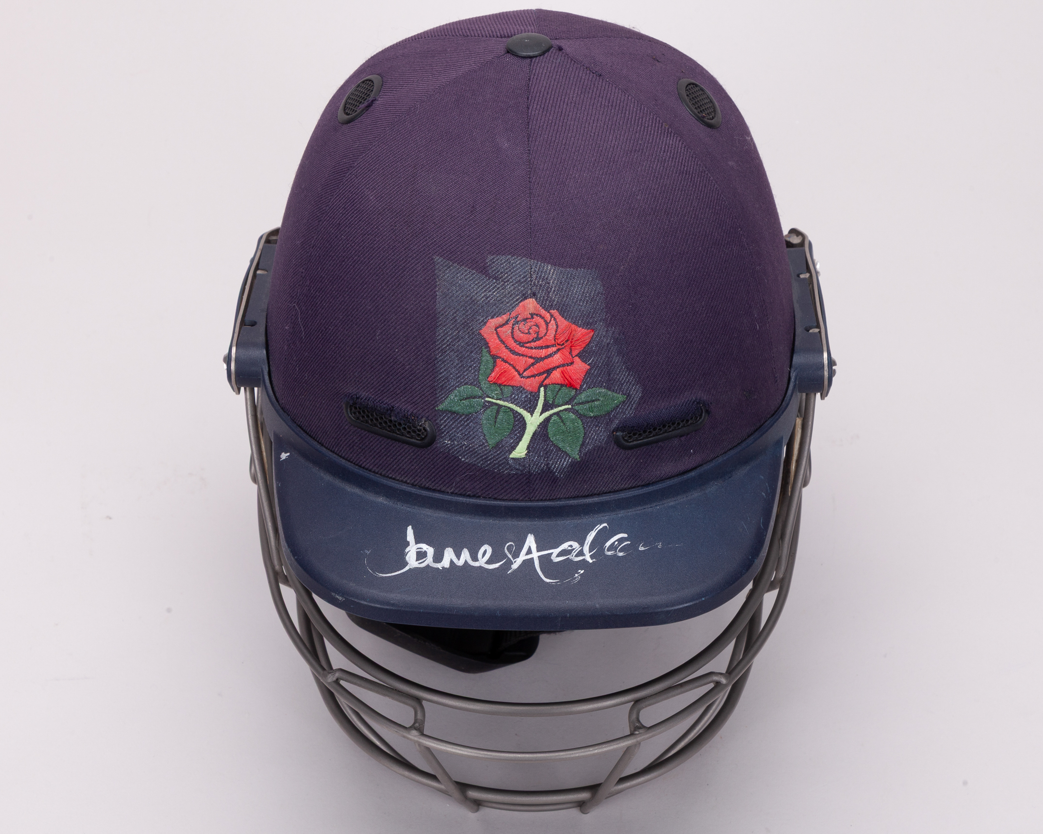An autographed Jimmy Anderson Masuri cricket helmet, with Lancaster crest, the peak signed