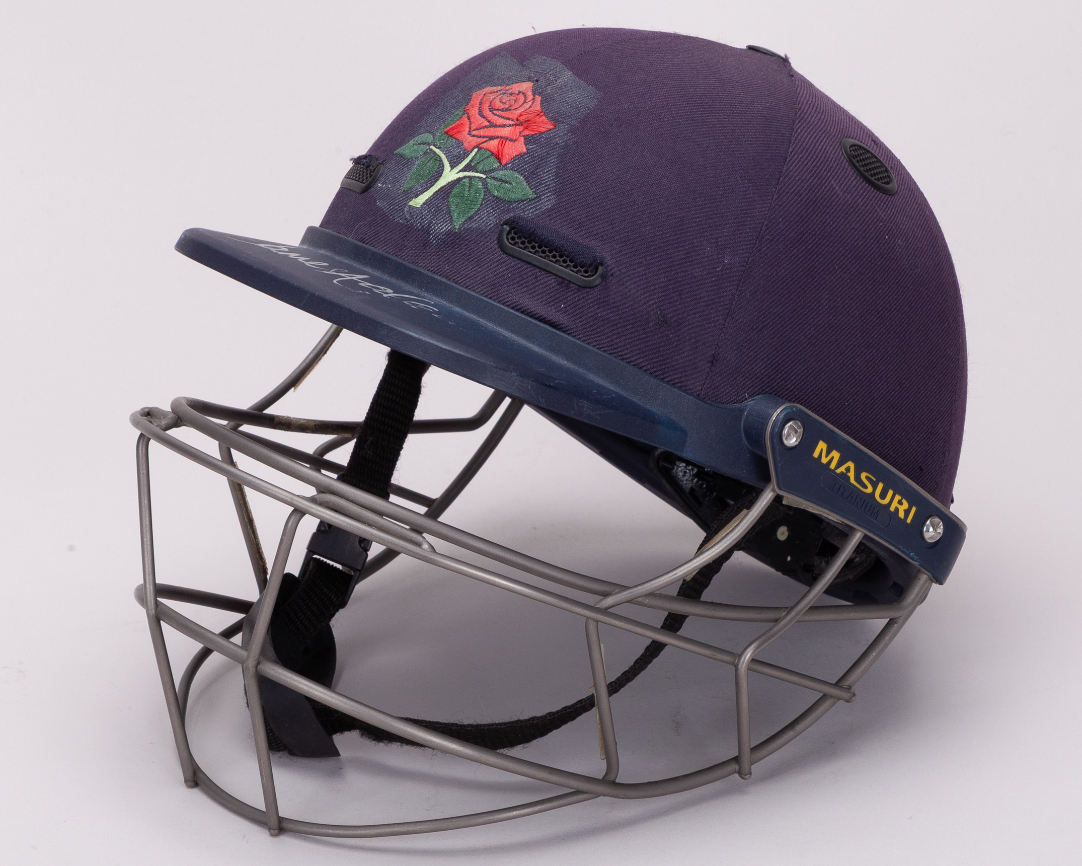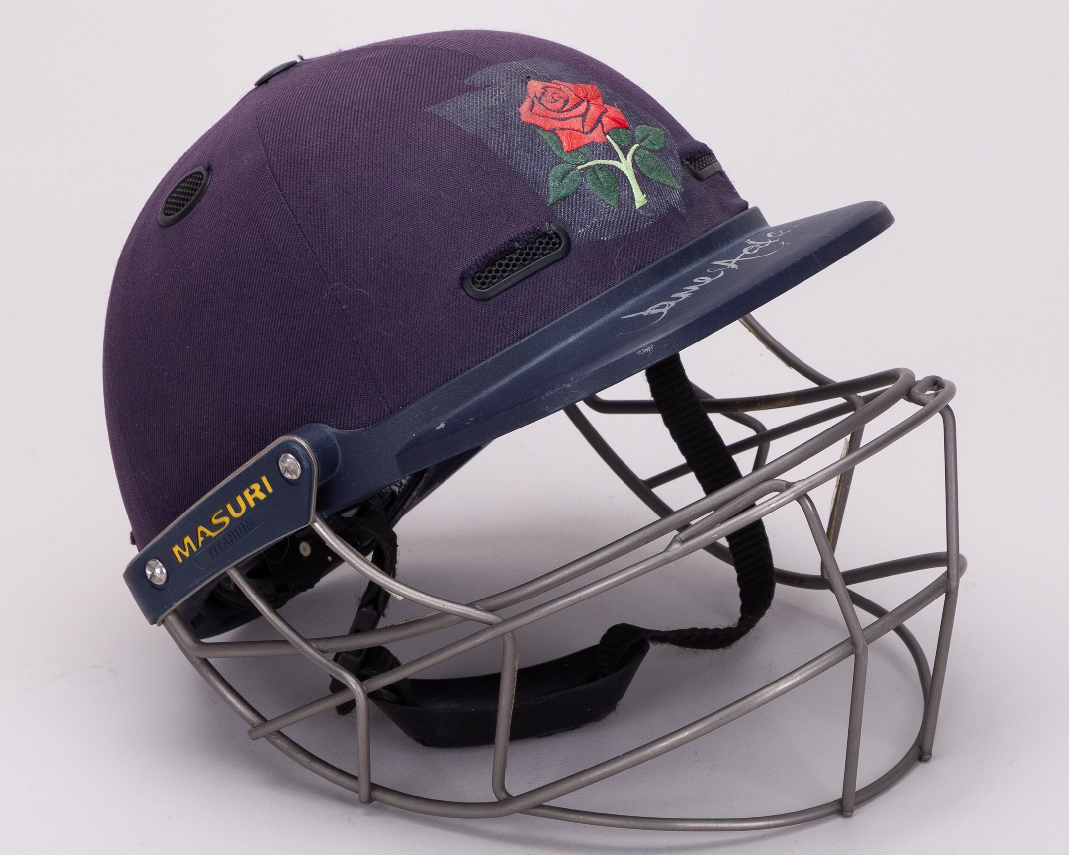 An autographed Jimmy Anderson Masuri cricket helmet