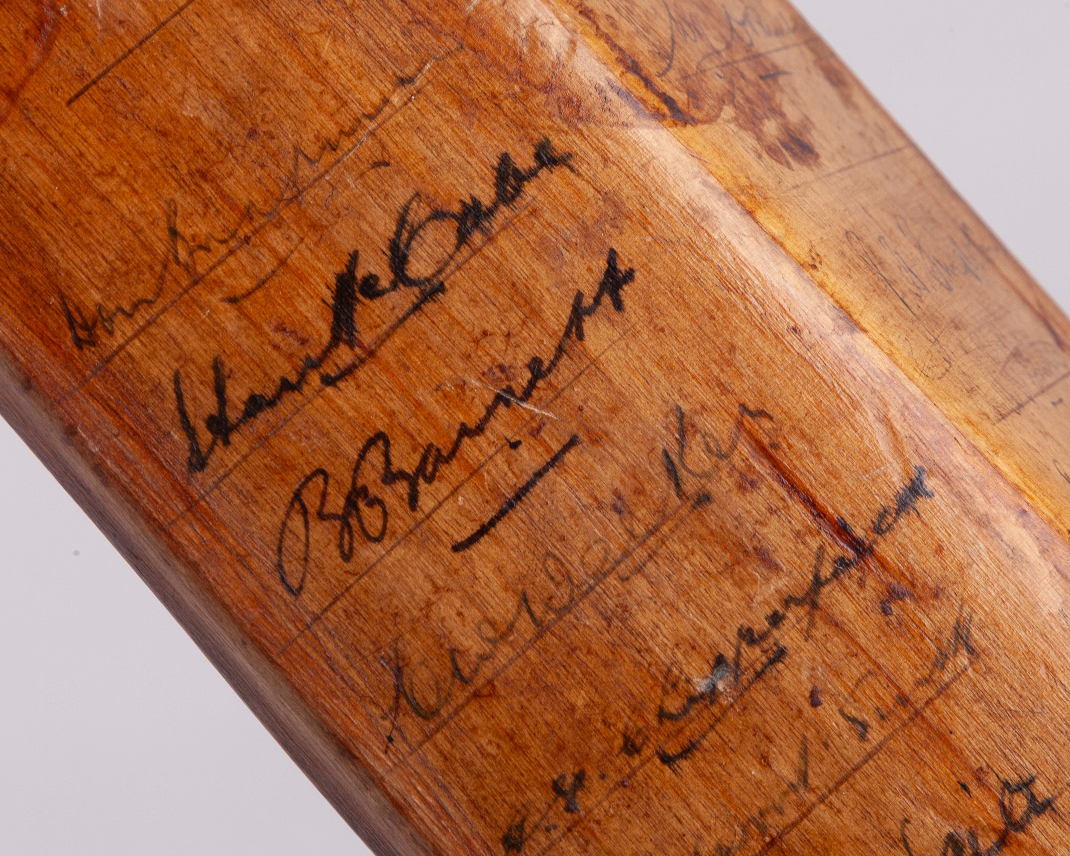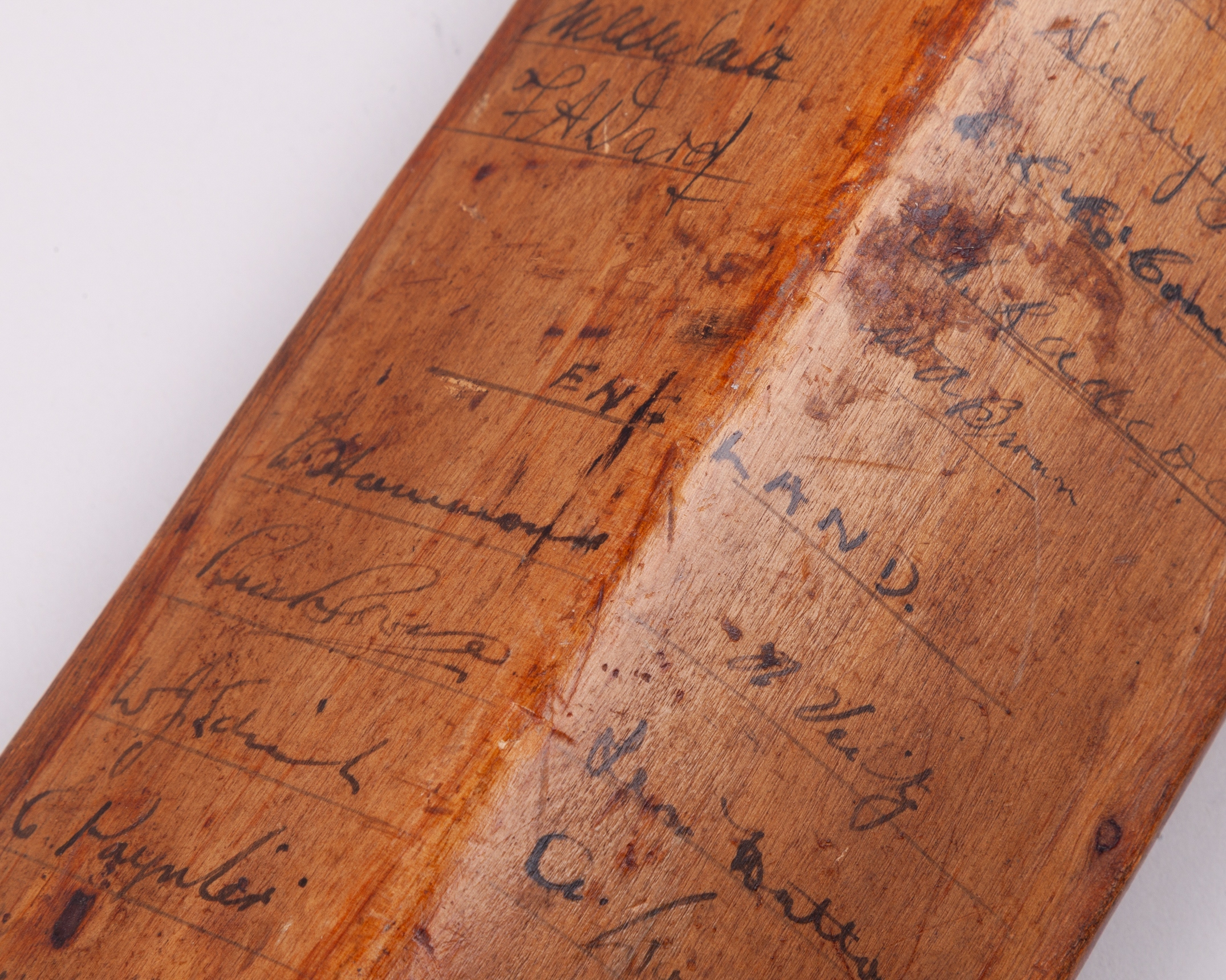 1938 Ashes: a George Gunn 1938 Ashes autographed cricket bat, signed by fifteen of the Australian side and eleven signatures of the England team, staining to bat and handle perished