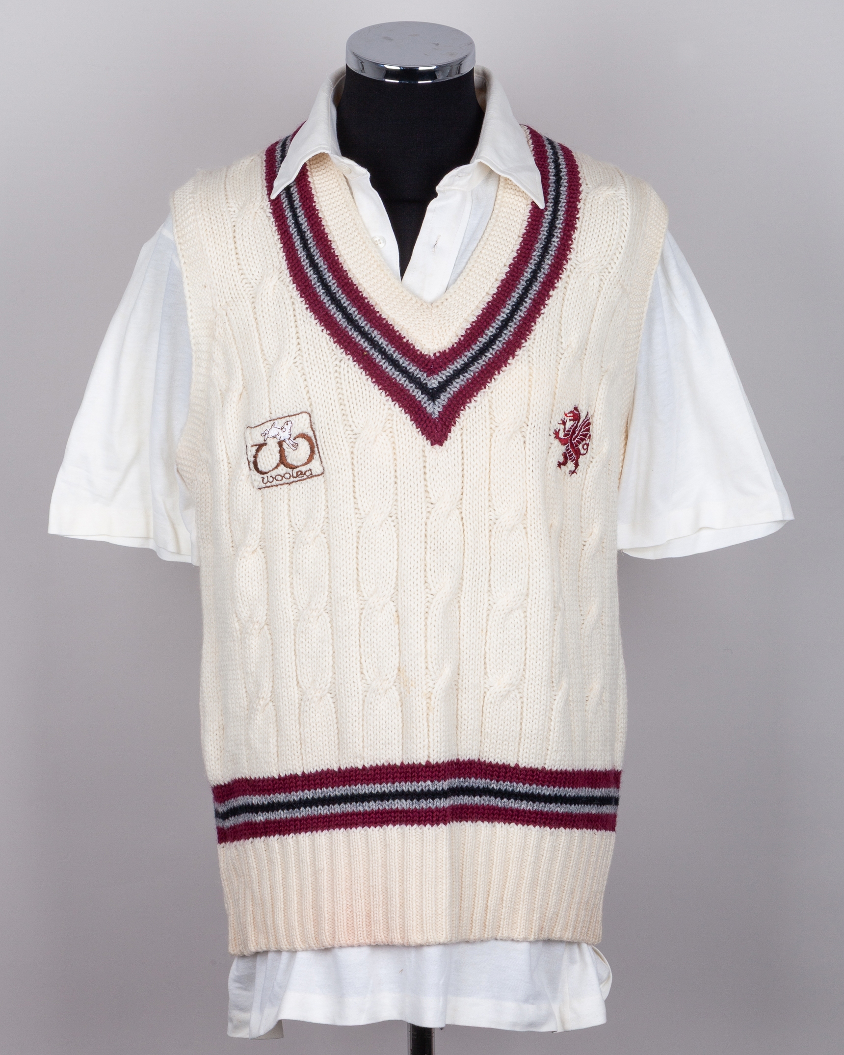 Ian Botham - Somerset Ist XI sleeveless sweater and short sleeve shirt worn by Botham, Allez, with county colours of maroon, grey and black to neck and waist, with embroidered badge, the shirt by ‘GM’ with initials ‘ITB’ handwritten to inside collar, with embroidered badge, sponsor’s logo ‘Woolea’ to chest, (2)