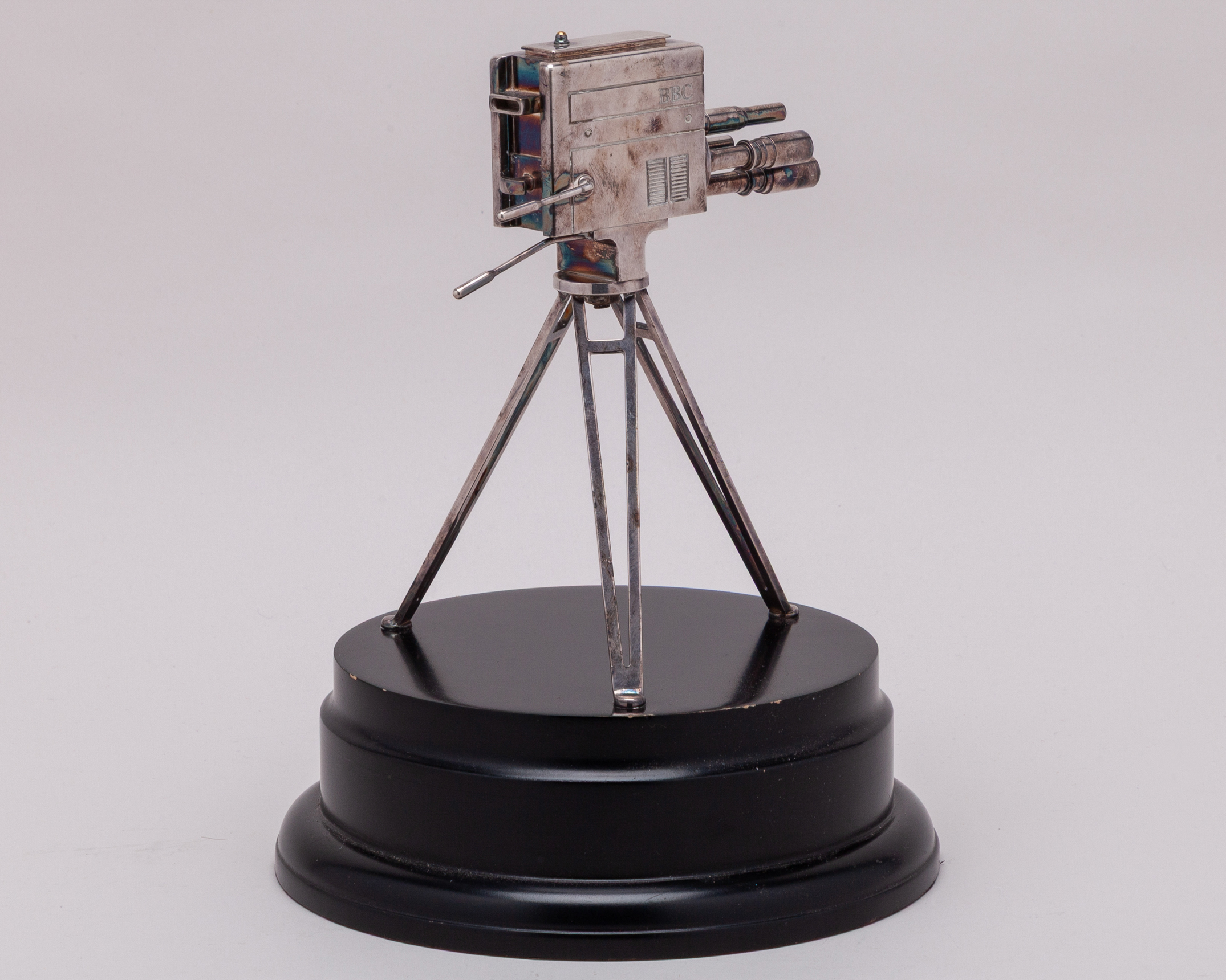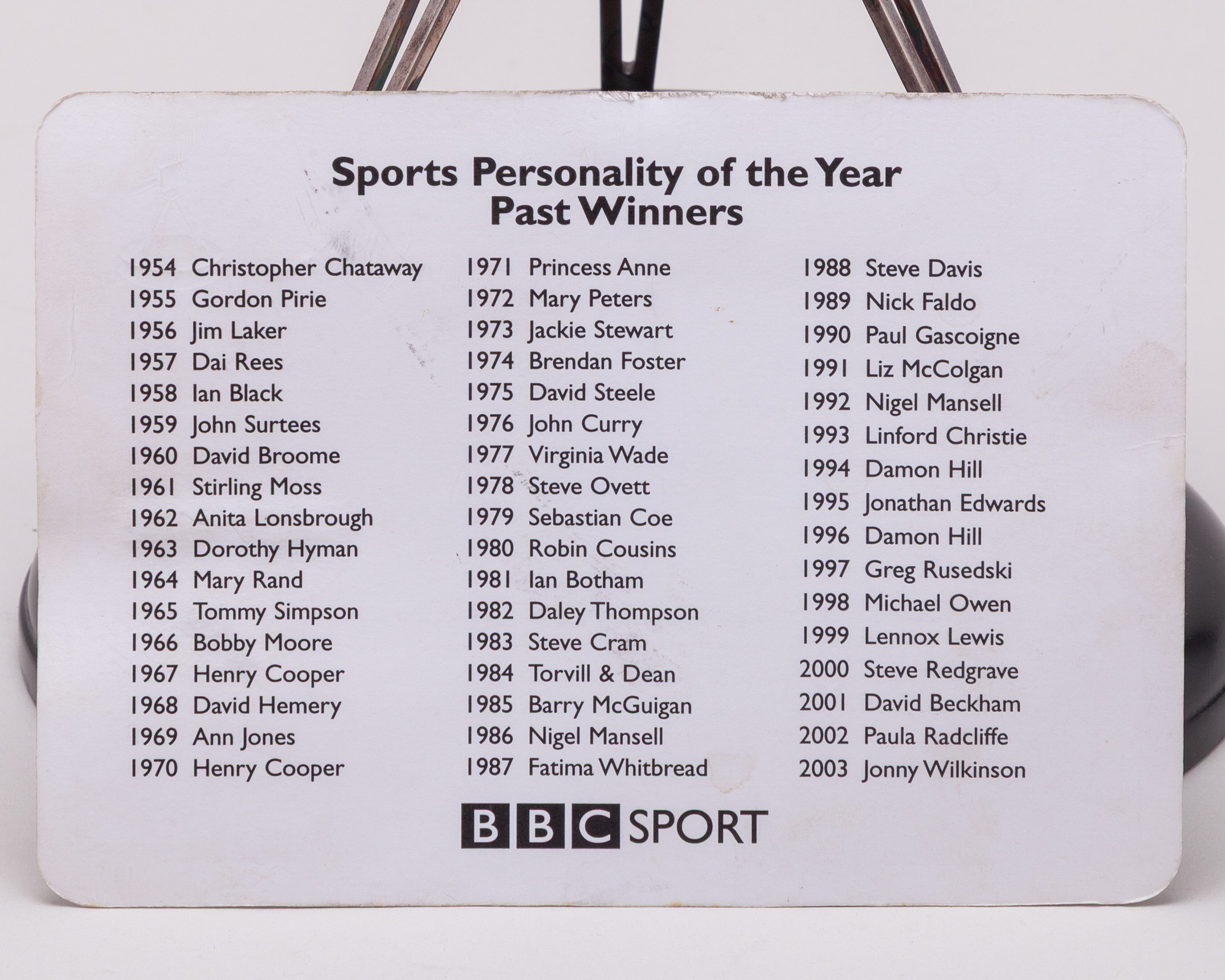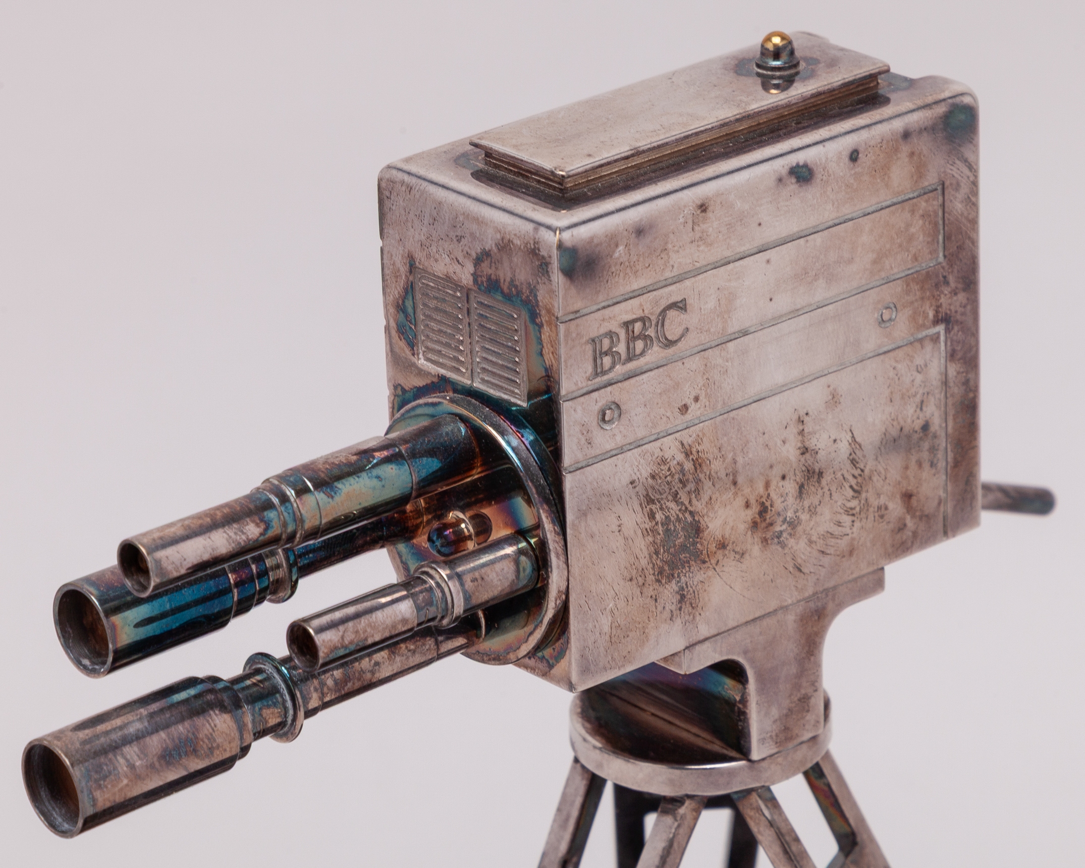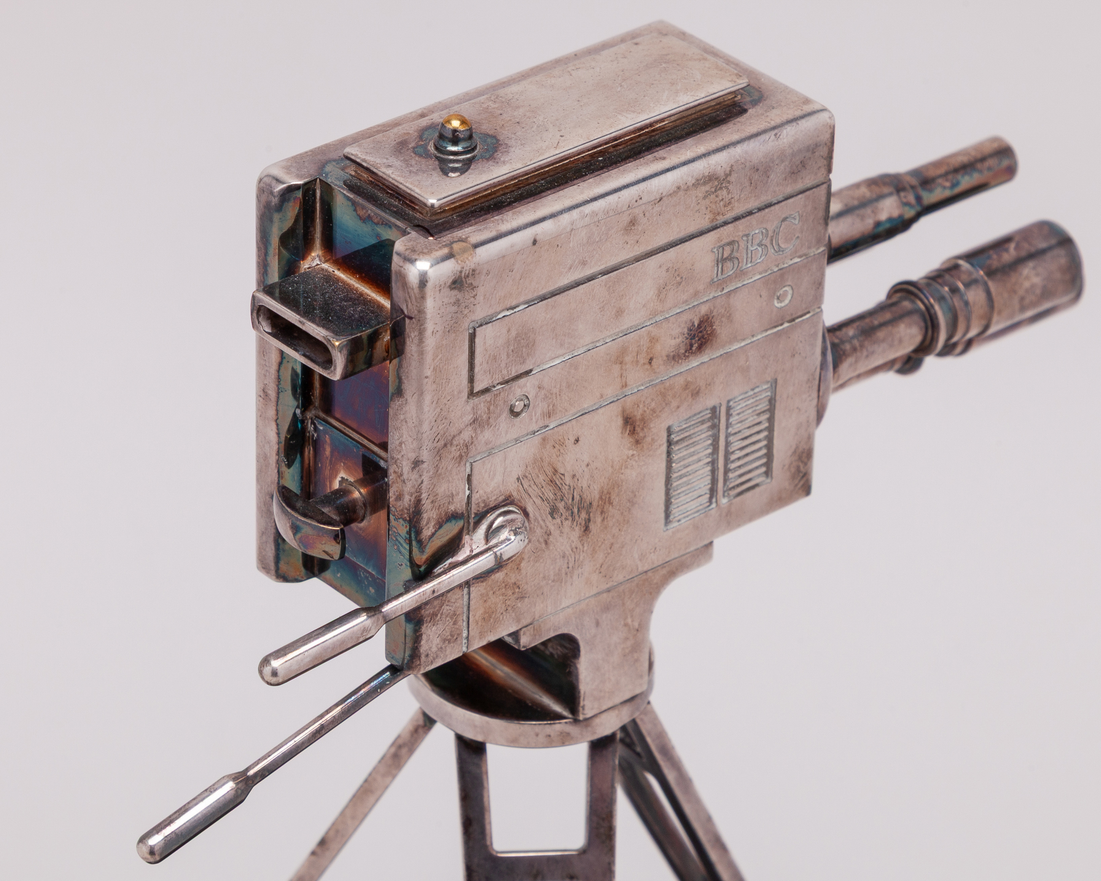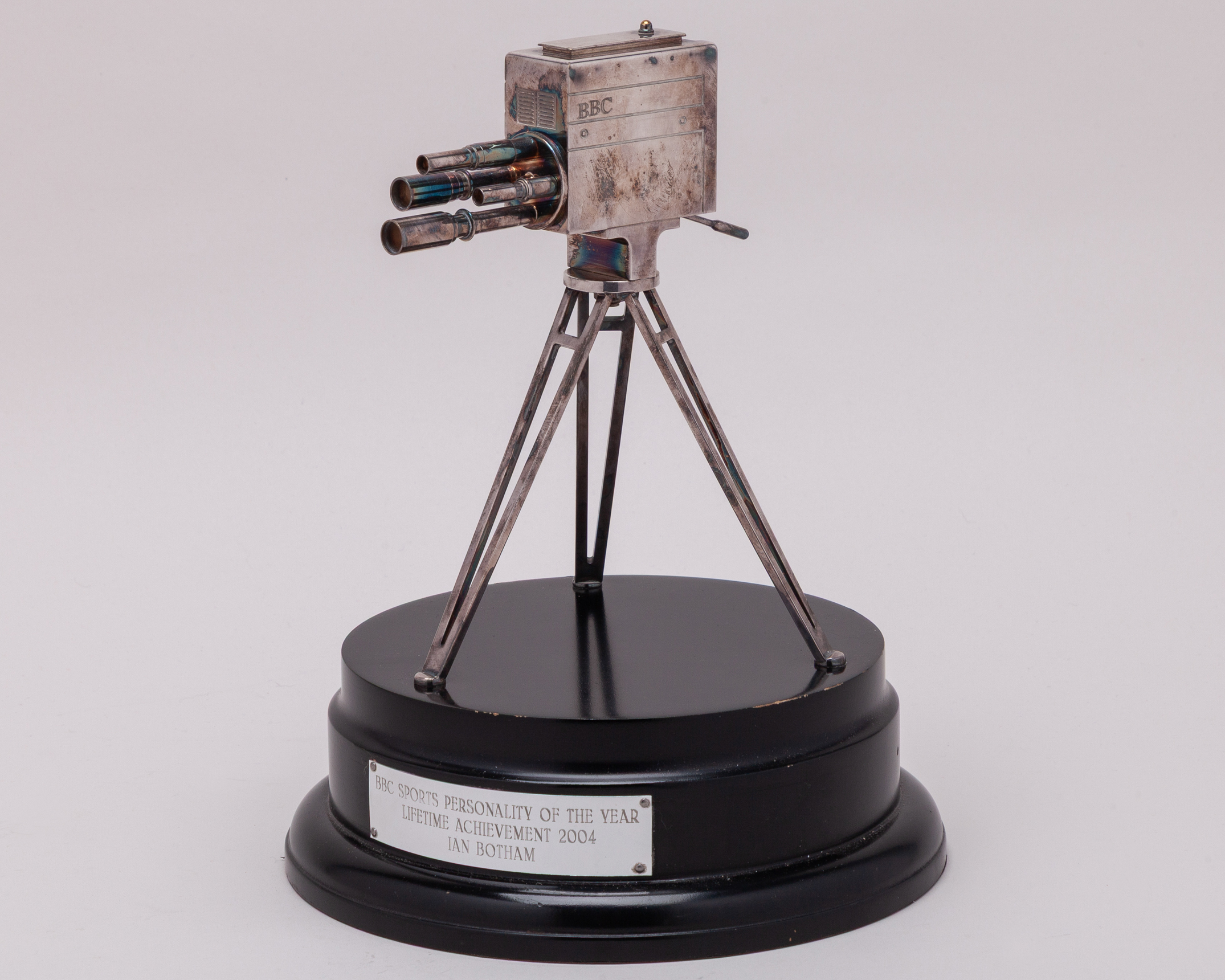 Ian Botham The BBC Sports Personality of the Year, Lifetime Achievement Award, 2004, the silver-plated trophy formed as a four turret camera on tripod supports, circular wooden base with white-metal plaque inscribed BBC SPORTS PERSONALITY OF THE YEAR, LIFETIME ACHIEVEMENT 2004 IAN BOTHAM, 28cm high