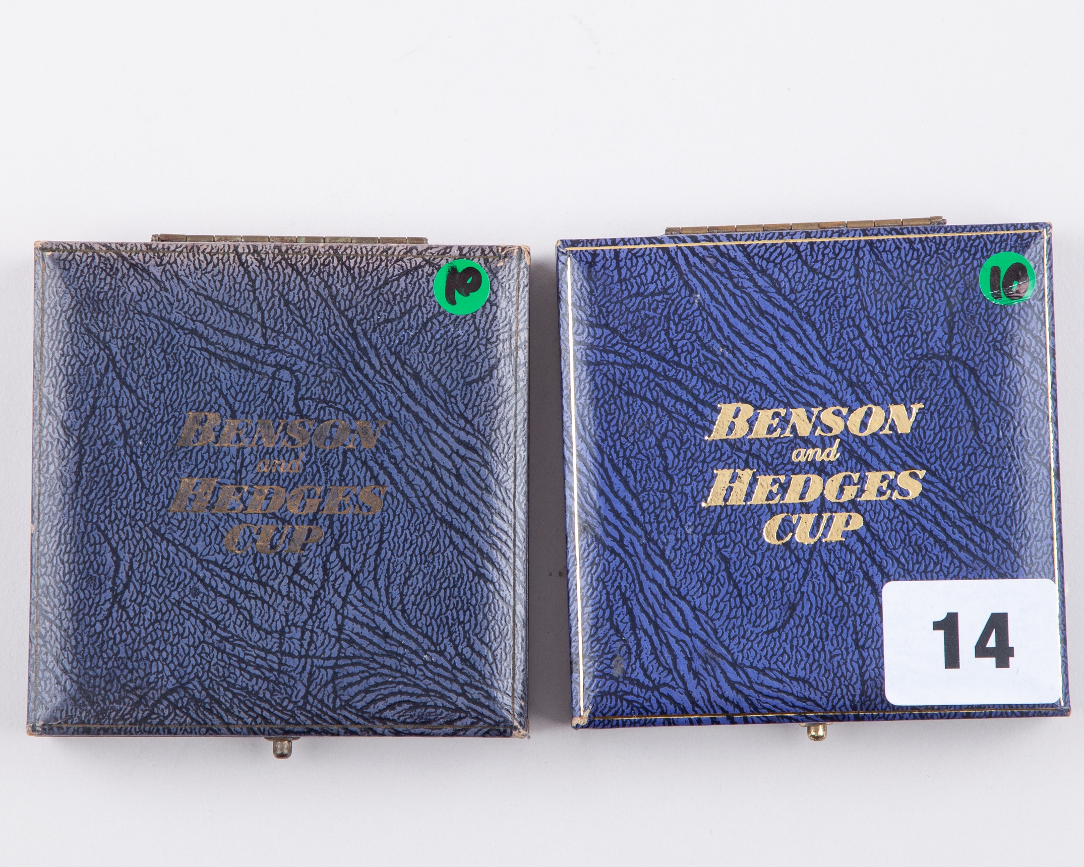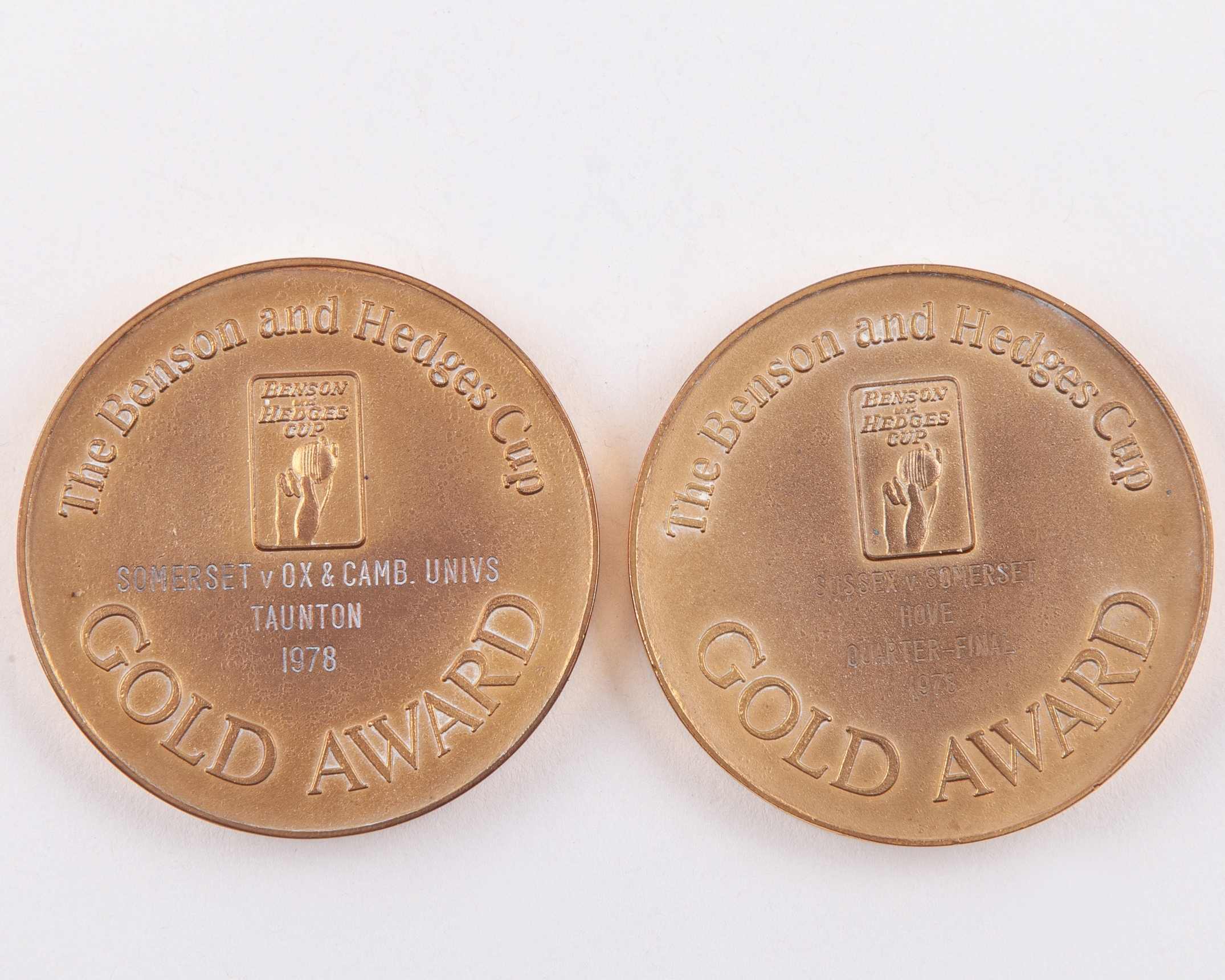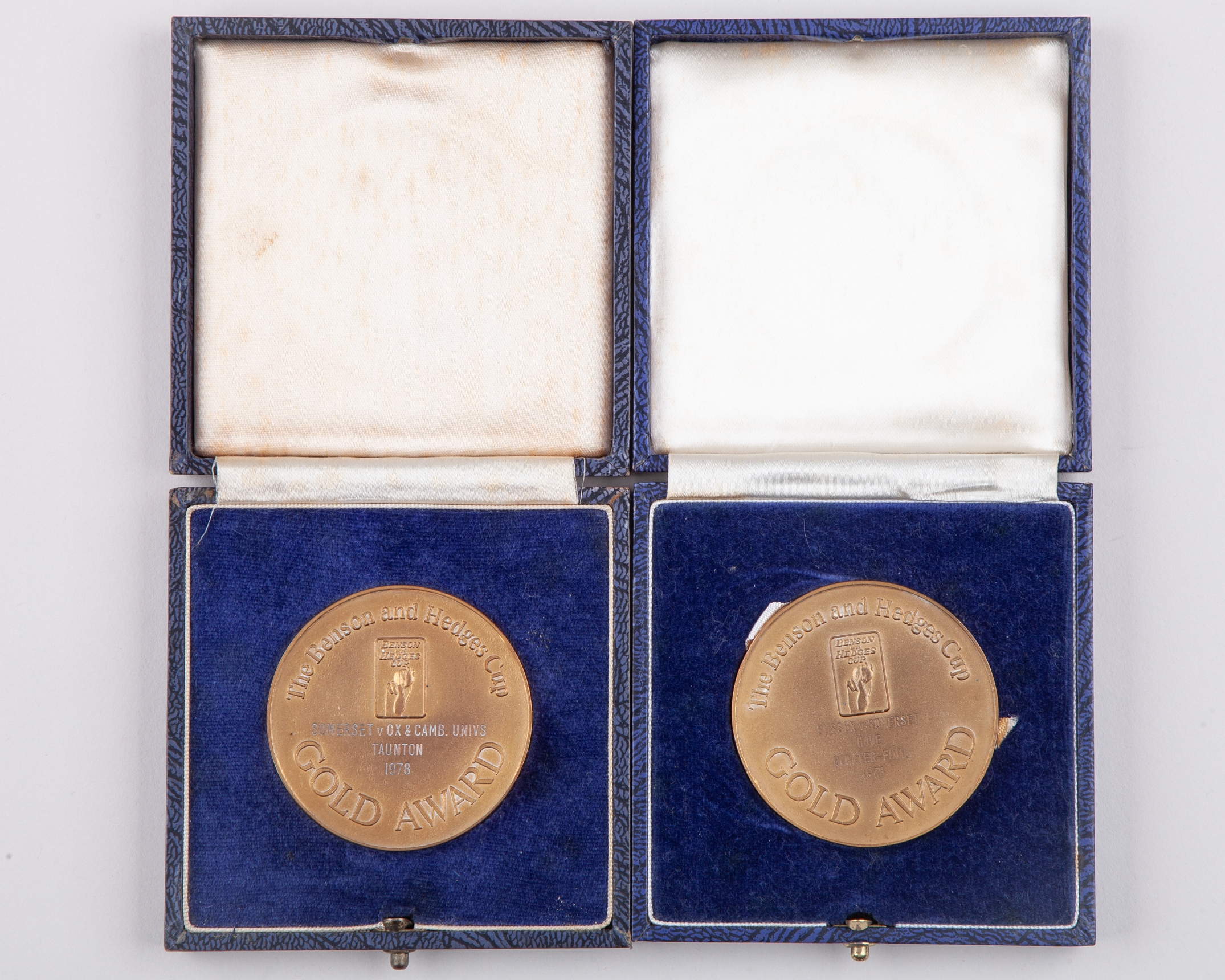 Ian Botham - two gilt-metal Benson & Hedges Cup 1978 Gold Award (Man of the Match) medals awarded to Botham playing for Somerset in the Group match v Combined Universities (Oxford & Cambridge), Taunton, 20th May 1978, and the Quarter-Final match, Sussex v Somerset, Hove, 7th & 8th June 1978, in original fitted cases (2)