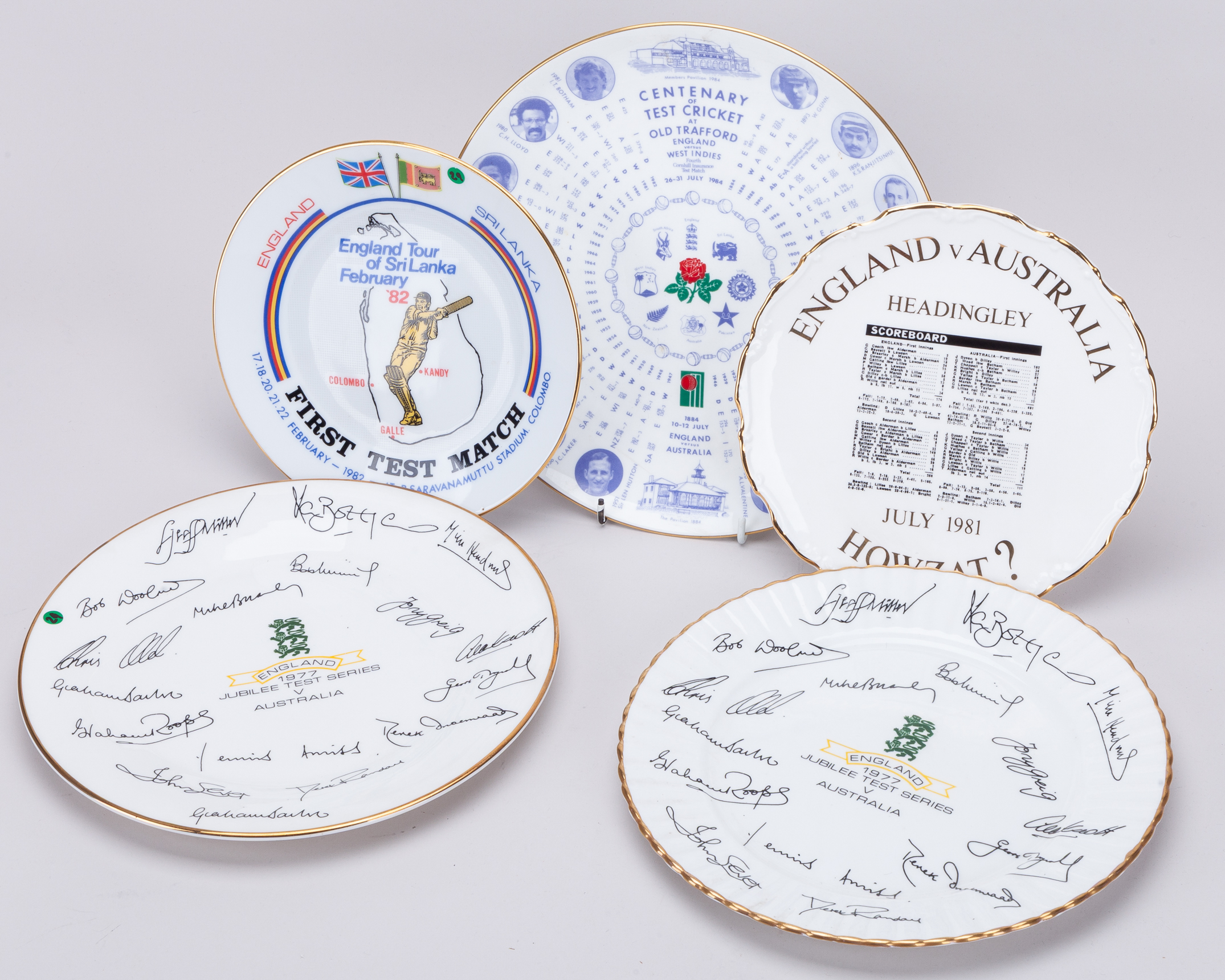 Ian Botham - seven various commemorative test match plates, including, England v Australia (Jubilee Test Series) 1977, with England emblem and details to centre and facsimile signatures of the England team to surround, Royal Stafford, England v Australia, Headingley ‘Howzat’ July 1981’ with details to edge and copy of the scorecard to centre, Royal Albert and ‘Sri Lanka v England First Test Match Commemorative plate by Lanka Porcelain produced to mark the first Test match between Sri Lanka and England, played at Colombo 17th-22nd February 1982, Centenary of Test Cricket at Old Trafford 1984, Coalport commemorative bone china plate with details of the match, England v West Indies, July 1984 plus portraits of leading players, printed signatures of the two captains, David Gower and Clive Lloyd,. Royal Worcester commemorative Worcestershire C.C.C. china plate Worcestershire C.C.C.Refuge Assurance League Champions 1987 etc, all presented to Botham during his playing career