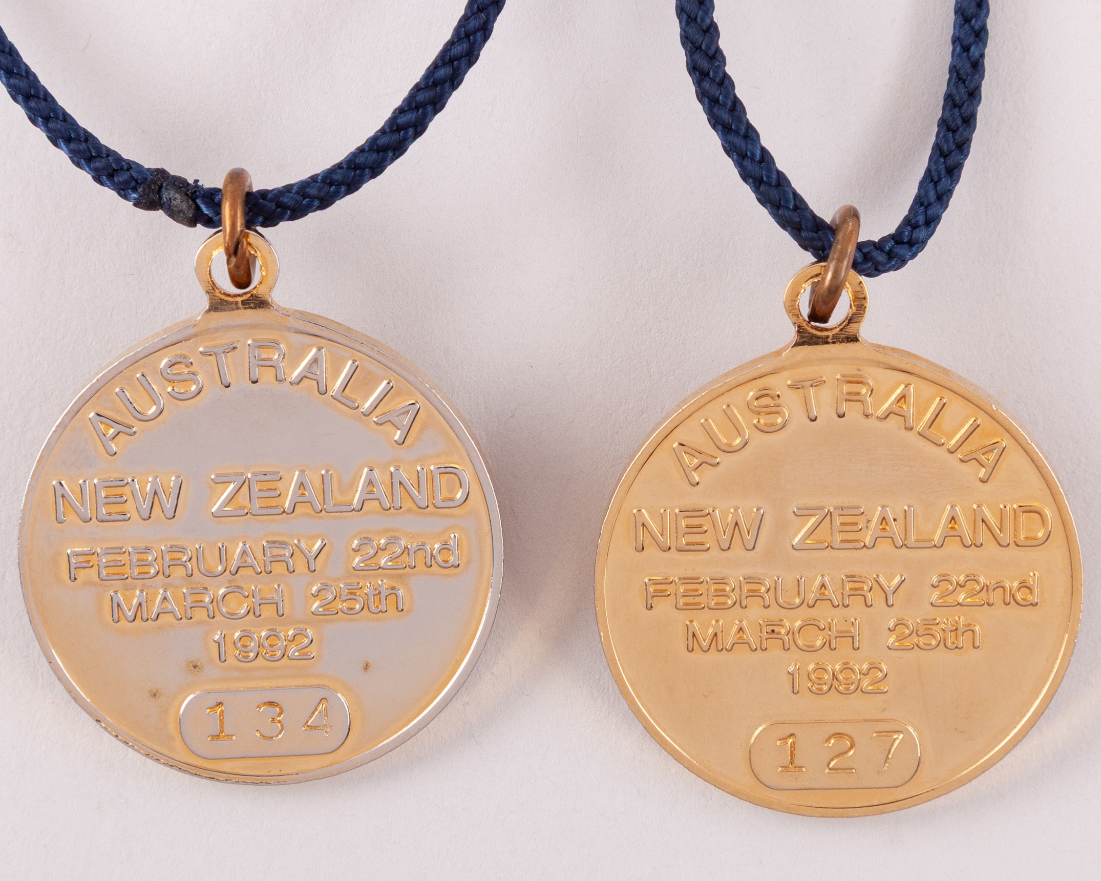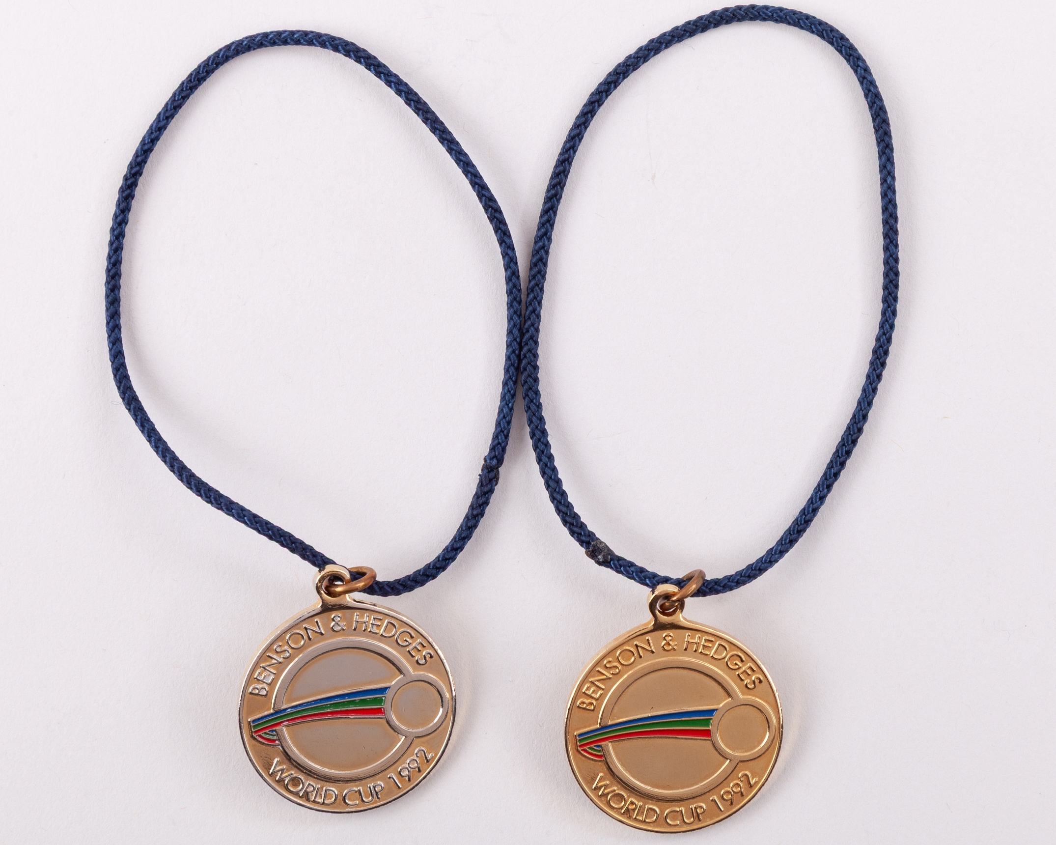 Ian Botham - Benson & Hedges World Cup 1992, two yellow-metal medals presented to Botham for the launch of the 1992 World Cup held in Australia and New Zealand, the obverse of each inscribed BENSON & HEDGES WORLD CUP 1992, the reverse of each inscribed AUSTRALIA NEW ZEALAND FEBRUARY 22ND MARCH 15TH 1992, one numbered 127, the other 134, with ring suspension and cord
