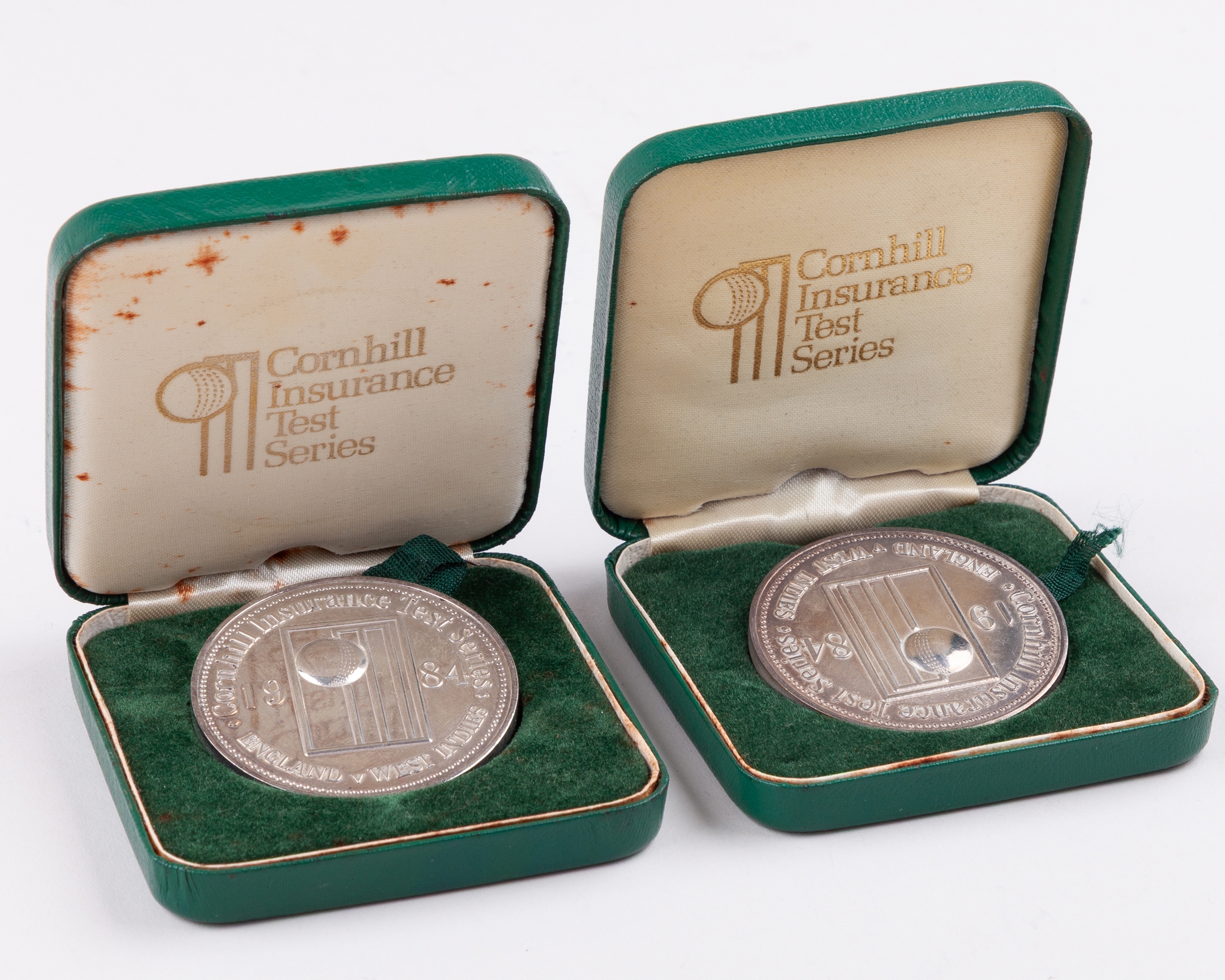 Ian Botham - two white-metal England v. West Indies Test Series medals, 1984, the obverse of each medal inscribed Cornhill Insurance Test Series ENGLAND v. WEST INDIES 1984, the reverse on inscribed Joint Man of the Match I.T. BOTHAM Secord Test Lord's, the other inscribed I.T. BOTHAM, both in original fitted cases