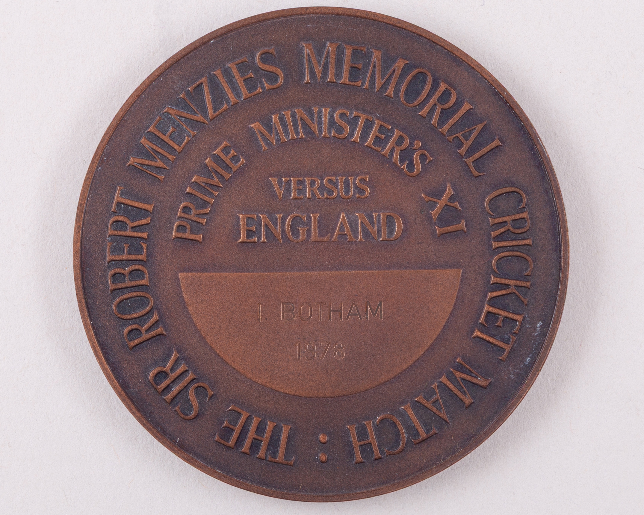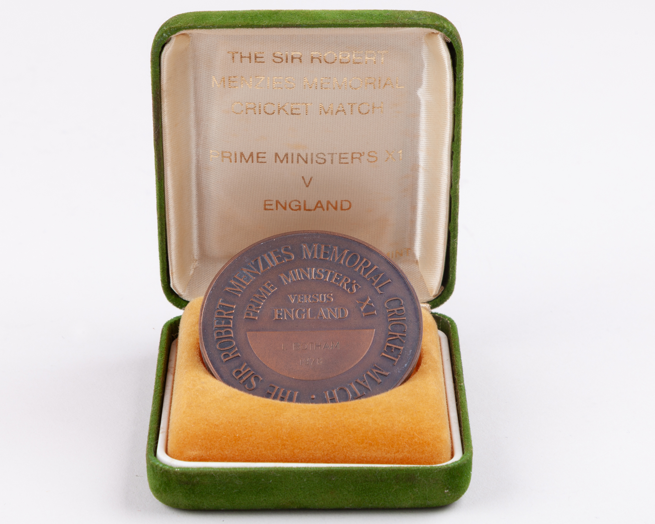 Ian Botham - a bronze medal cricket medal, inscribed, The Sir Robert Menzies Memorial Cricket Match. Prime Minister’s XI v England’ 1I. BOTHAM 1978, produced by the Royal Australian Mint and presented to Botham as a member of the England team for the match played in November 1978, the original fitted case the underside of the lid similarly inscribed