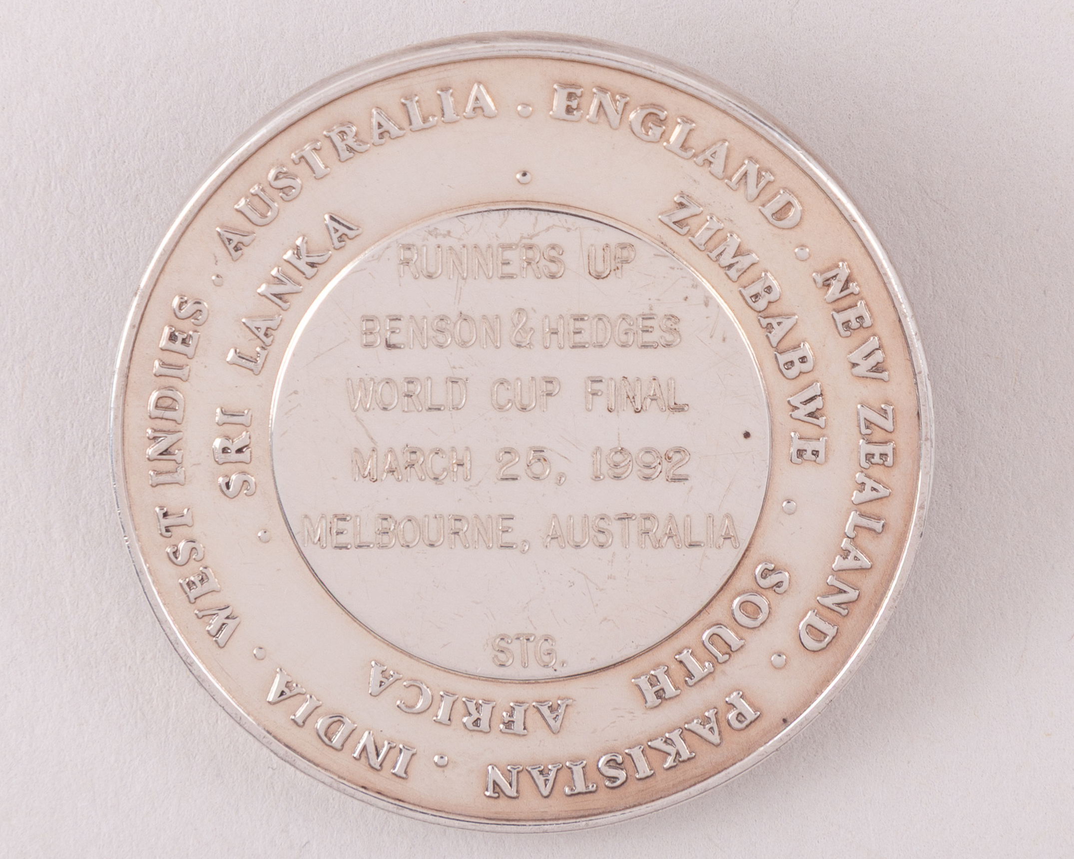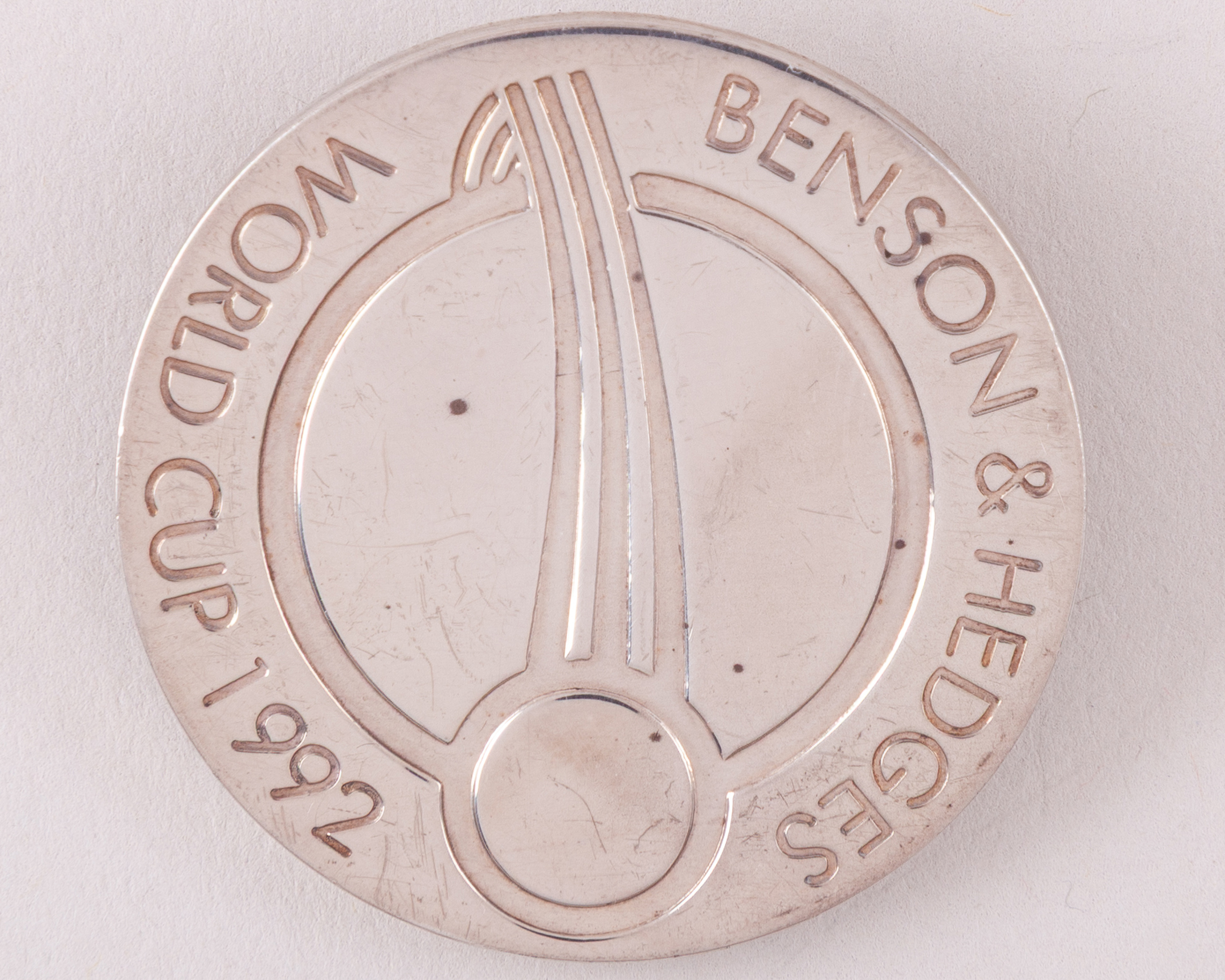 Ian Botham - Benson & Hedges World Cup 1992, a sterling silver Runners-up medal, 1992, presented to Botham the obverse inscribed BENSON & HEDGES WORLD CUP 1992, the reverse of Runners Up Benson & Hedges World Cup Final March 25, 1992, Melbourne, Australia’, surrounded by the names of participating countries