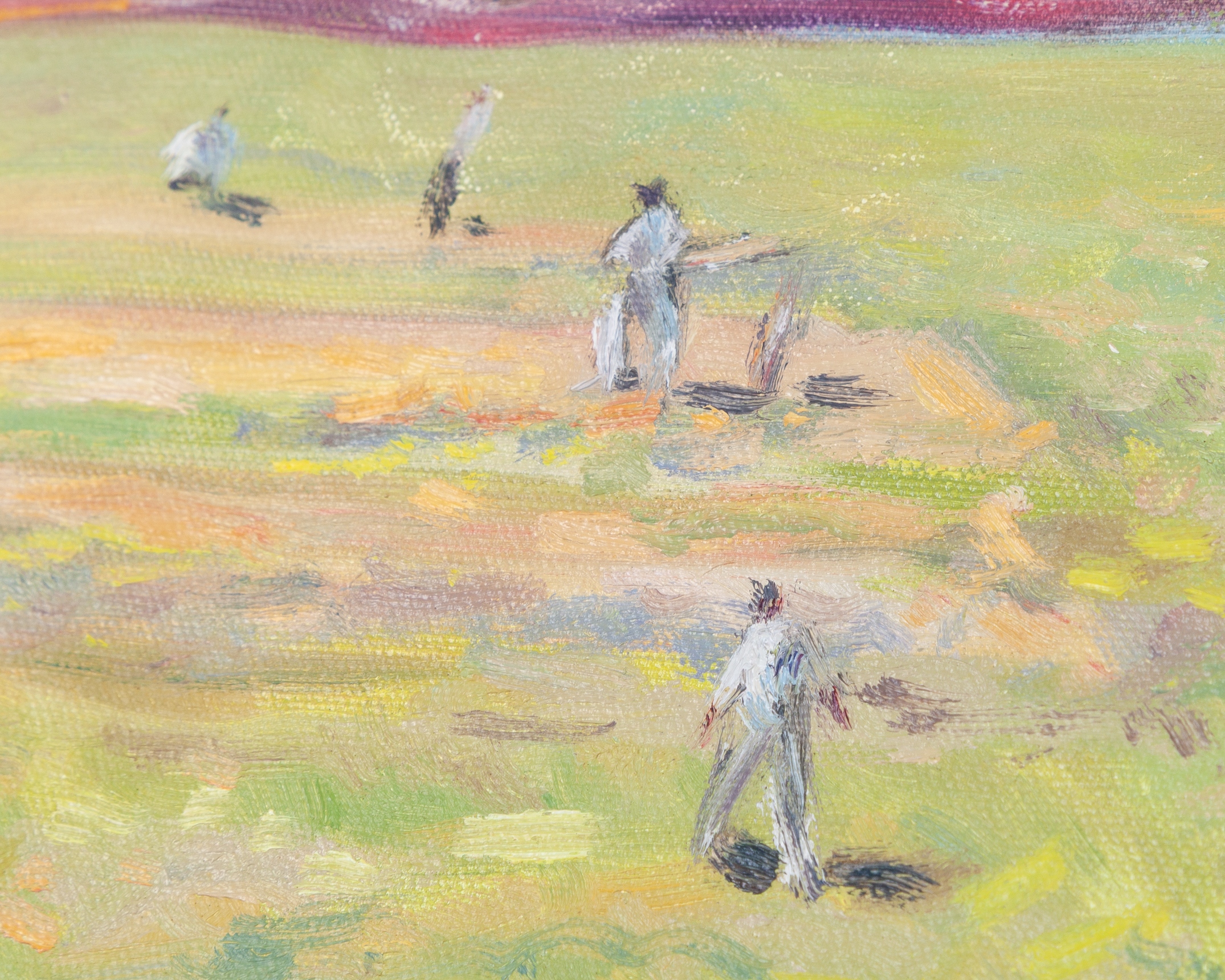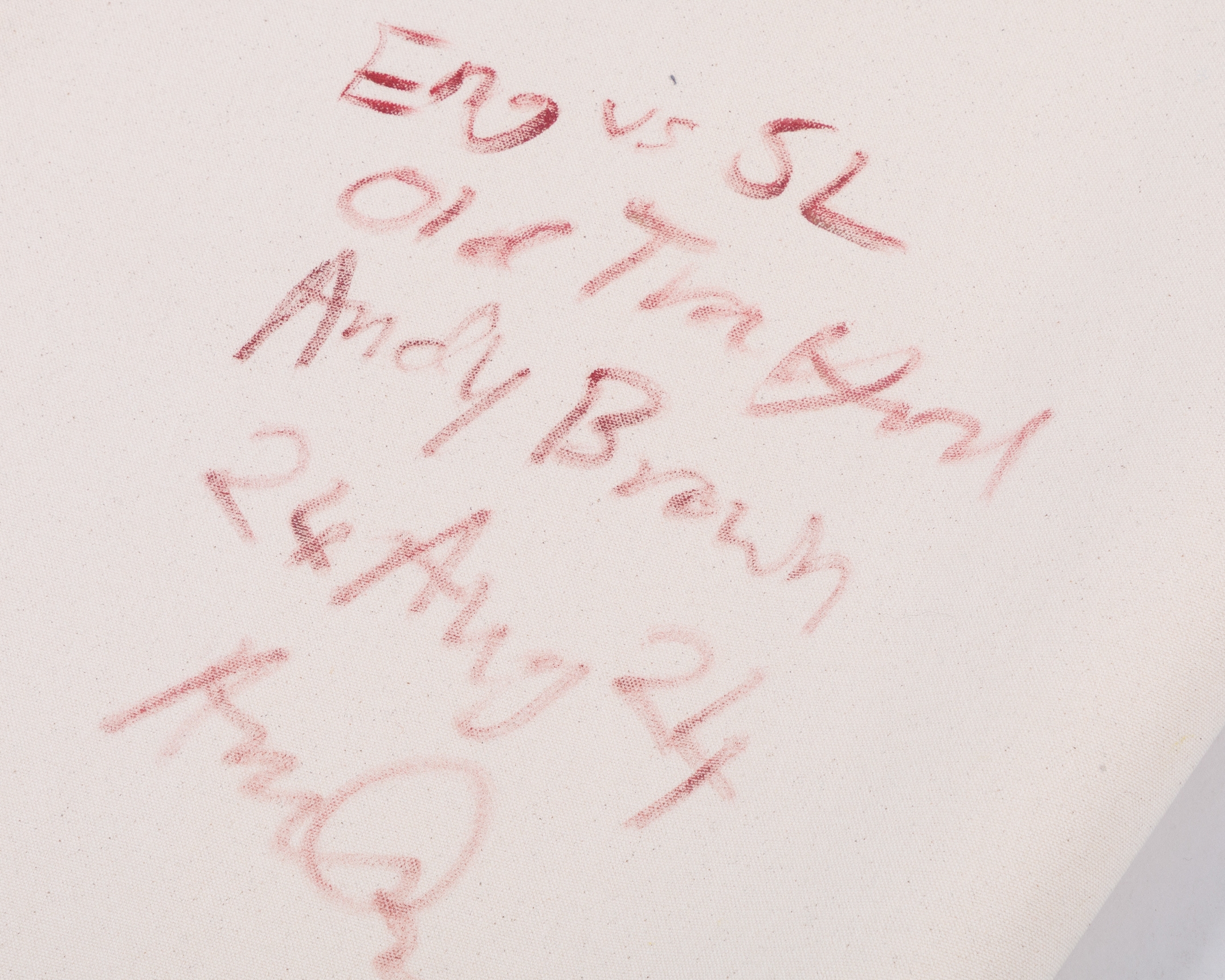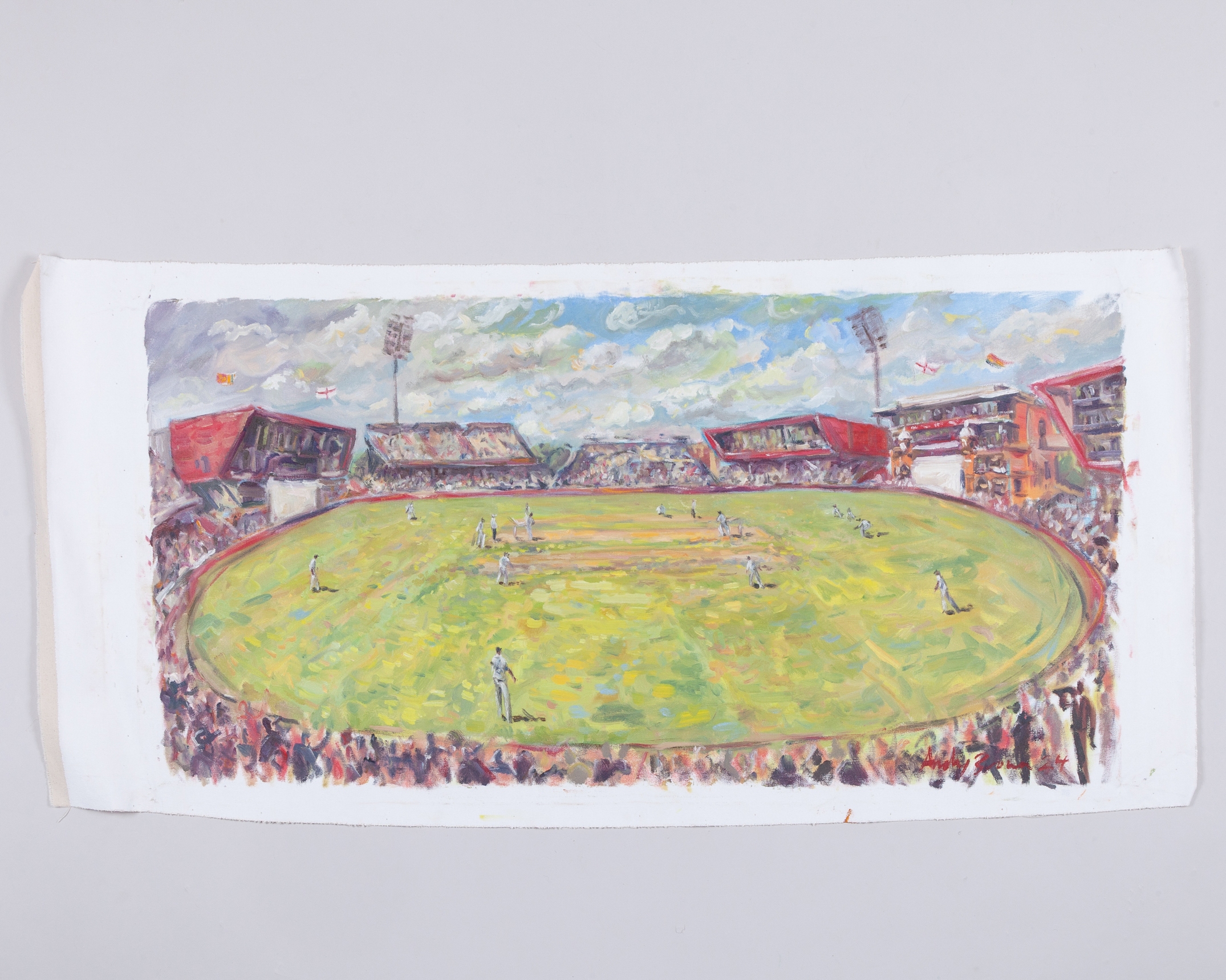 Andy Brown (British 20th Century) England v. Sri Lanka, signed and dated Andy Brown 24, the reverse signed and inscribed Eng vs SL, Old Trafford, 24th Aug 24, un stretchered, unframed, 57 x 120cm