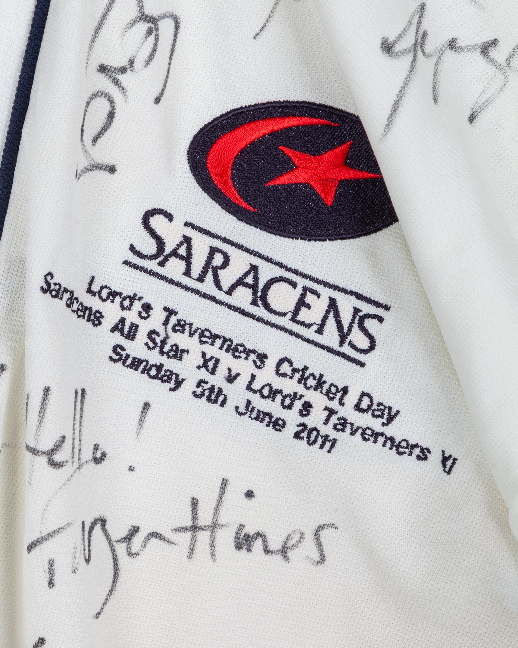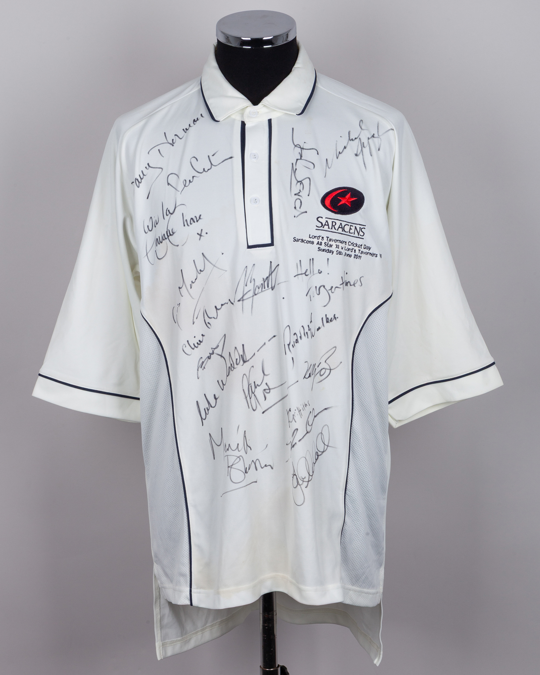 A white Saracens All Star XI v. Lord Taverners XI autographed cricket shirt, with embroidered badge inscribed SARACENS Lord's Taverners Cricket Day, Saracens All Star XI v Lord's Taveners XI, Sunday 5th June 2011, the front bearing eighteen autographs