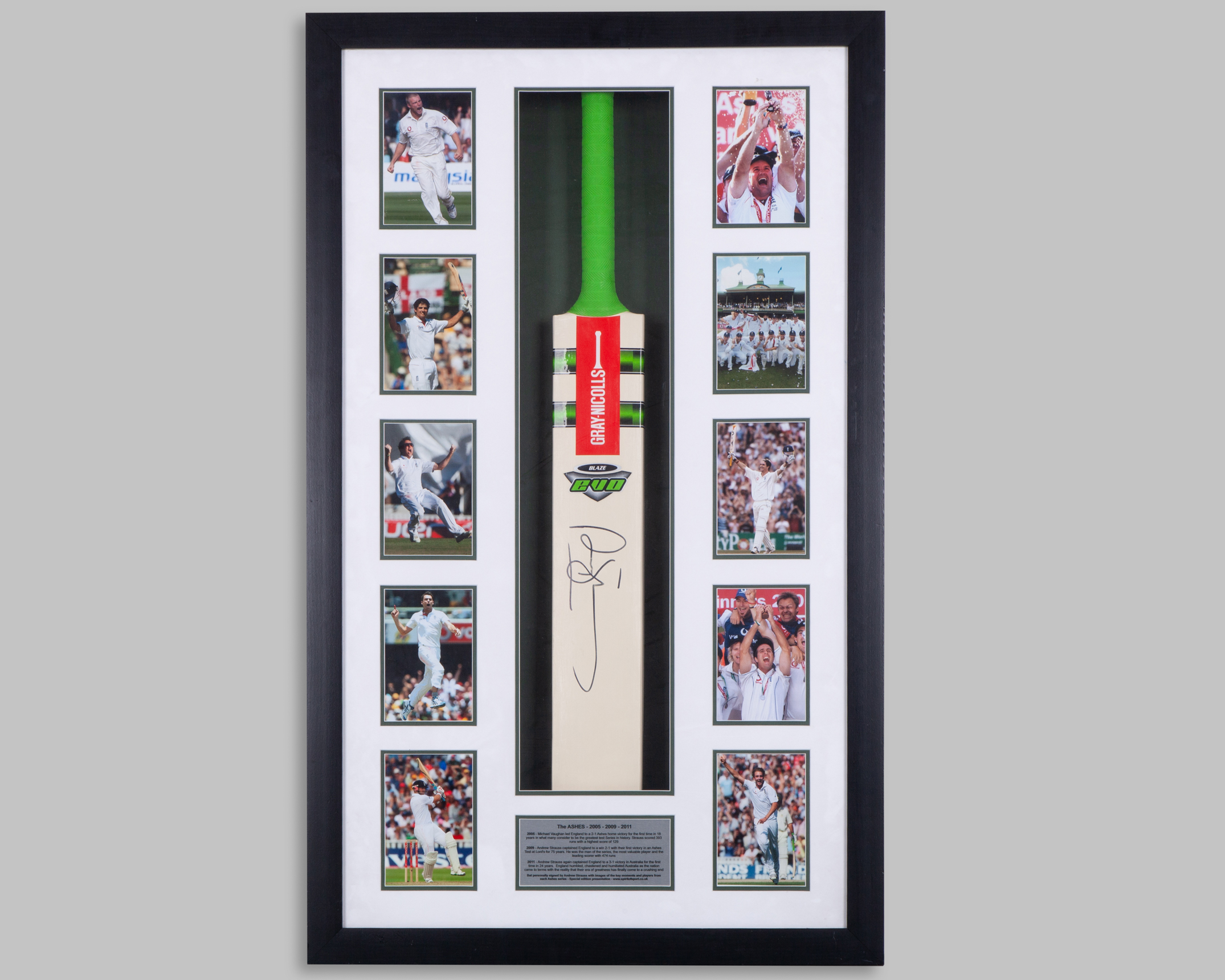 Andrew Strauss autographed Gray Nicolls Evo Blaze cricket bat The Ashes display, with ten colour photographs and plaque describing England Ashes victories, framed, 62 x 102cm