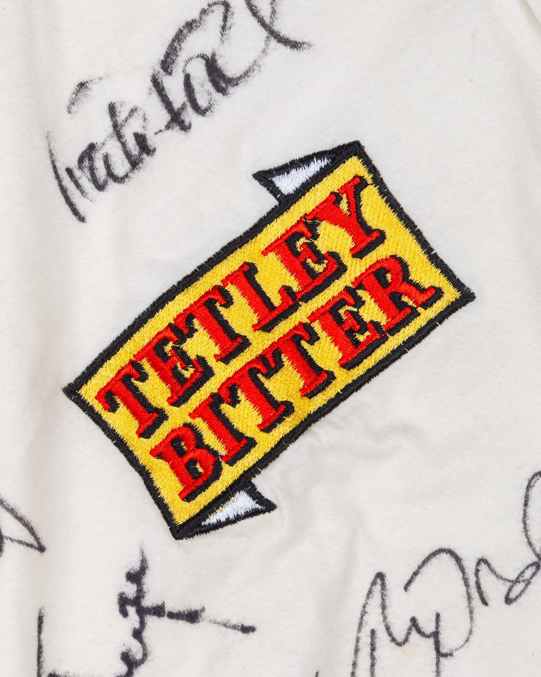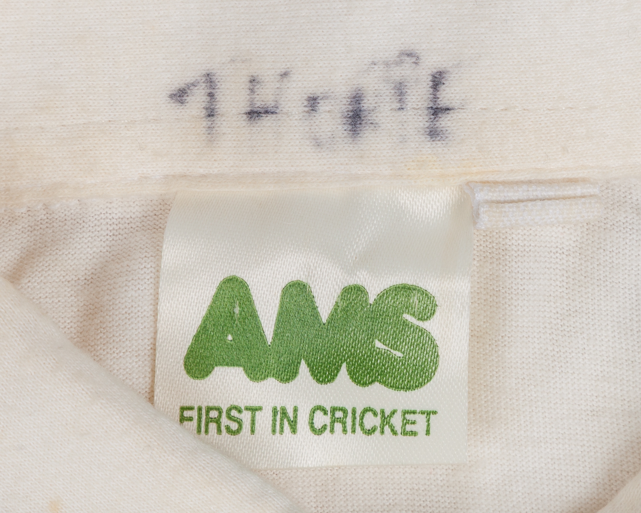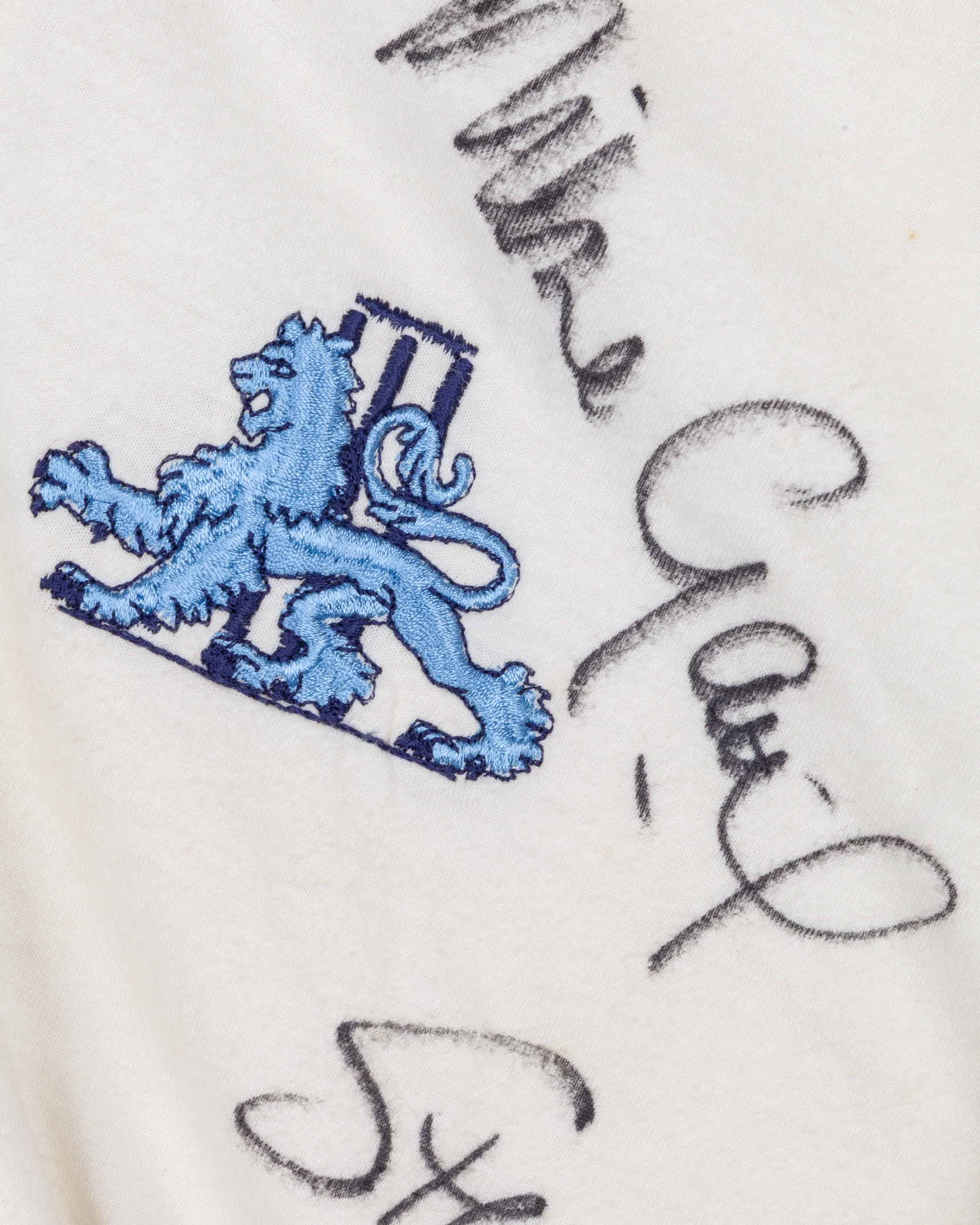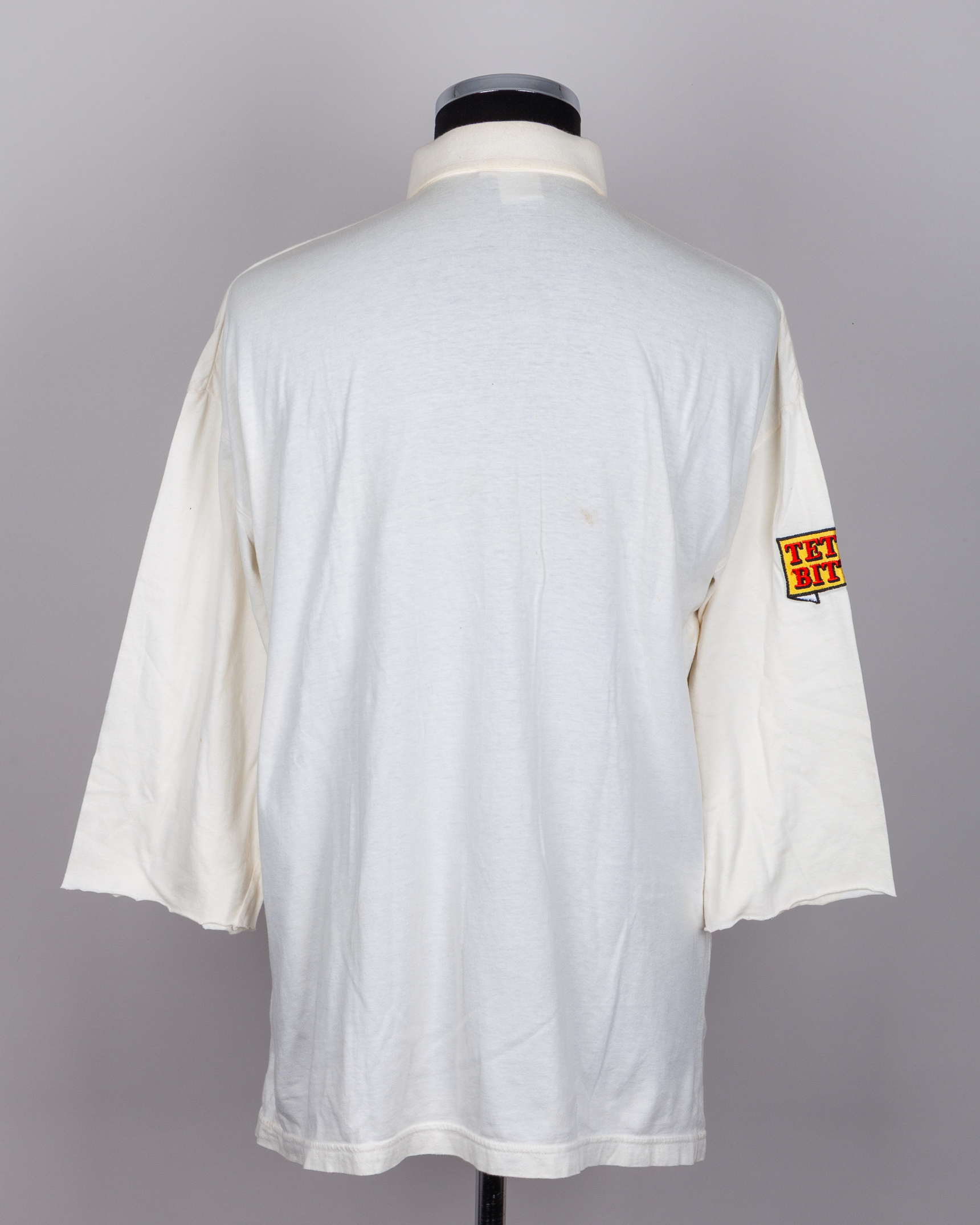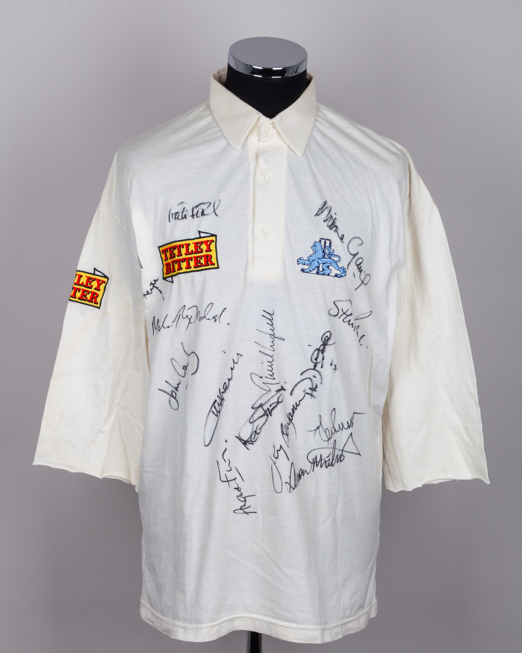Graham Thorpe white England v. South Africa 1994 autographed shirt, AMS, with button-up collar and embroidered badge, the front of the shirt bearing fifteen autographs, including Graham Thorpe, Mike Gatting, Joey Benjamin, Alec Stewart, Devon Malcolm etc, the collar inscribed in ink THORPE, with cut sleeves, staining