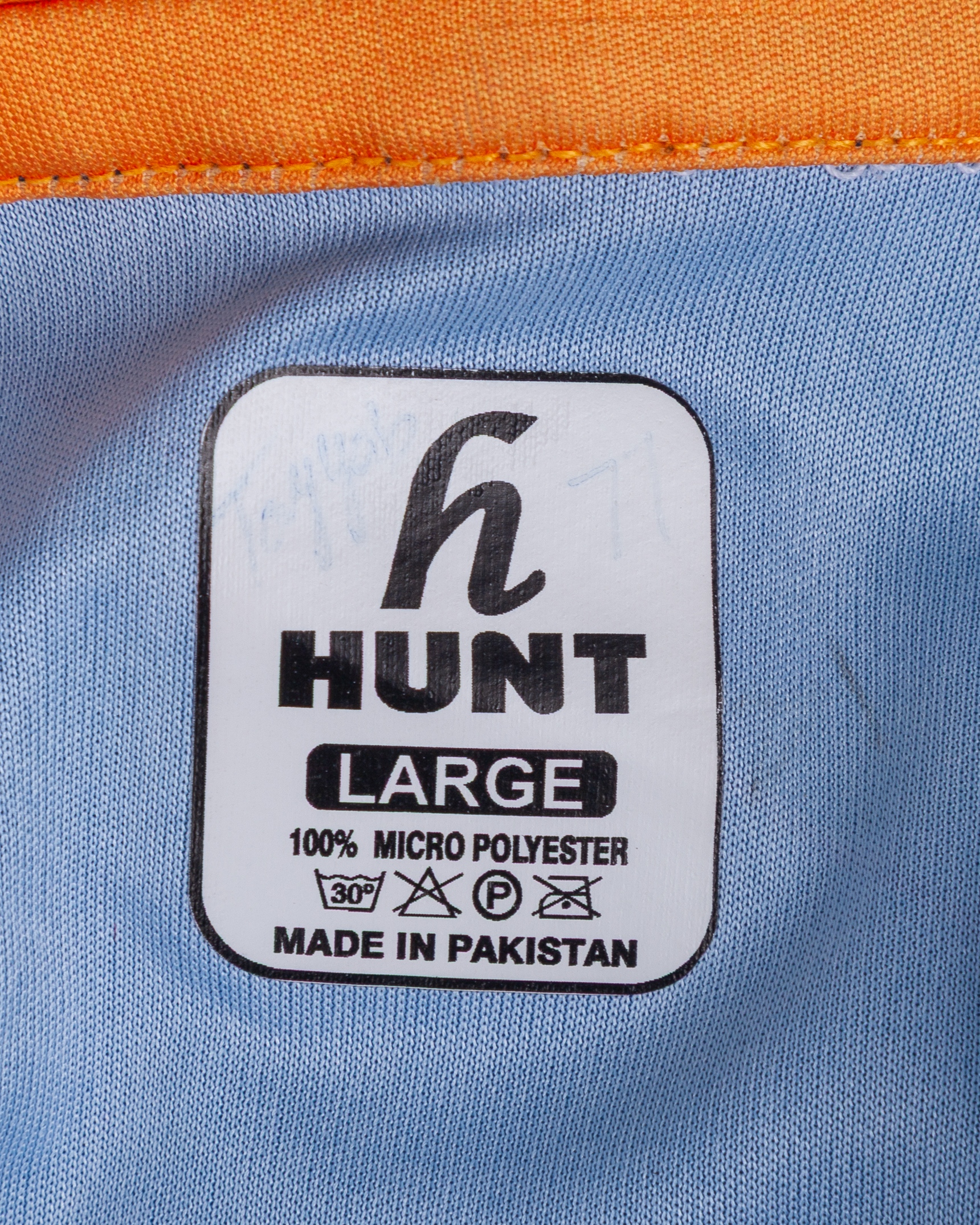 Tayab Tahir a blue and orange No.77 Central Punjab short-sleeved cricket shirt, 2022-23,, Hunt, Large, with printed badge