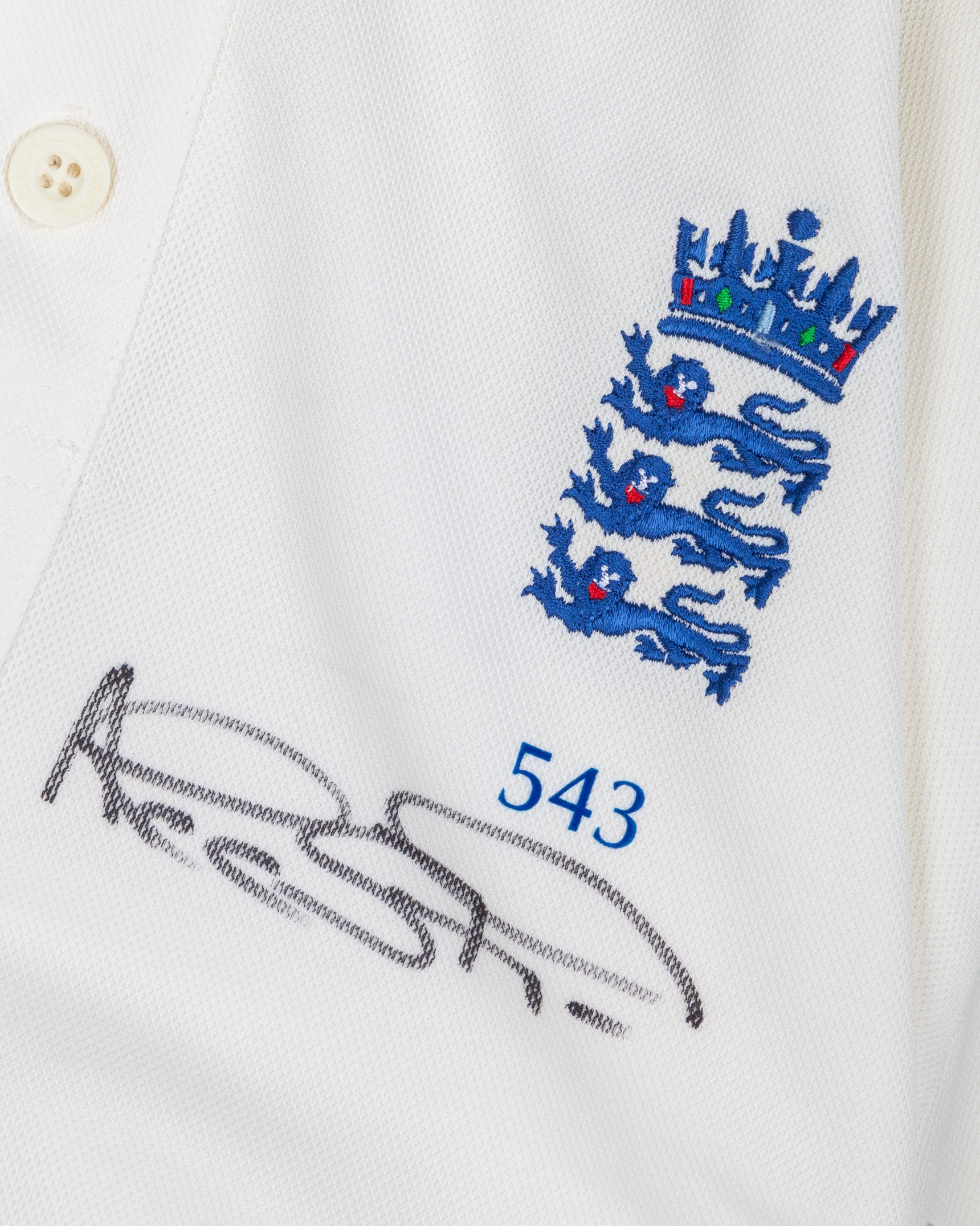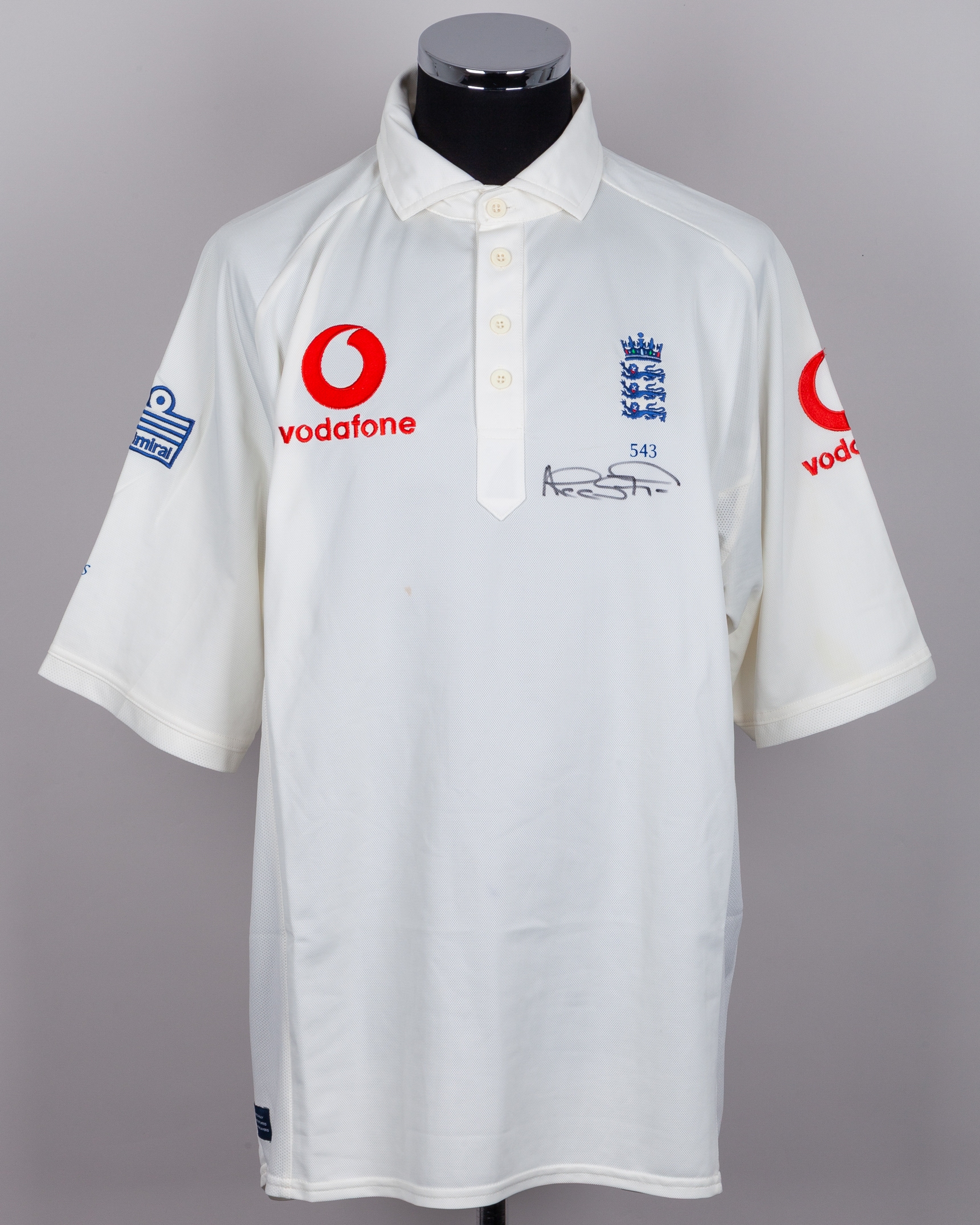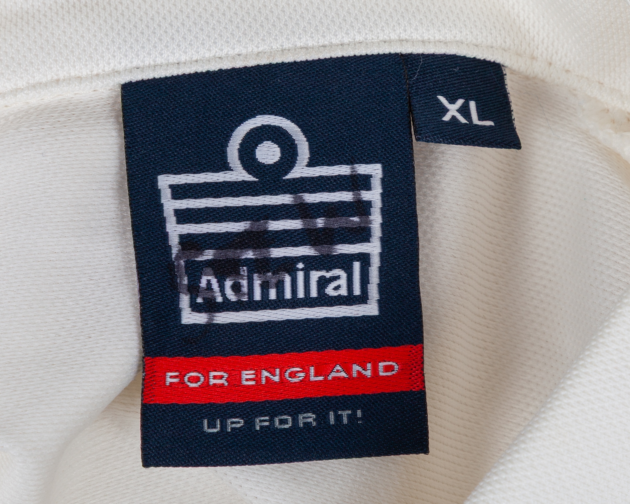 Alec Stewart England v. India Test series cricket white short-sleeved shirt, 2002, Admiral, XL, with button-up collar and embroidered badge, with 543 decal, the right sleeve with AS decal, with ECB especially manufactured for the players label on the lower front, the collar tag appears to have Stew written in ink