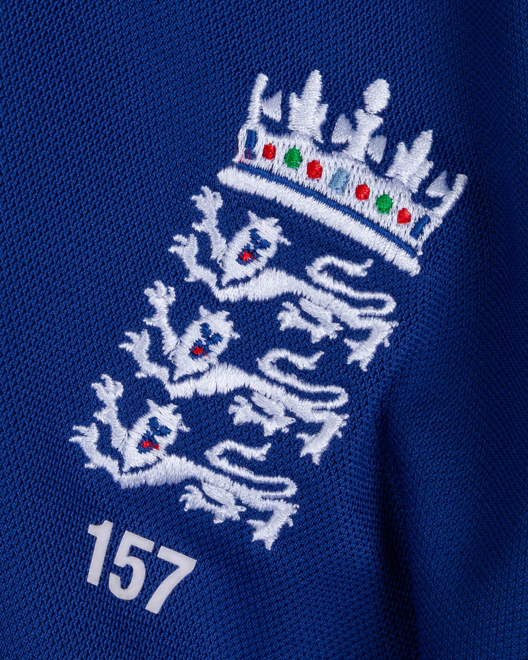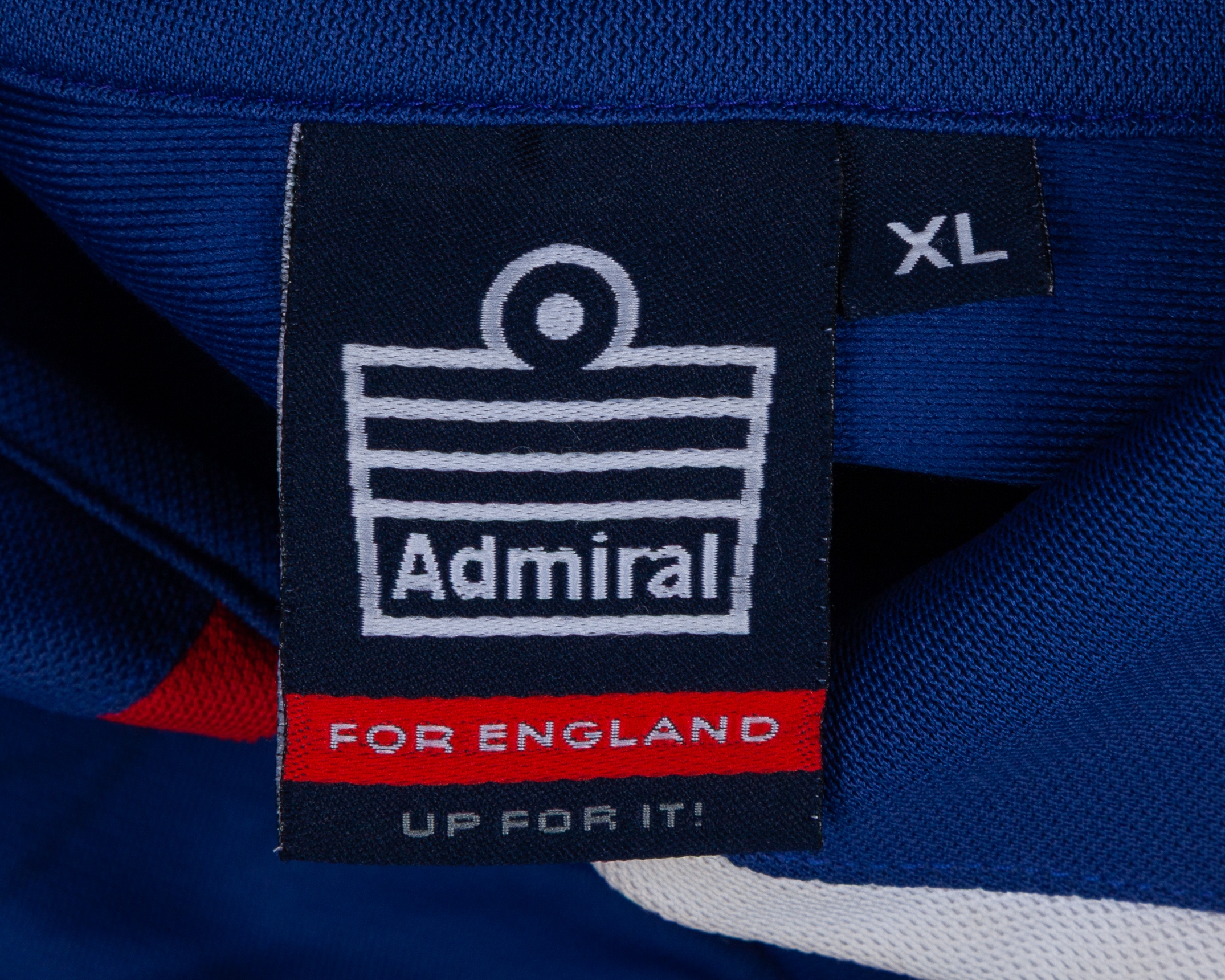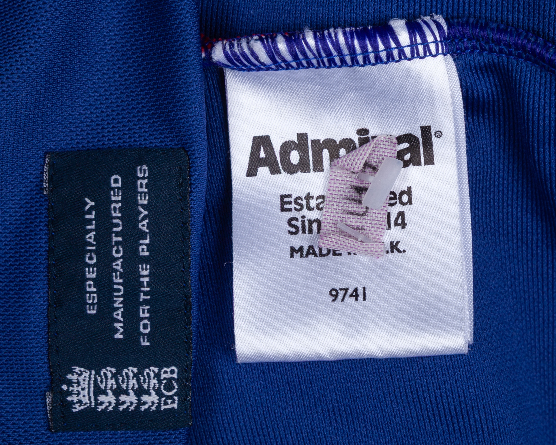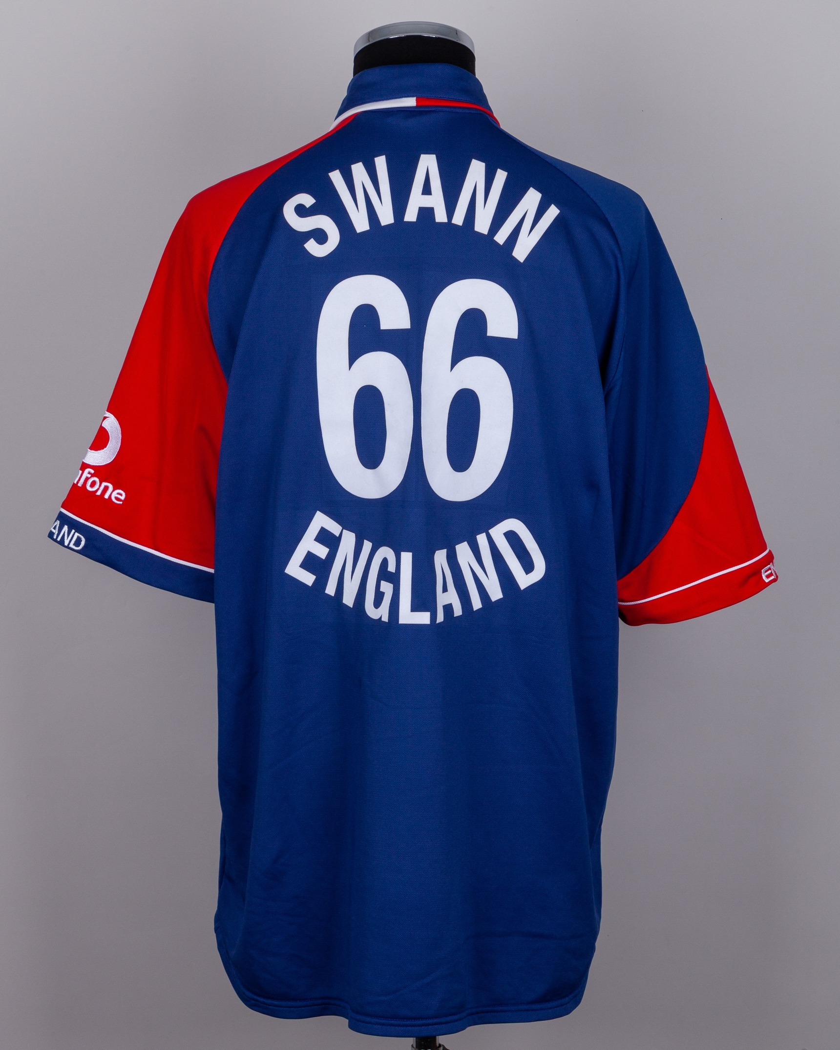 Graeme Swann blue and red England v. Sri Lanka ODI series autographed short-sleeved shirt, 2007, Admiral, XL, with button-up collar and embroidered badge, with 157 decal and ECB especially manufactured for the players label, the reverse lettered SWANN, with thirteen autographs, faded