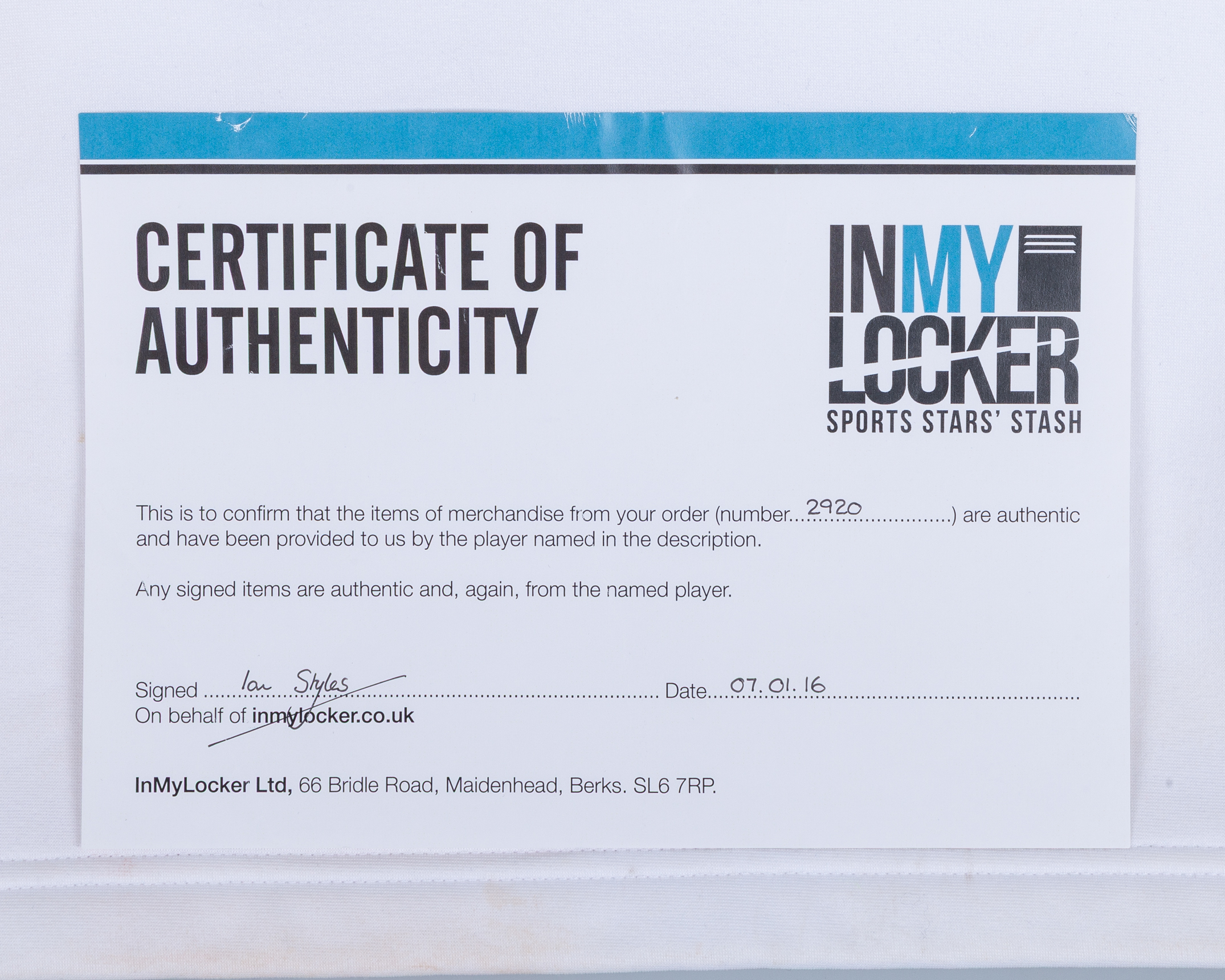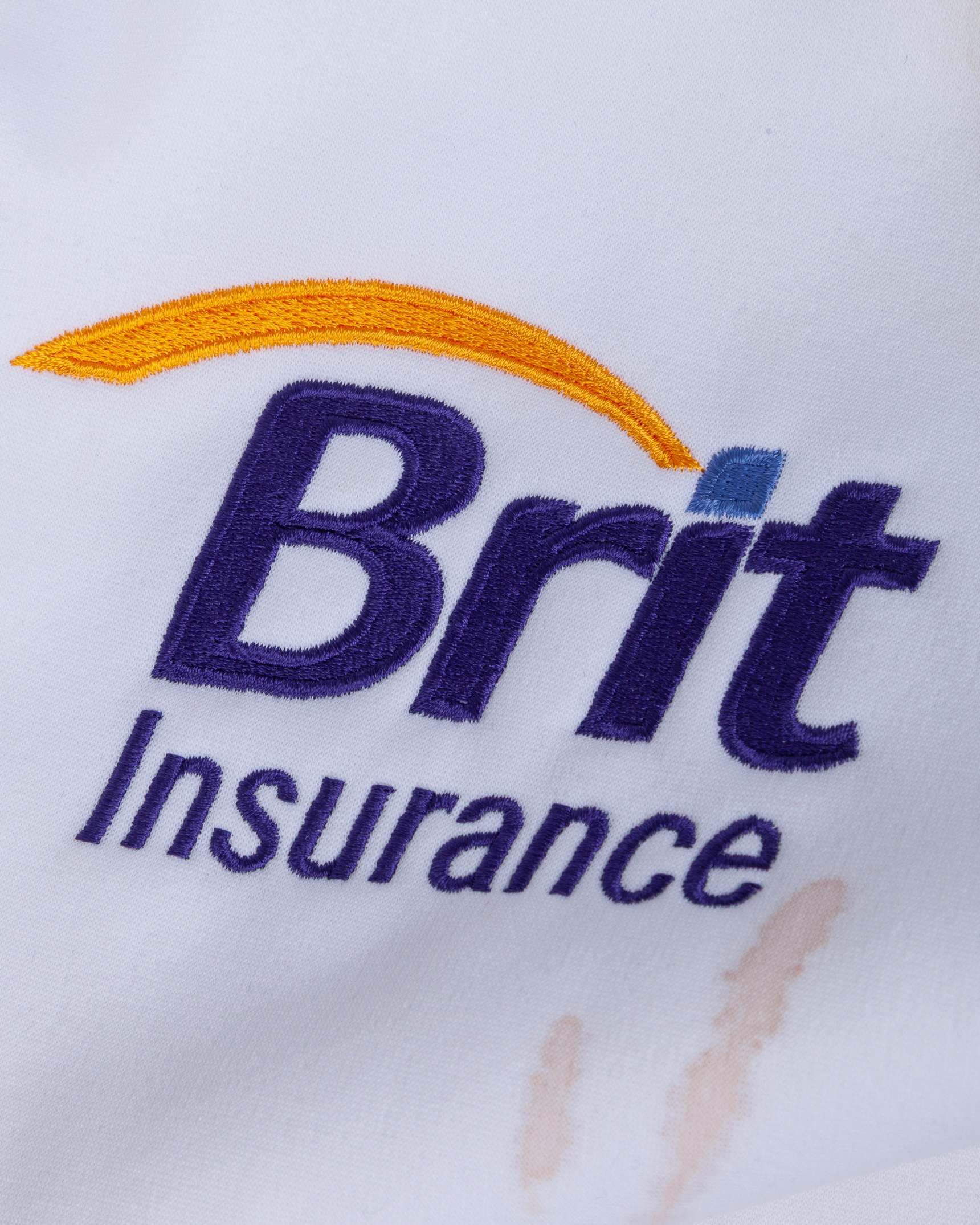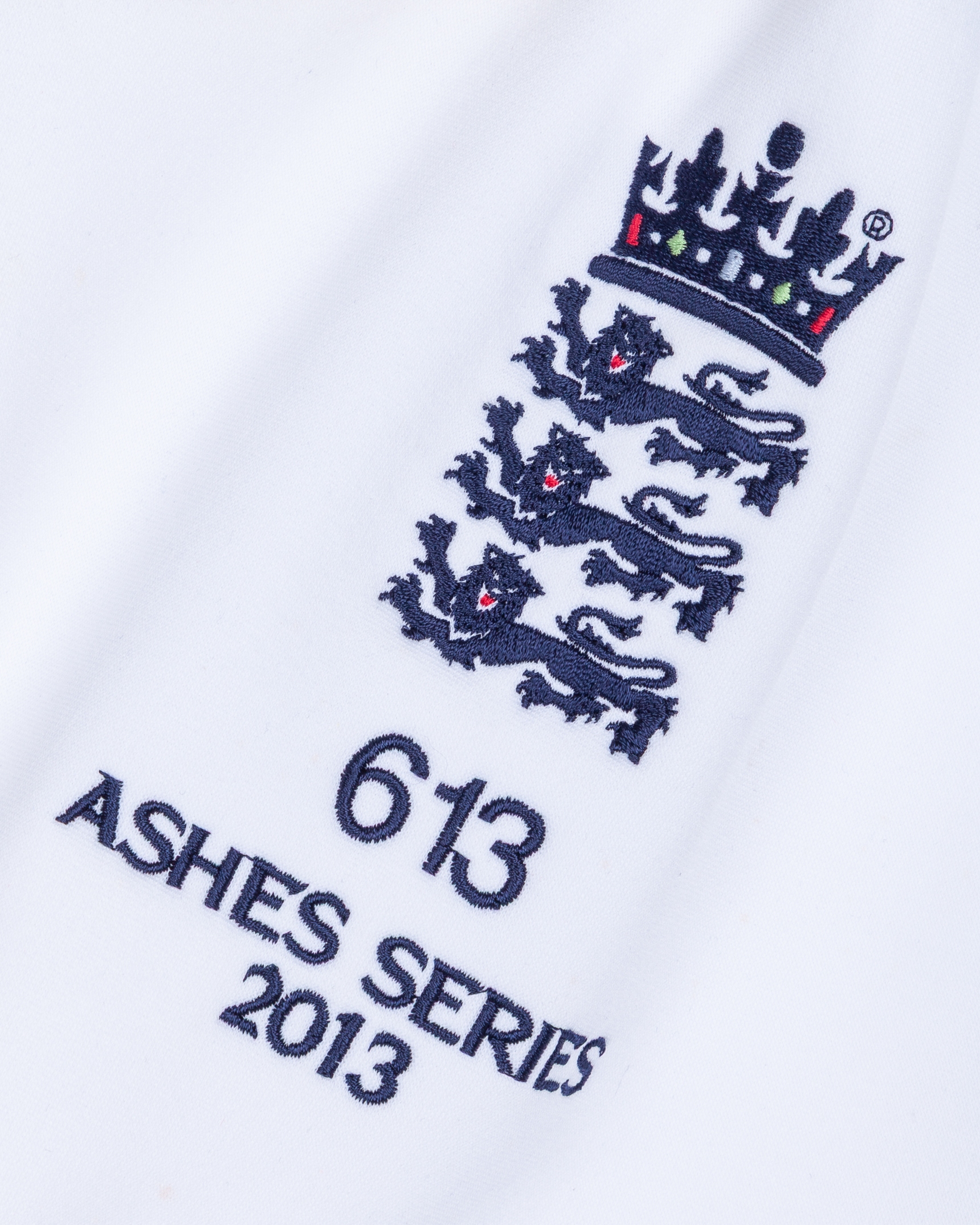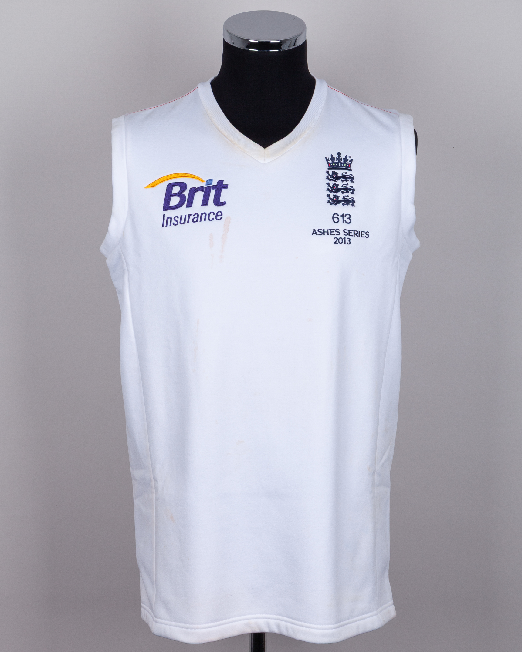 James Anderson England v. Australia Ashes series white sleeveless jumper, 2013, Adidas, 40/42, with v-neck collar and embroidered badge inscribed 613 ASHES SERIES 2013, with COA, with staining and discolouration
